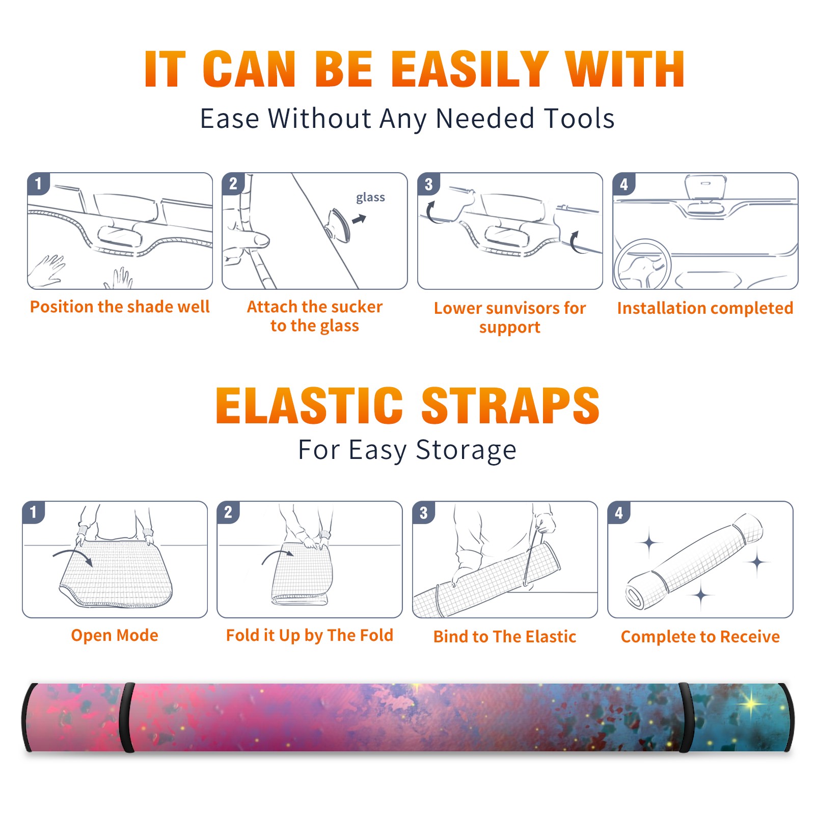 • Diameter /Size 63"L x 33.5"W</b><br> Made from excellent materials which makes it sturdy and protects the car from the sun. Easy to use and pack. Makes the interior of the car cooler.You can easily stash the sunshade in the storage bag or store long term.It open and closes easy. Also the leather storage bag is durable and easy to put the umbrella back into.This windshield sunshade provides complete coverage and keeps your car interior cool under direct sun. It is easy to open and position under the windshield and around the rear-view mirror. Makes Your Car Easy To Identify, Perfect For Finding Your Car In Crowded Parking Lots And Garages.Great Choice: It Is A Great Gift For Dad, Boyfriend, Brother, Brother And Uncle, Friends, Classmates, Family And So On.<br> Notice:</b><br> Due To Difference Computer Monitors, The Color Maybe Slightly Different From Picture. As Different Measurement Methods, Measurement Data Will Float Within 2%.I Hope You Understand.<br> If You Have Any Question About The Item Please Do Not Hesitate To Contact Us Immediately And We Will Give You A Satisfactory Reply Within 24 Hours.
