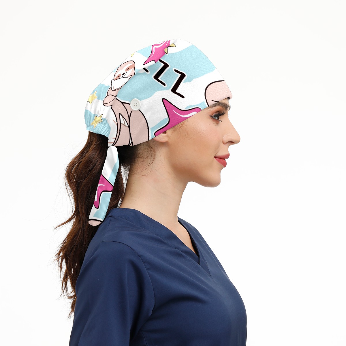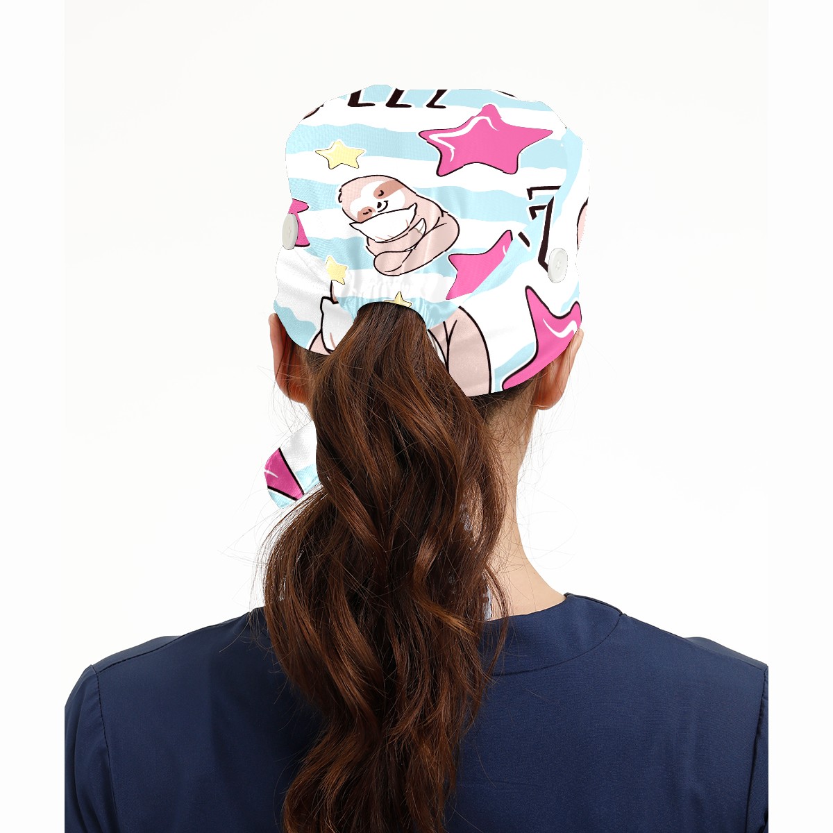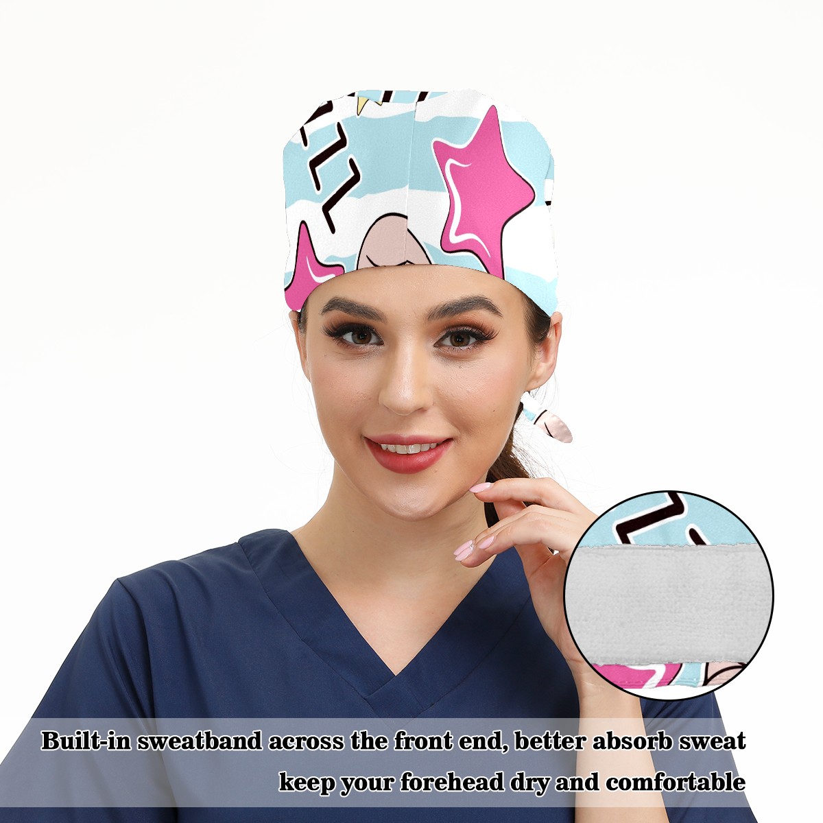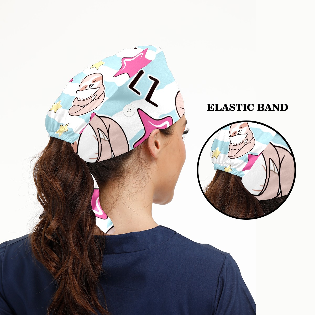 Working Caps with Button & Sweatband Satin Lined Cotton Adjustable Nurse Hats Elastic Band Scrub Cap Surgeon Hat Cute Sloth Star