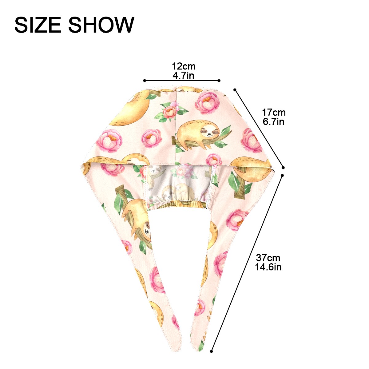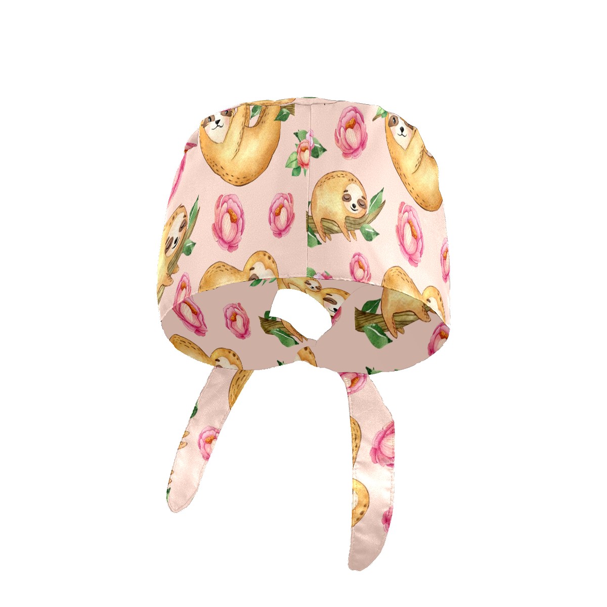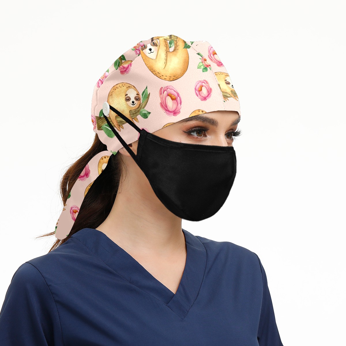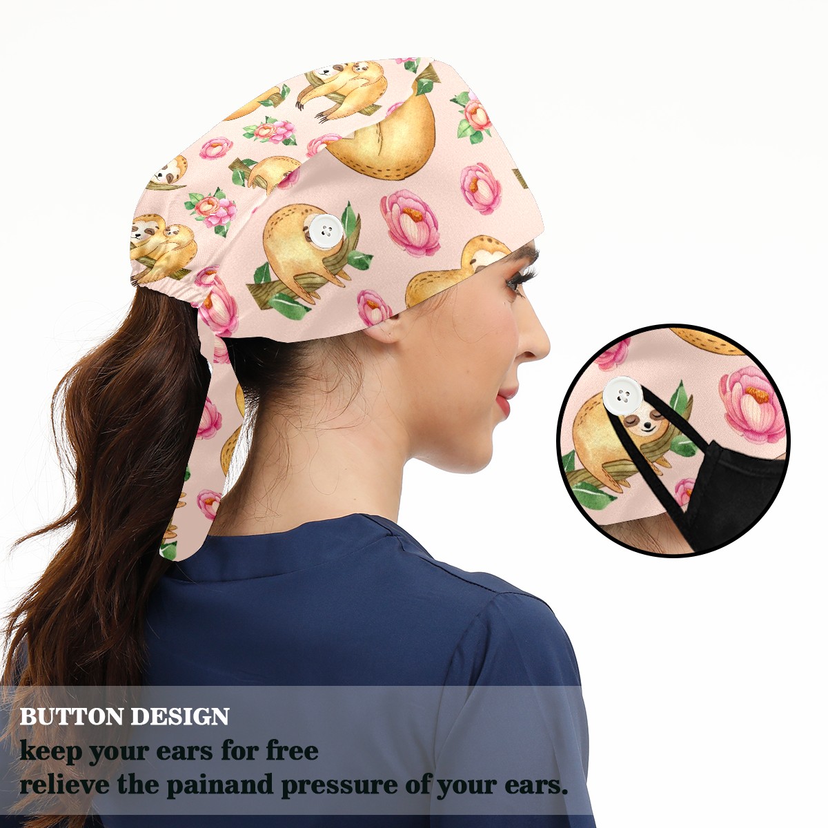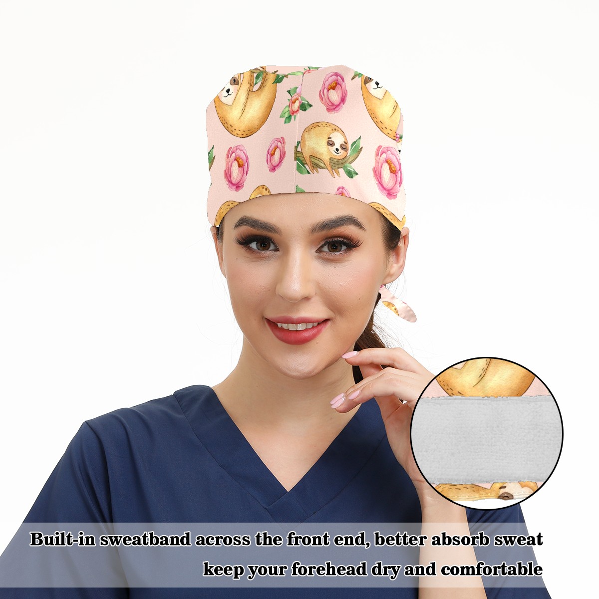 Working Caps with Button & Sweatband Satin Lined Cotton Adjustable Nurse Hats Elastic Band Scrub Cap Surgeon Hat Cute Sloth Flower