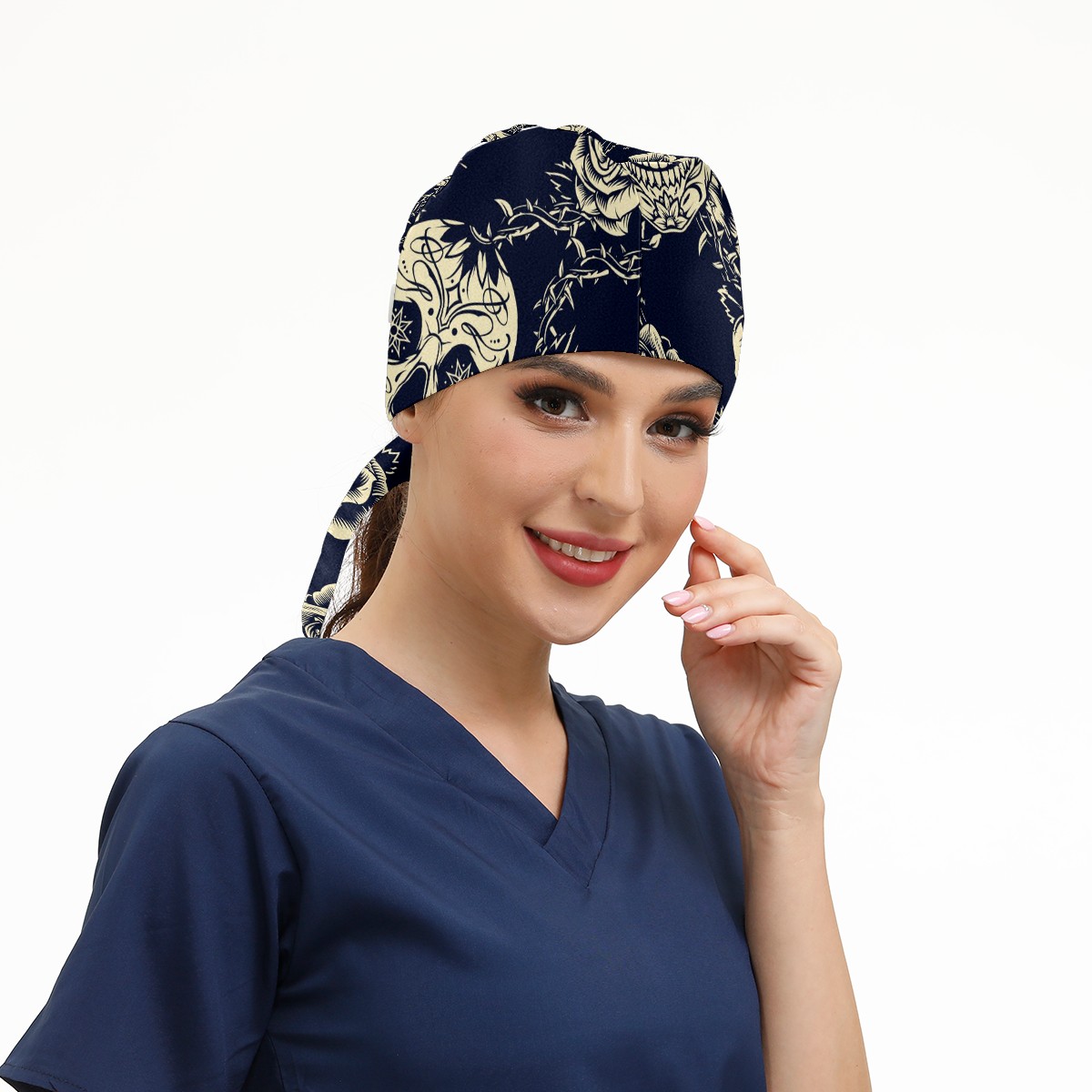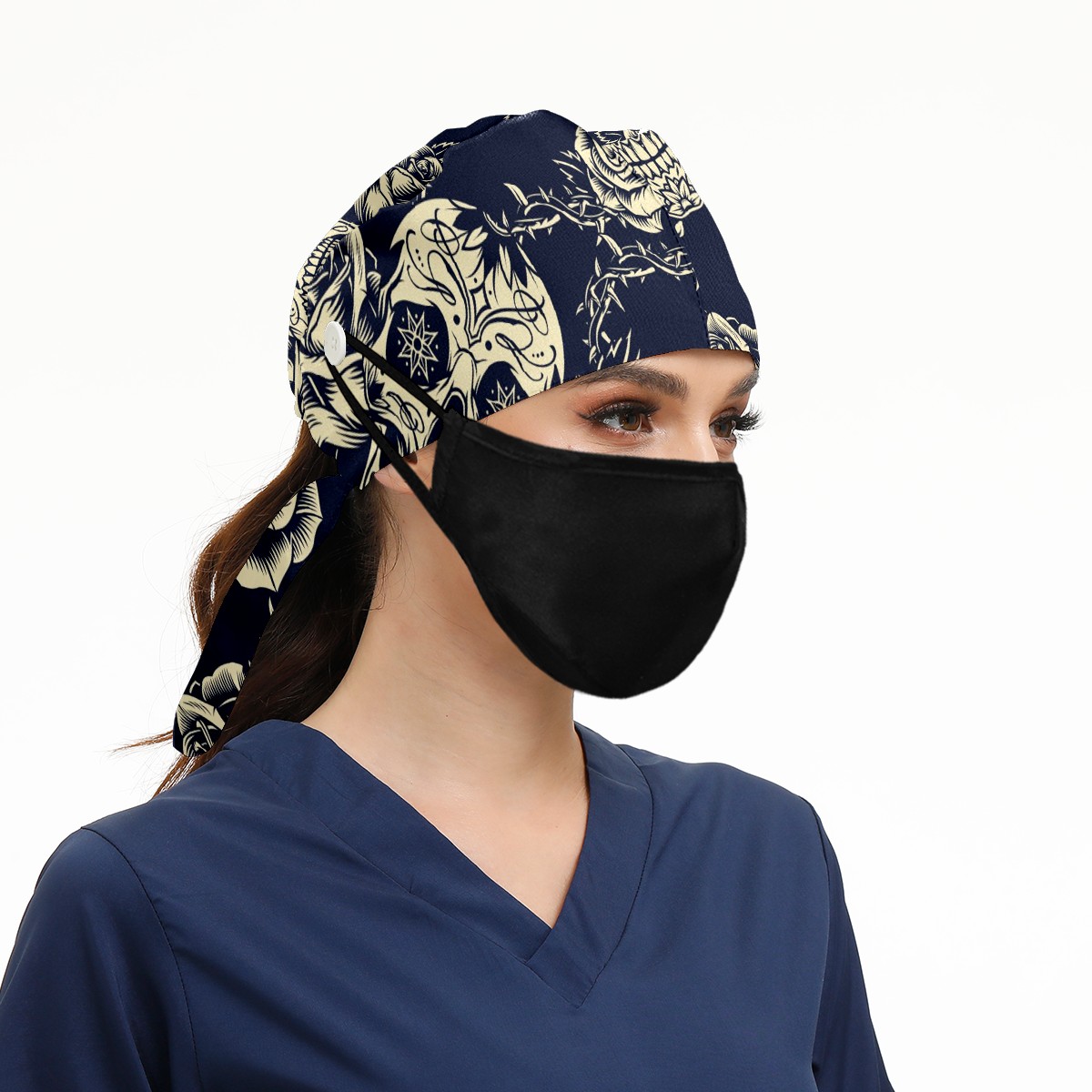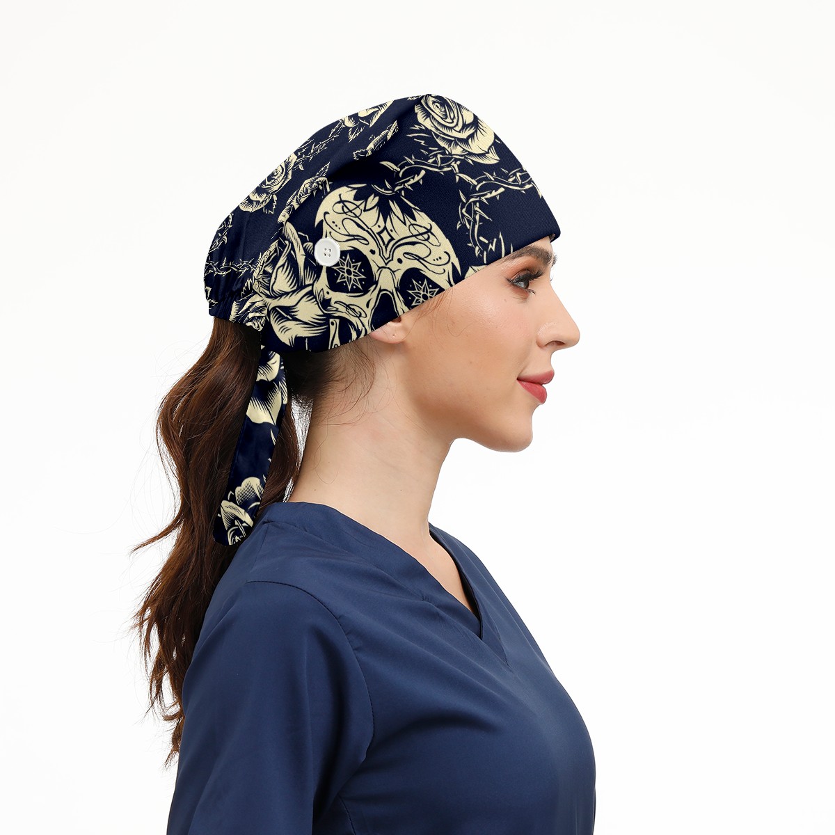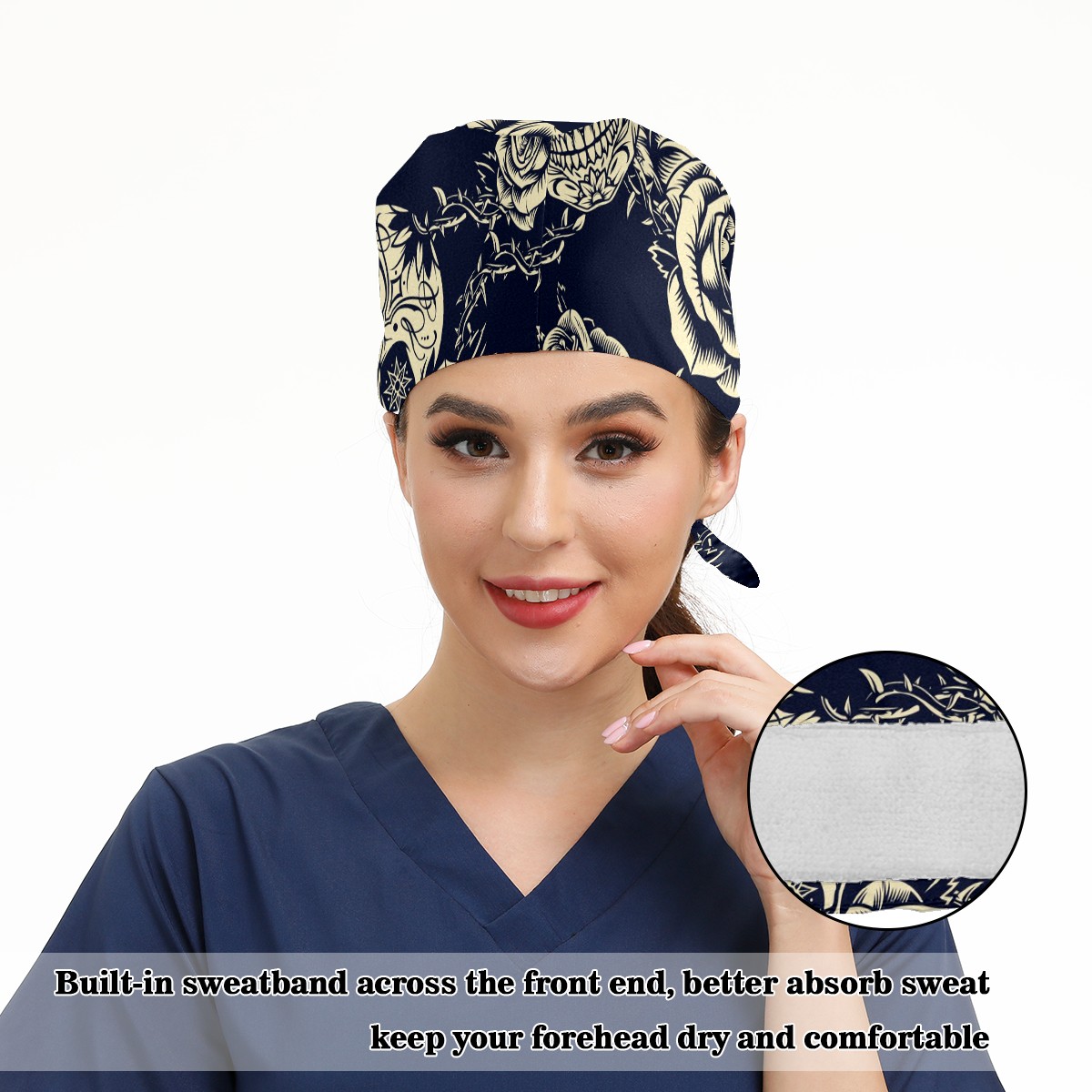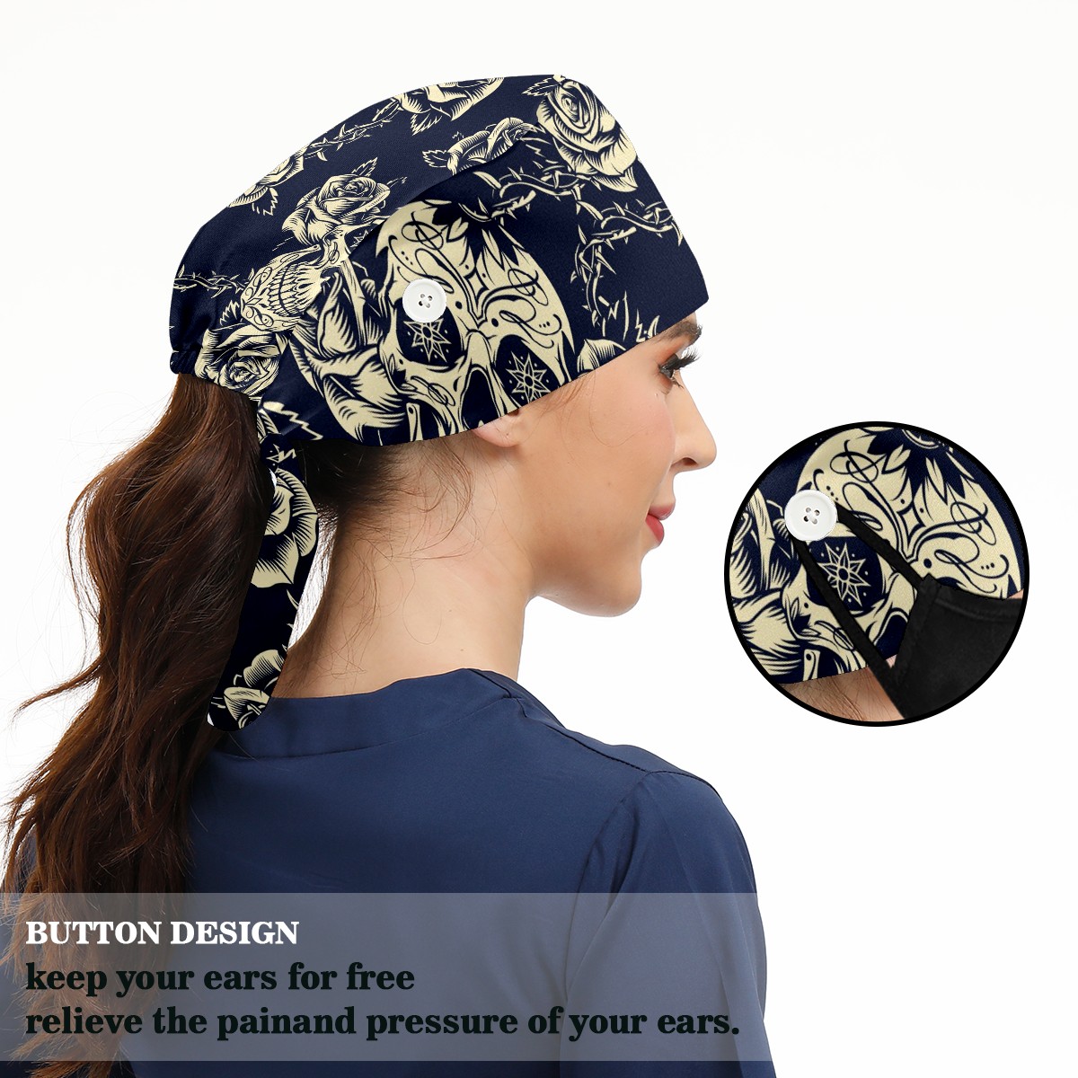 Working Caps with Button & Sweatband Satin Lined Cotton Adjustable Nurse Hats Elastic Band Scrub Cap Surgeon Hat Vintage Skulls Roses