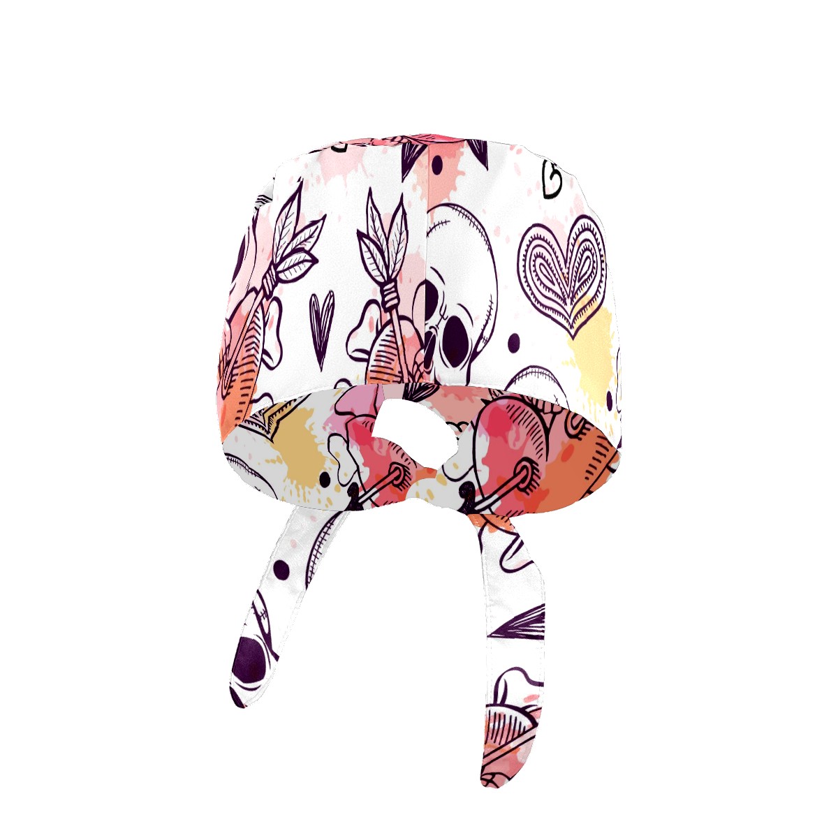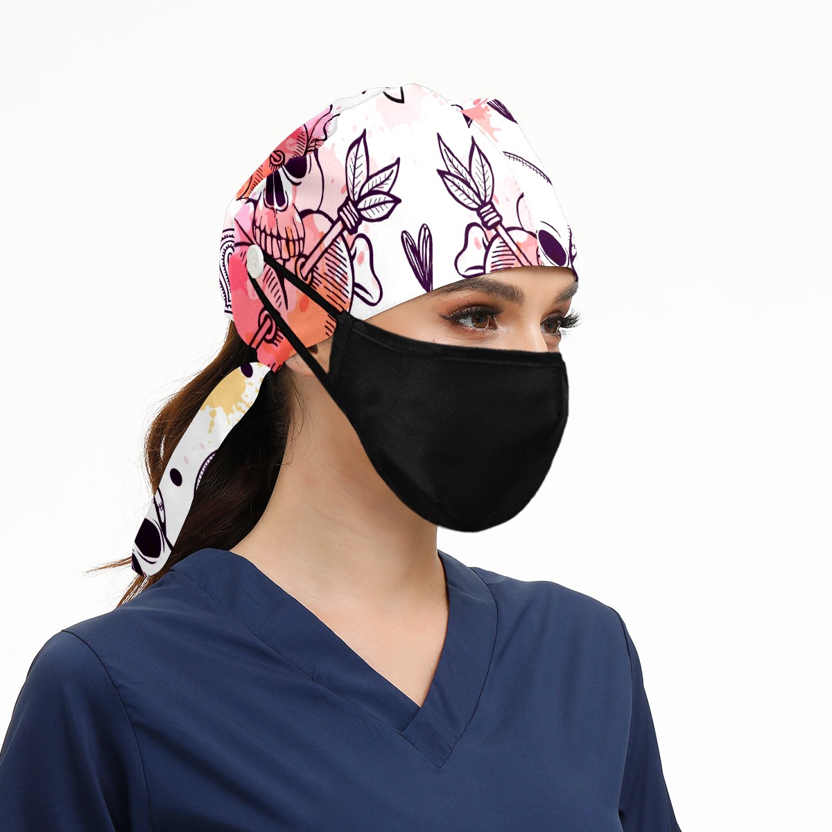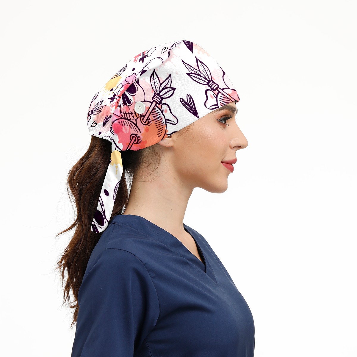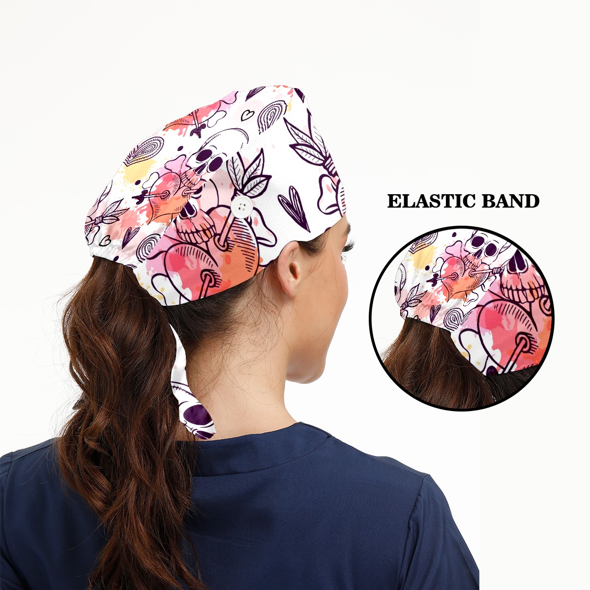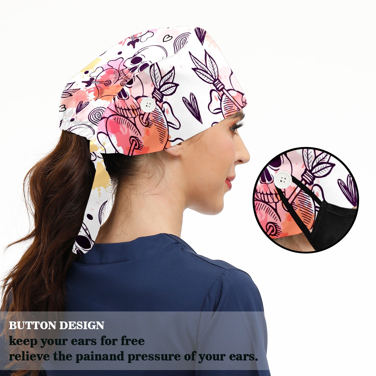 Working Caps with Button & Sweatband Satin Lined Cotton Adjustable Nurse Hats Elastic Band Scrub Cap Surgeon Hat Skull And Heart