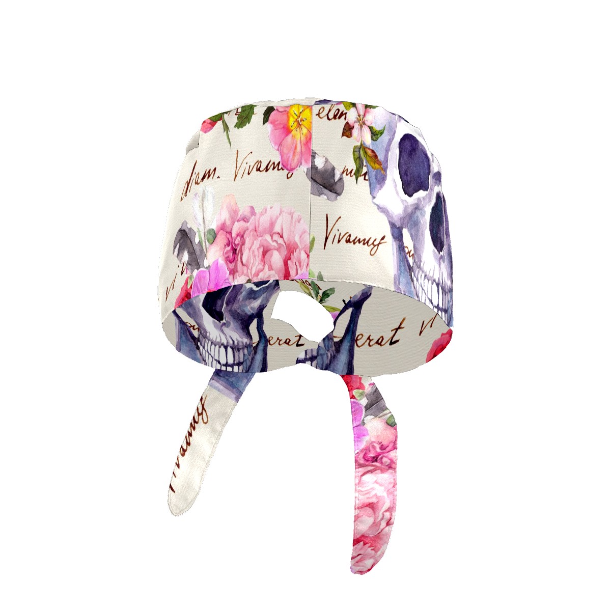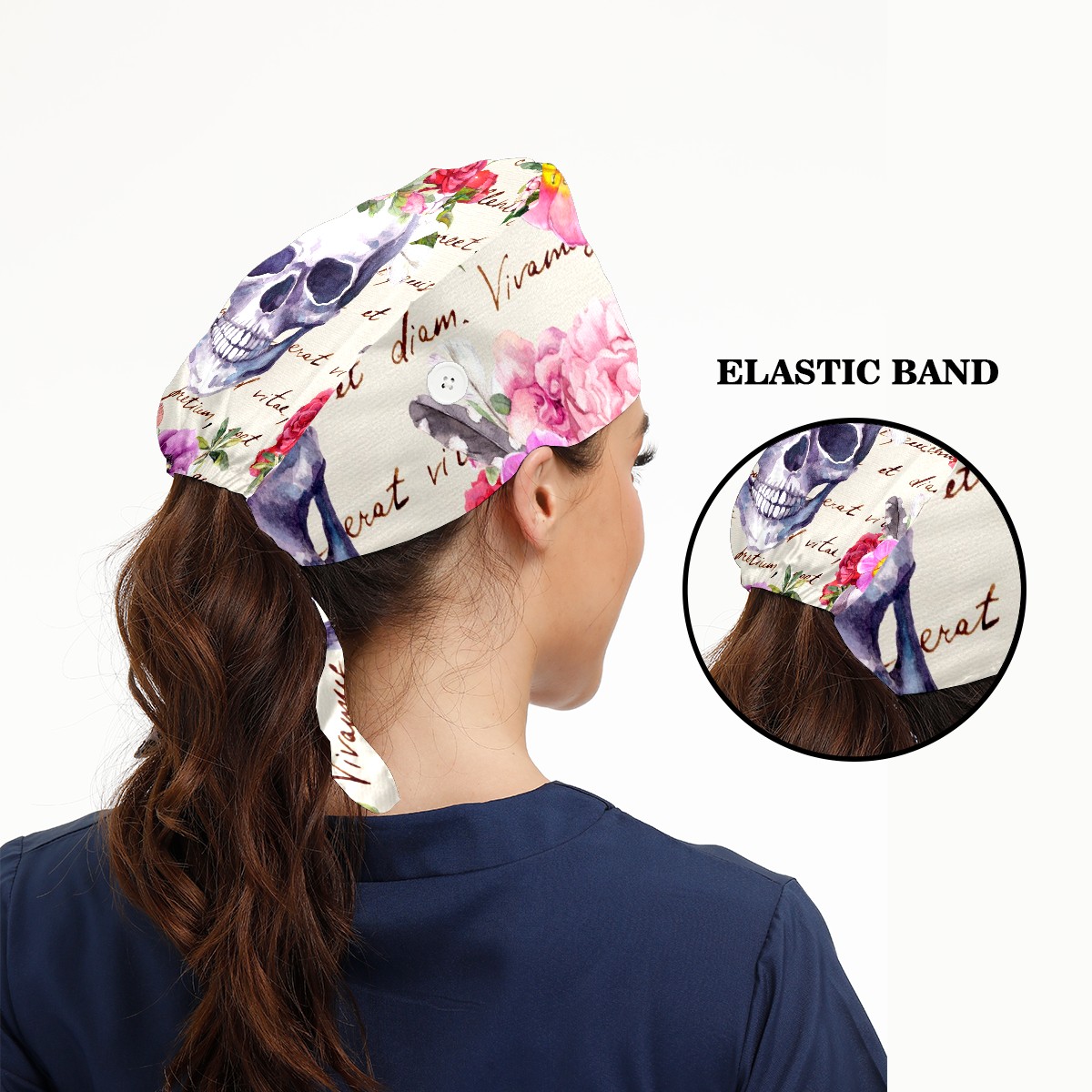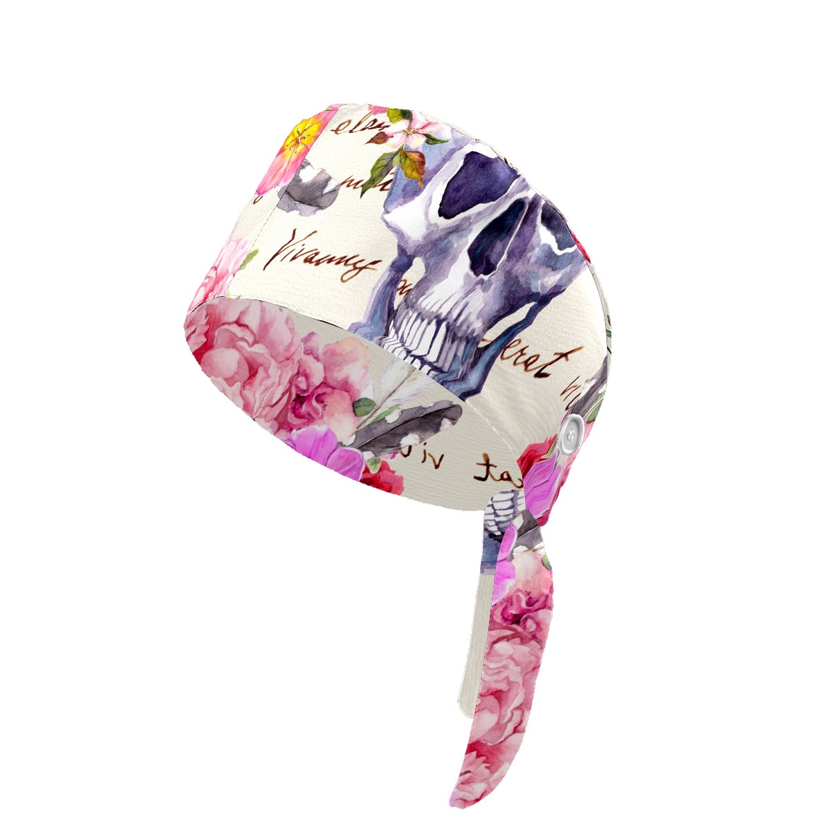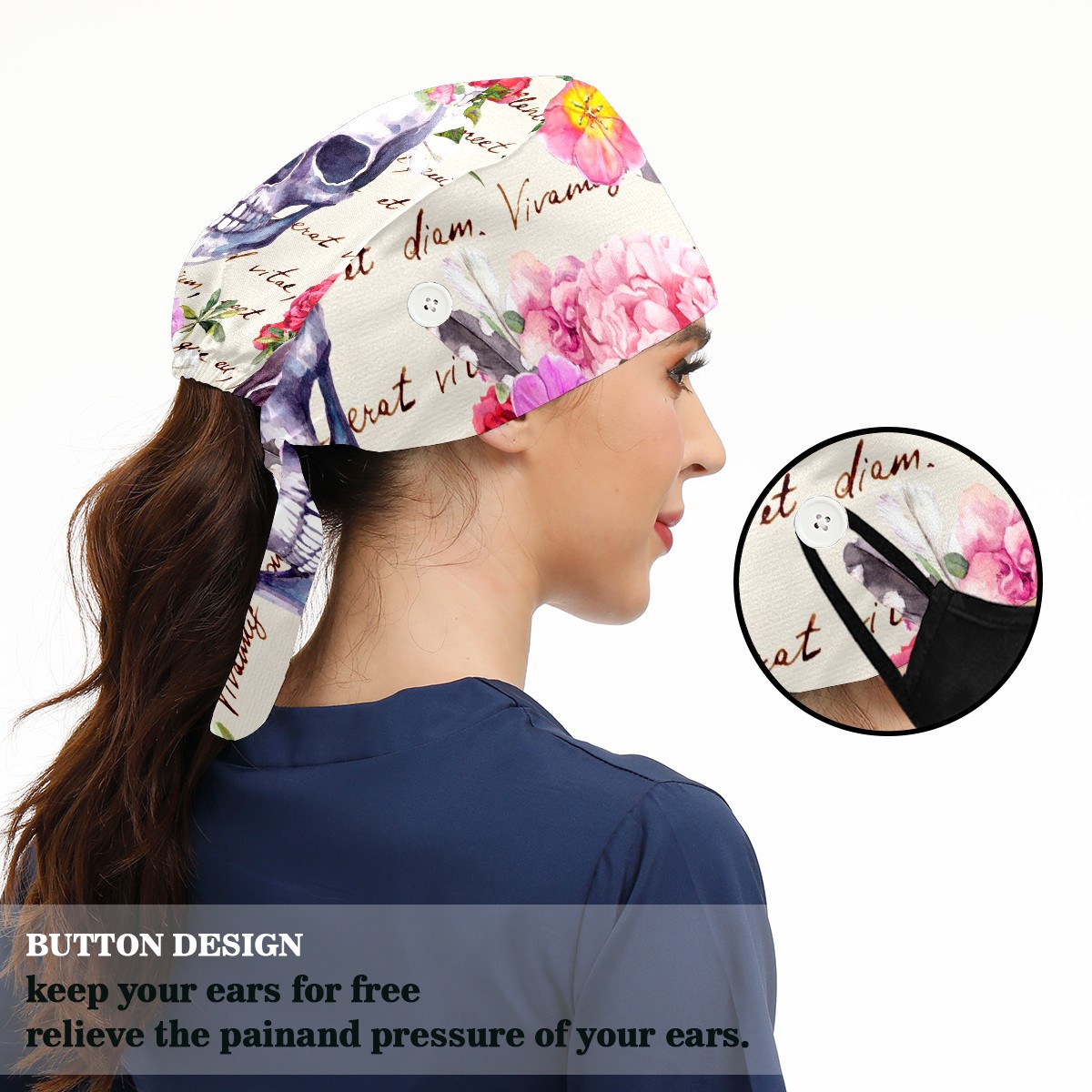 Working Caps with Button & Sweatband Satin Lined Cotton Adjustable Nurse Hats Elastic Band Scrub Cap Surgeon Hat Human Skulls With Flowers