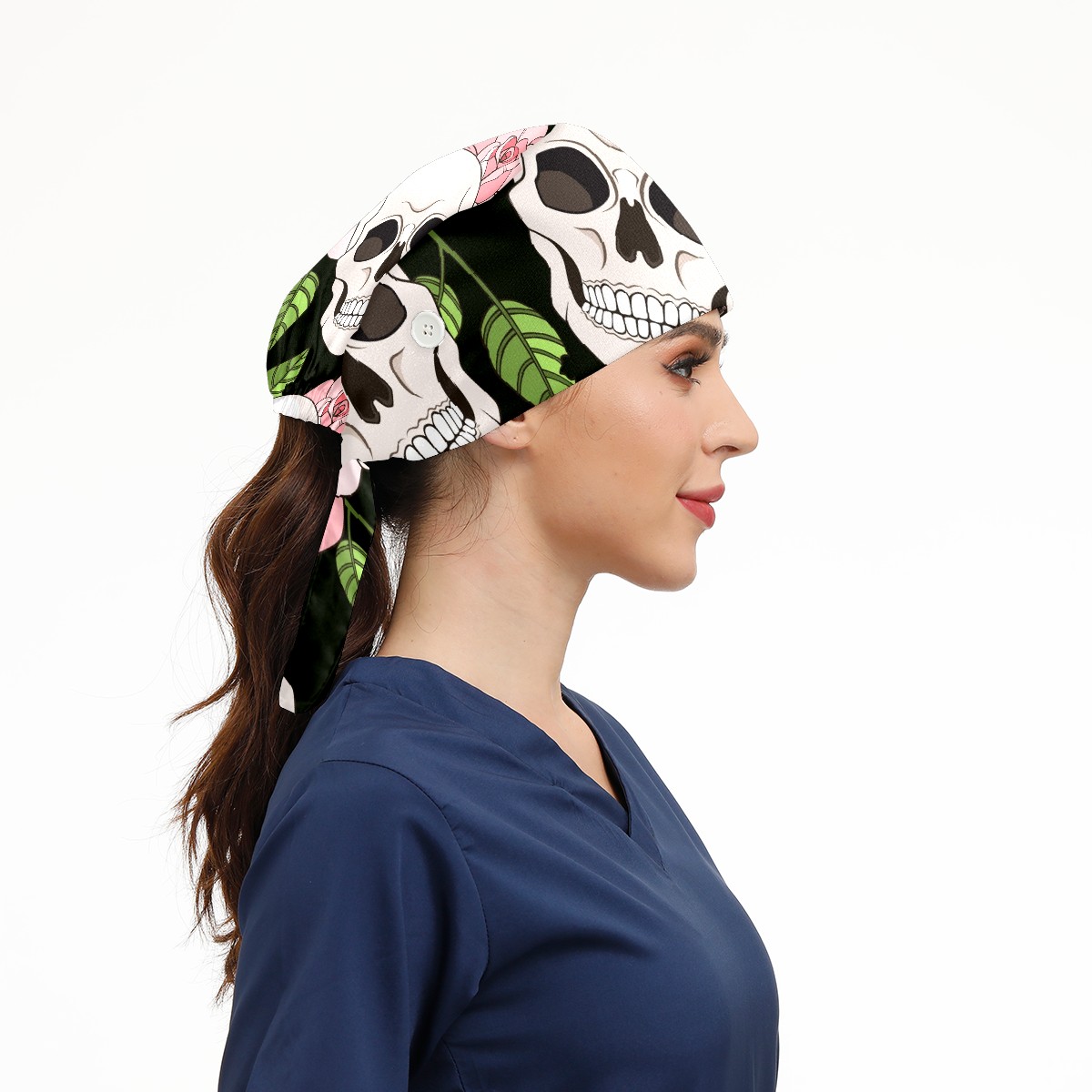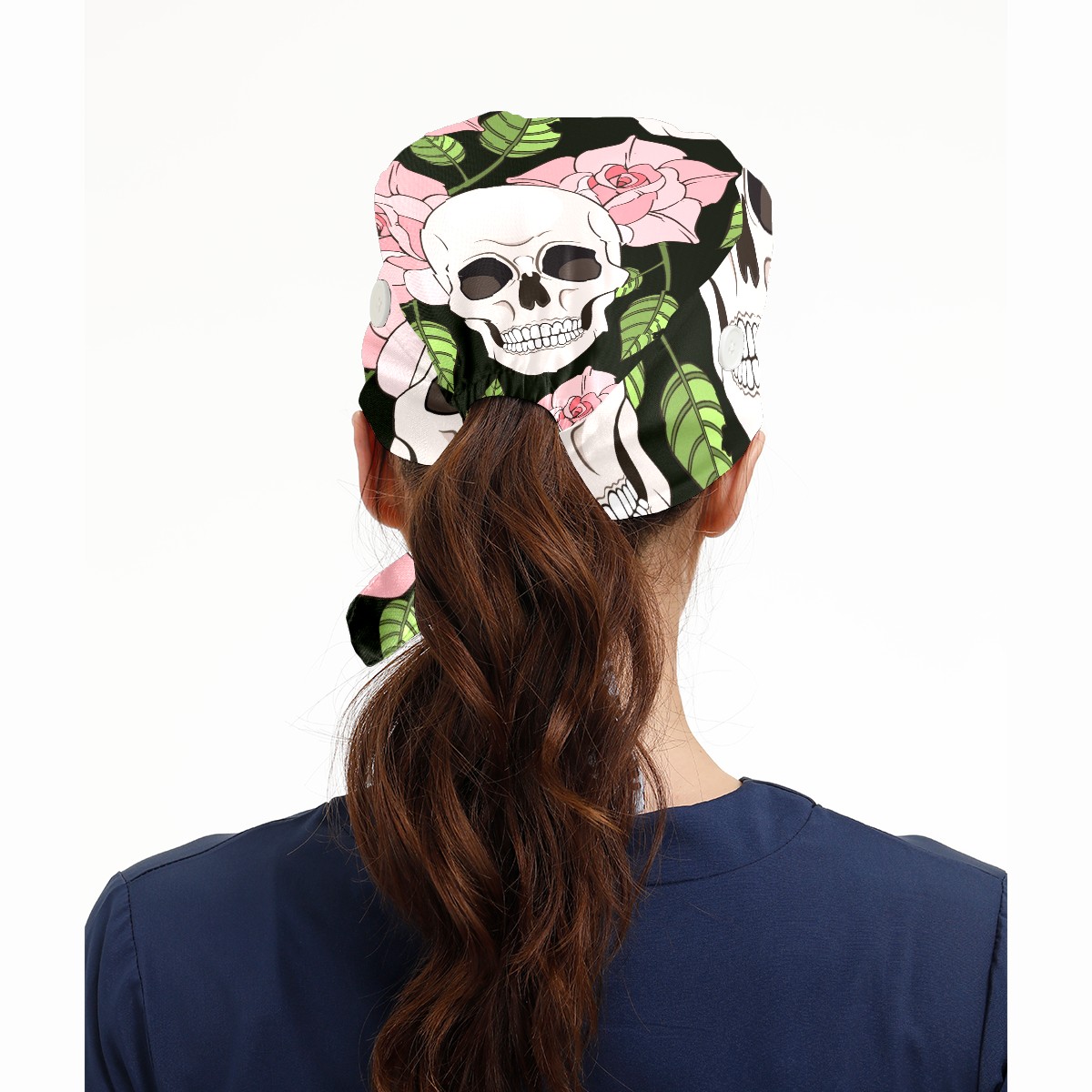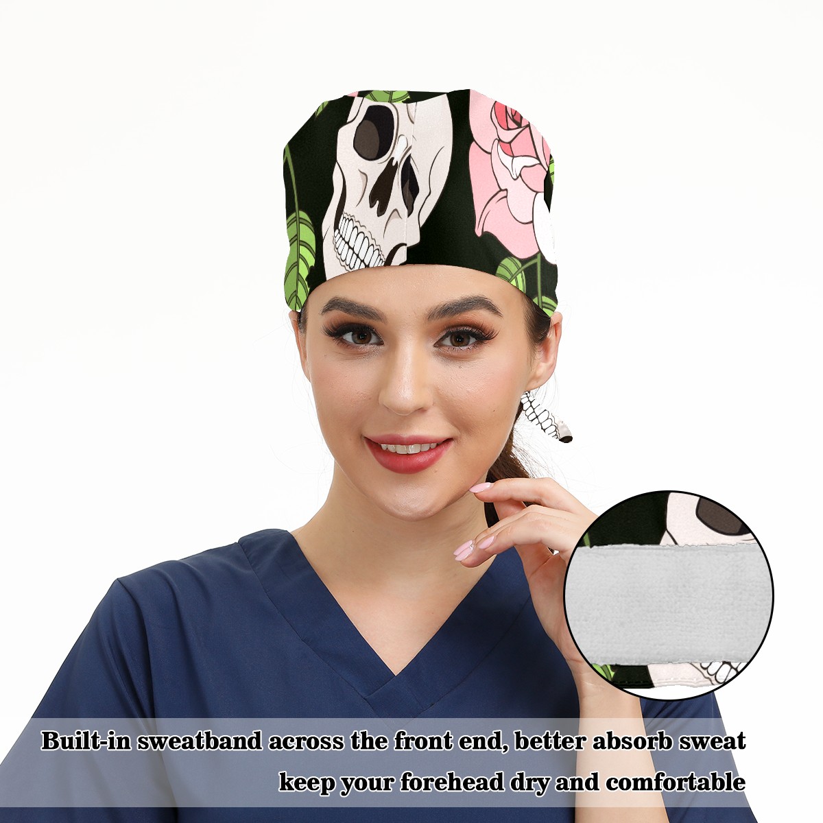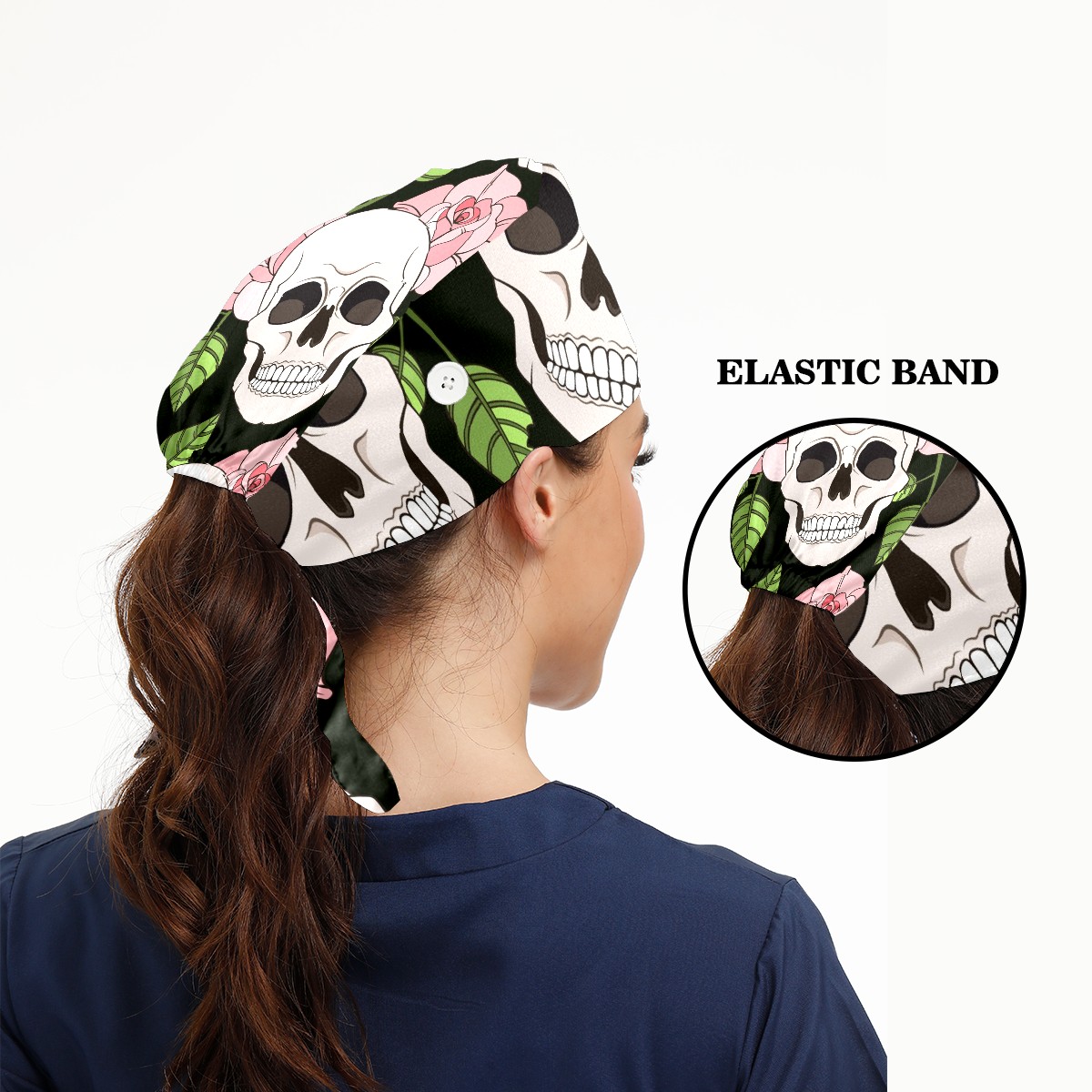 Working Caps with Button & Sweatband Satin Lined Cotton Adjustable Nurse Hats Elastic Band Scrub Cap Surgeon Hat Gothic Roses And Skulls