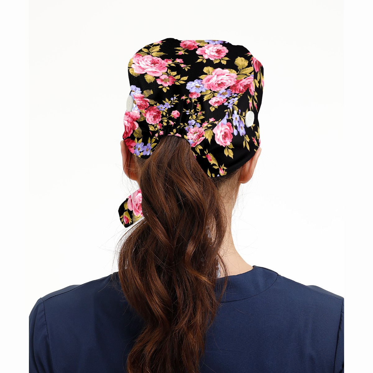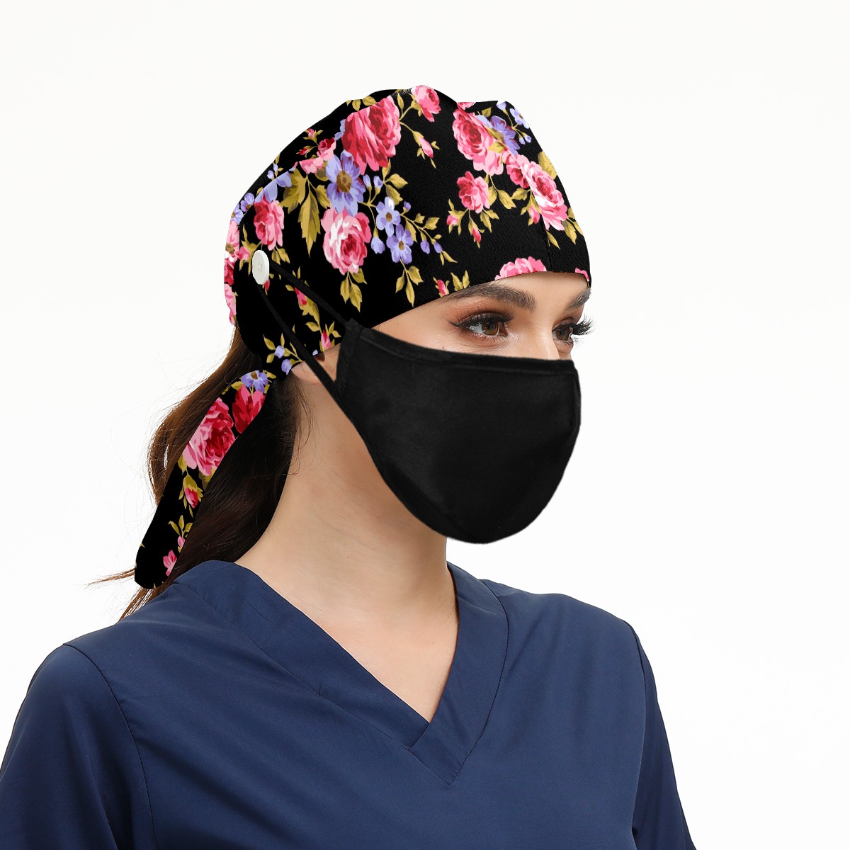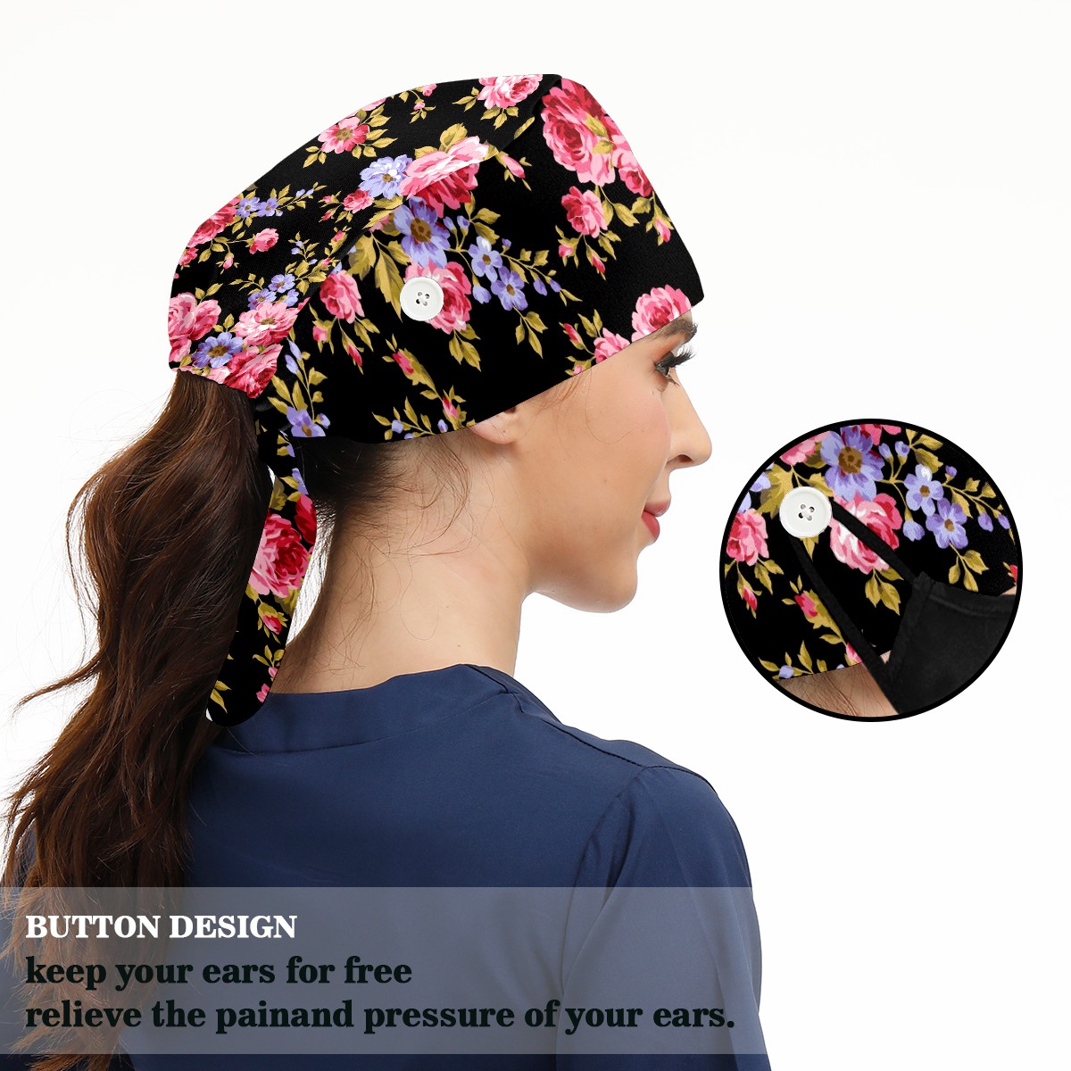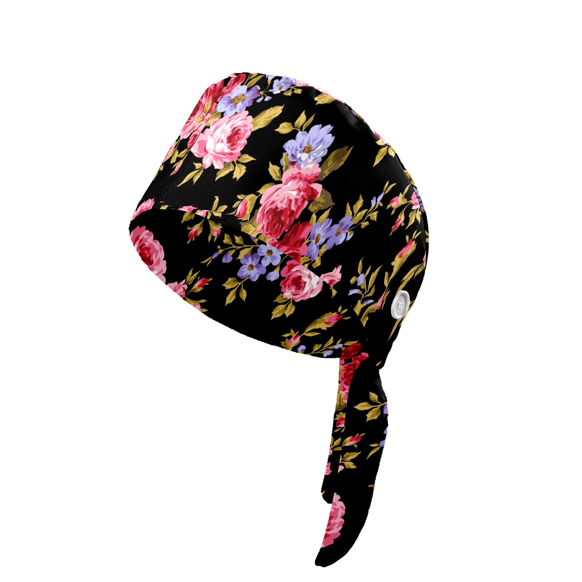 Working Caps with Button & Sweatband Satin Lined Cotton Adjustable Nurse Hats Elastic Band Scrub Cap Surgeon Hat Pink Red Roses Flower On Black Background