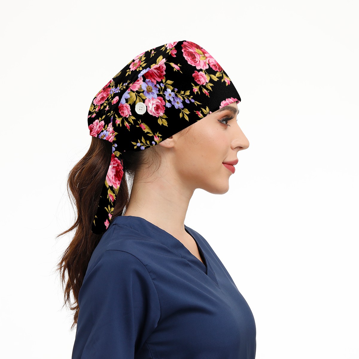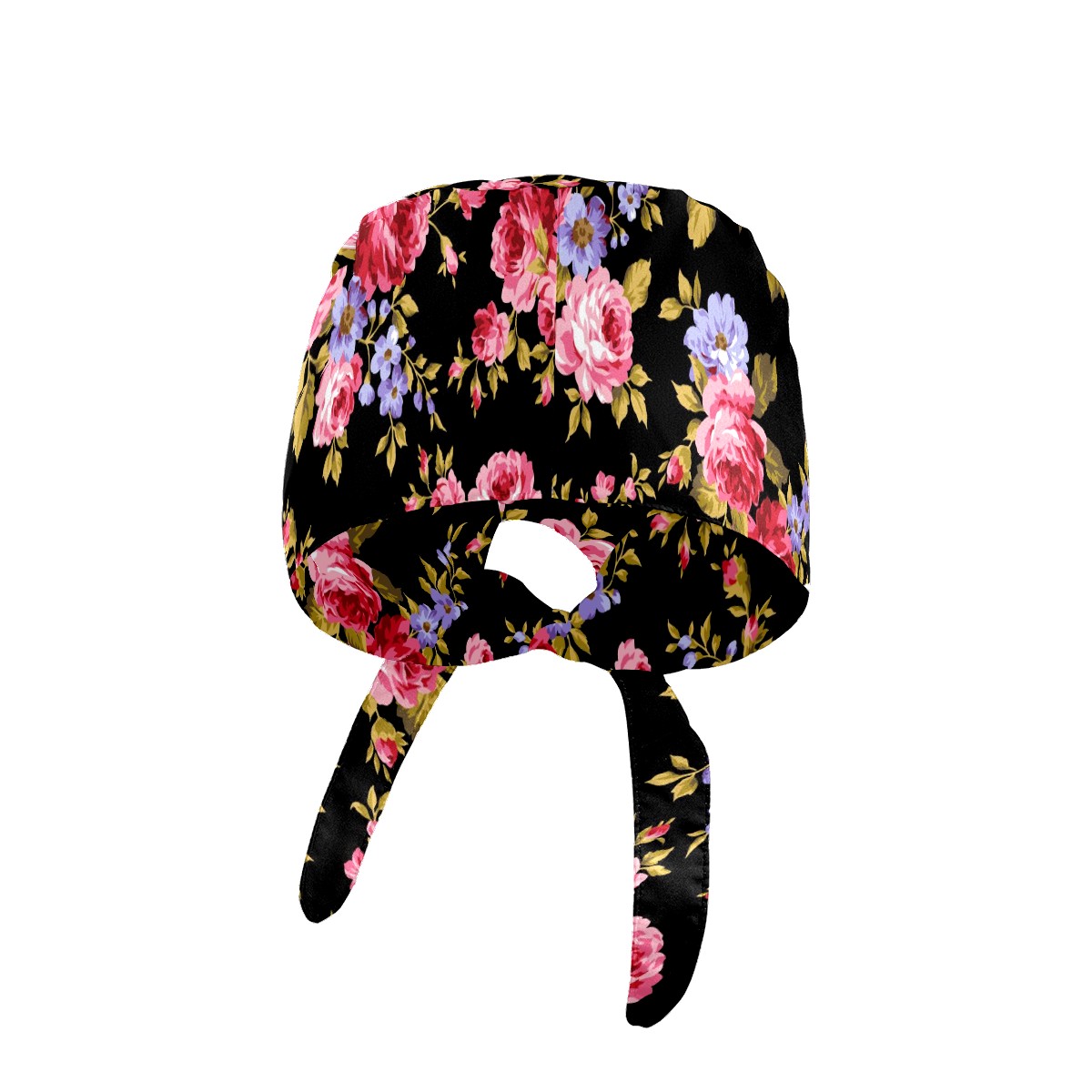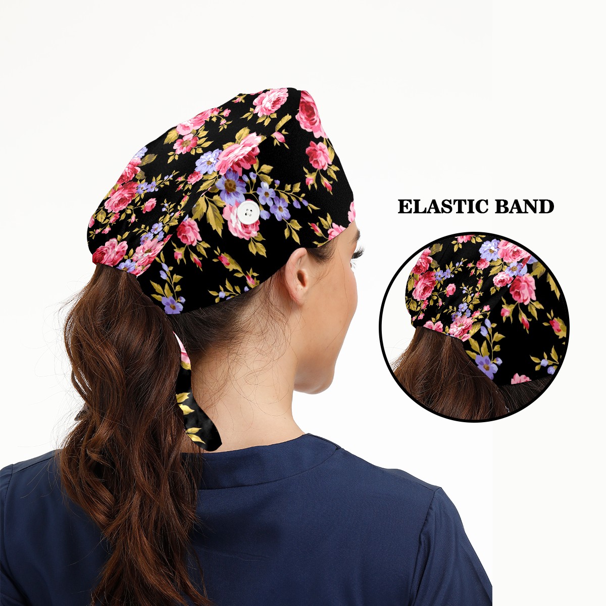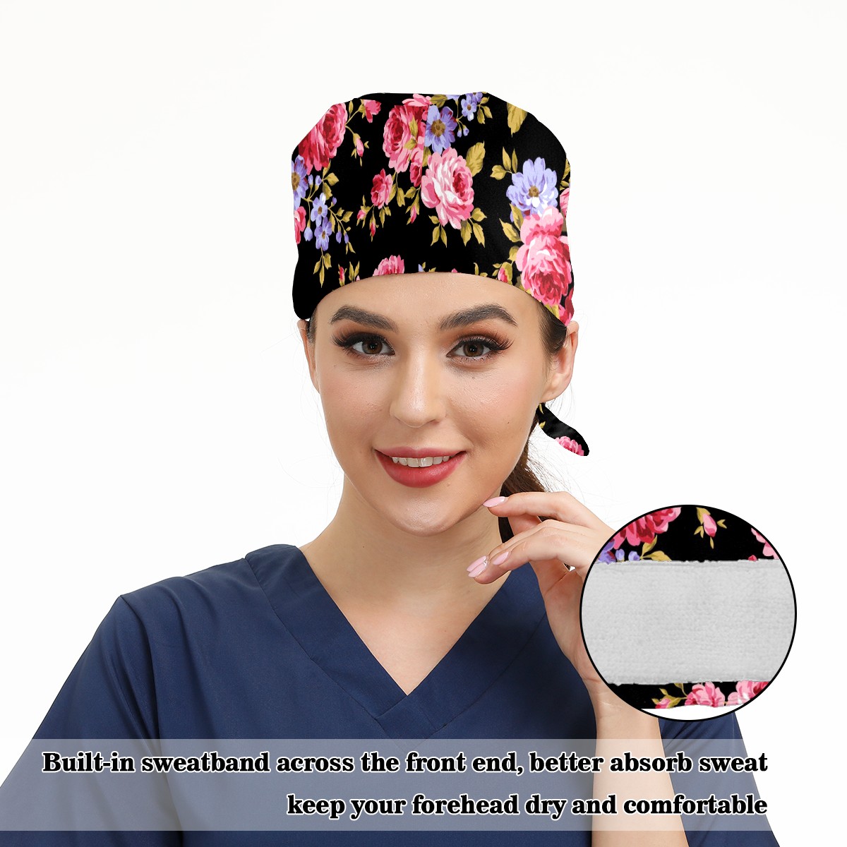 Working Caps with Button & Sweatband Satin Lined Cotton Adjustable Nurse Hats Elastic Band Scrub Cap Surgeon Hat Pink Red Roses Flower On Black Background