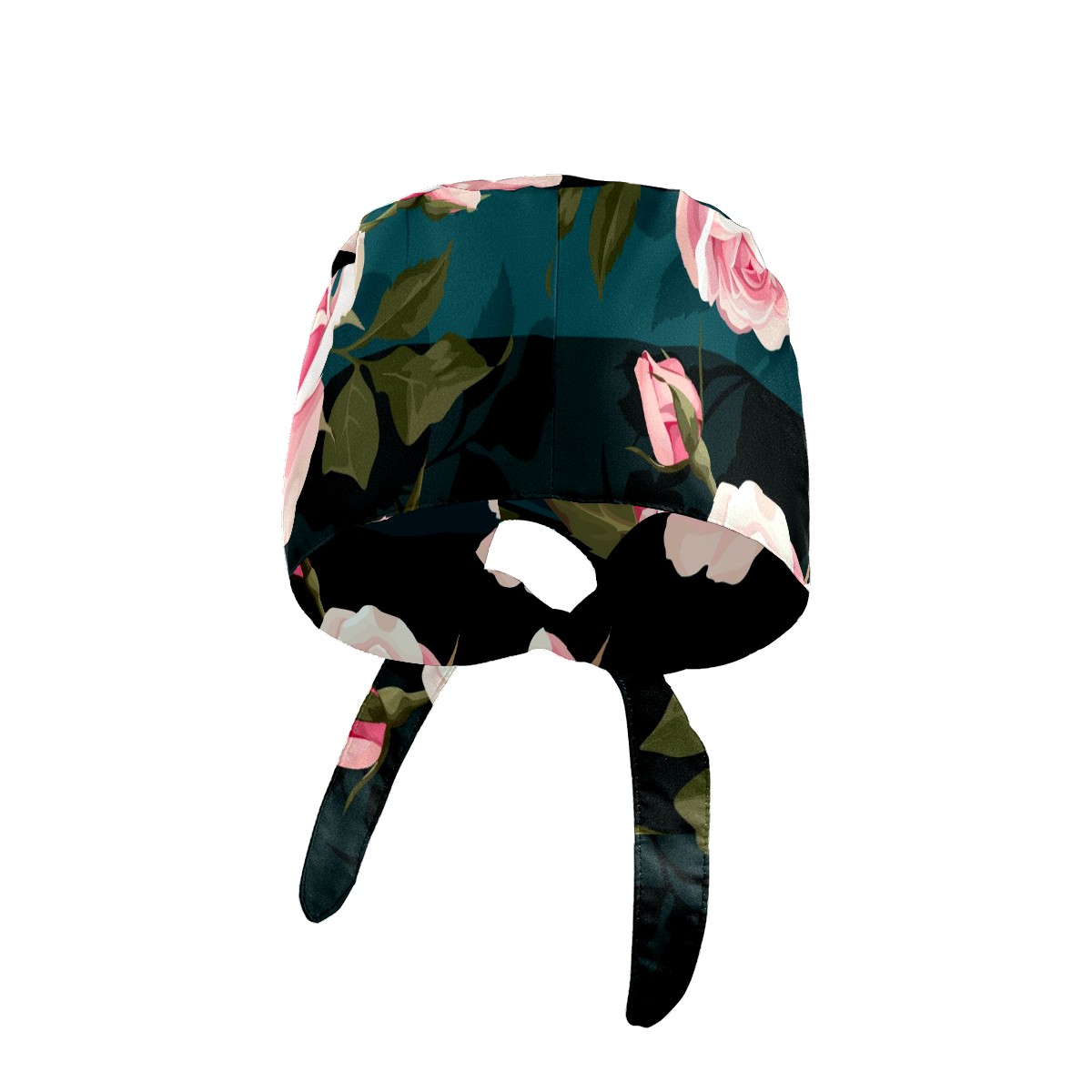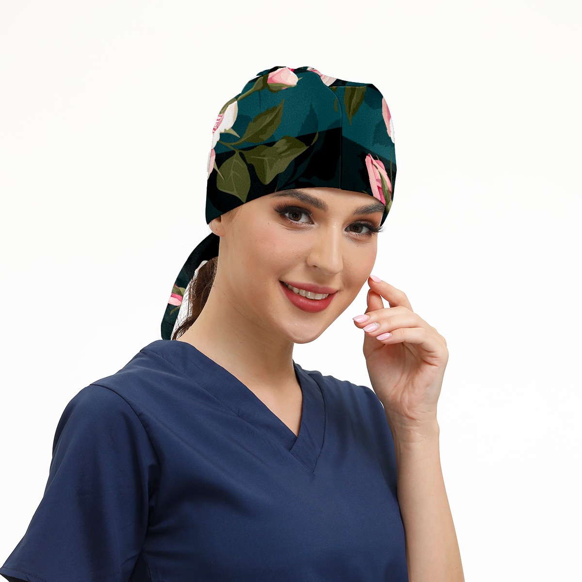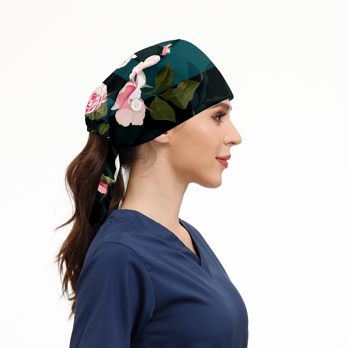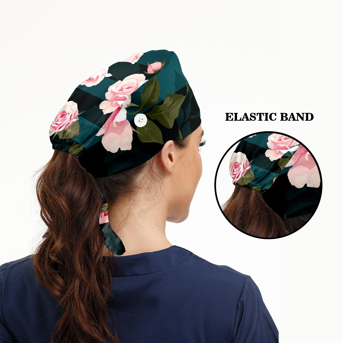 Working Caps with Button & Sweatband Satin Lined Cotton Adjustable Nurse Hats Elastic Band Scrub Cap Surgeon Hat Pink Rose Flower On Stripe Background