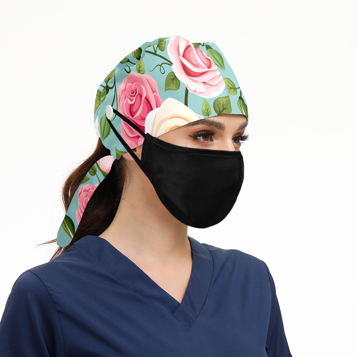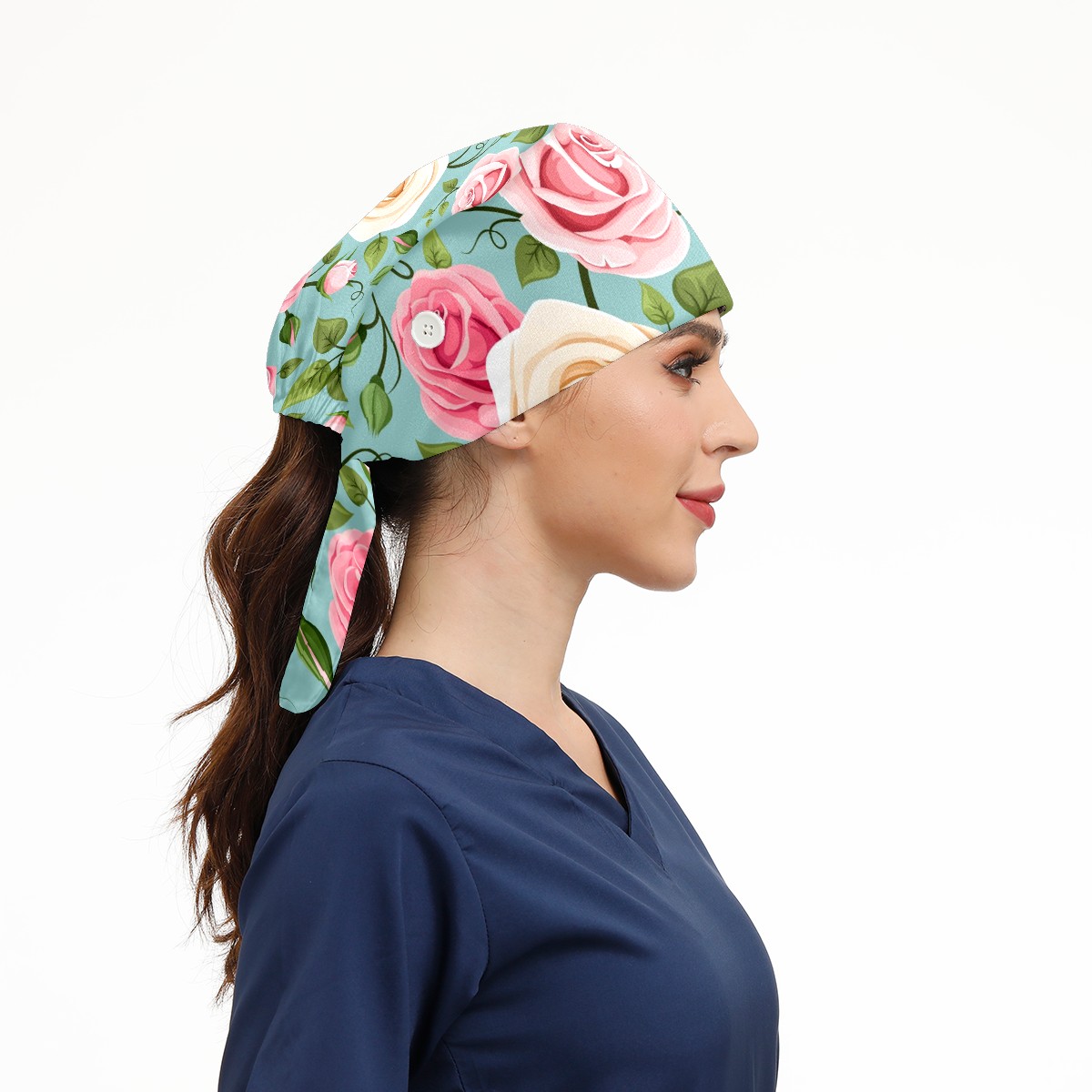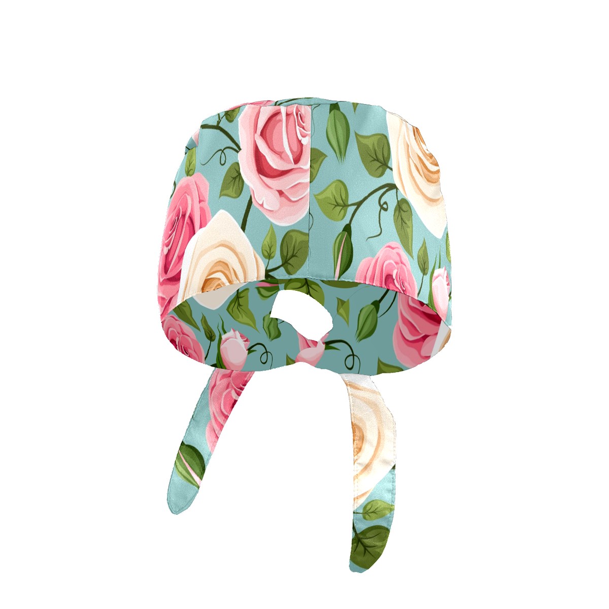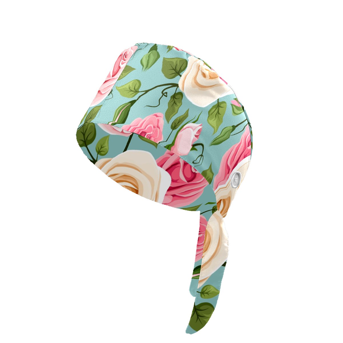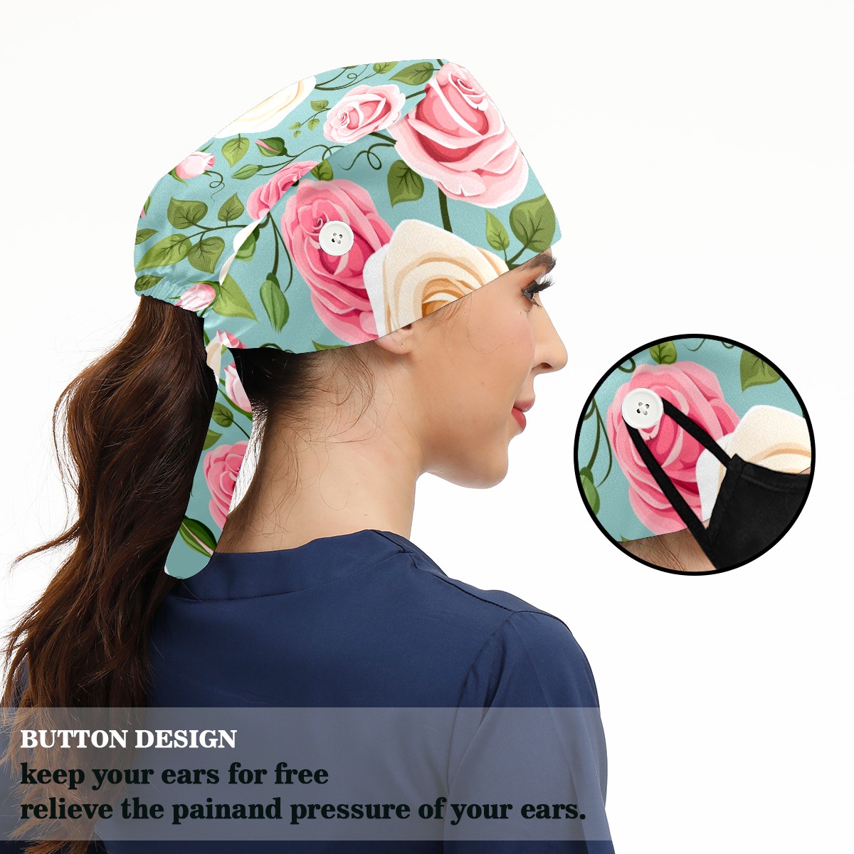 Working Caps with Button & Sweatband Satin Lined Cotton Adjustable Nurse Hats Elastic Band Scrub Cap Surgeon Hat Pink And White Rose Flowers On Celadon Background
