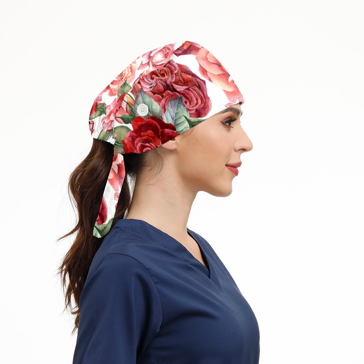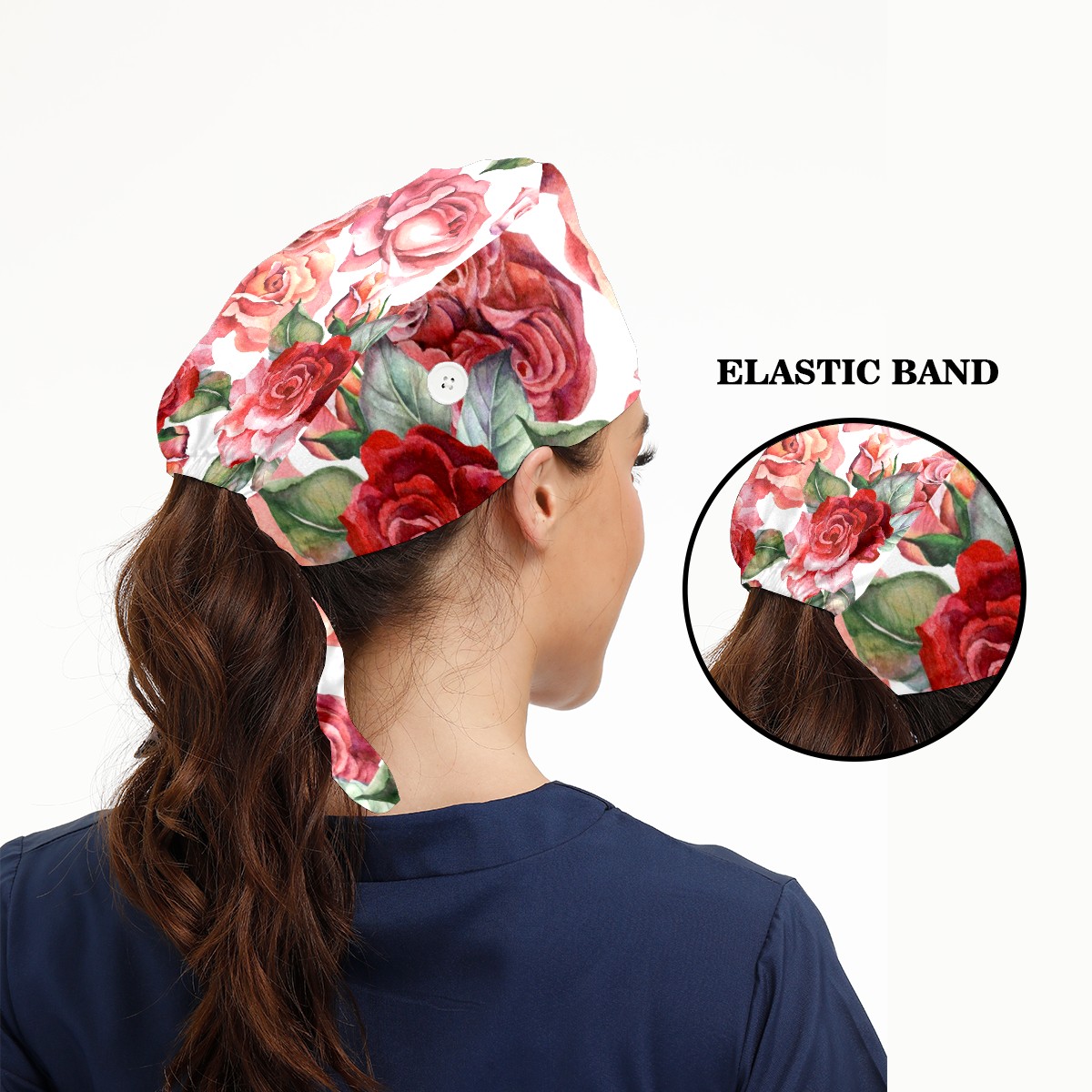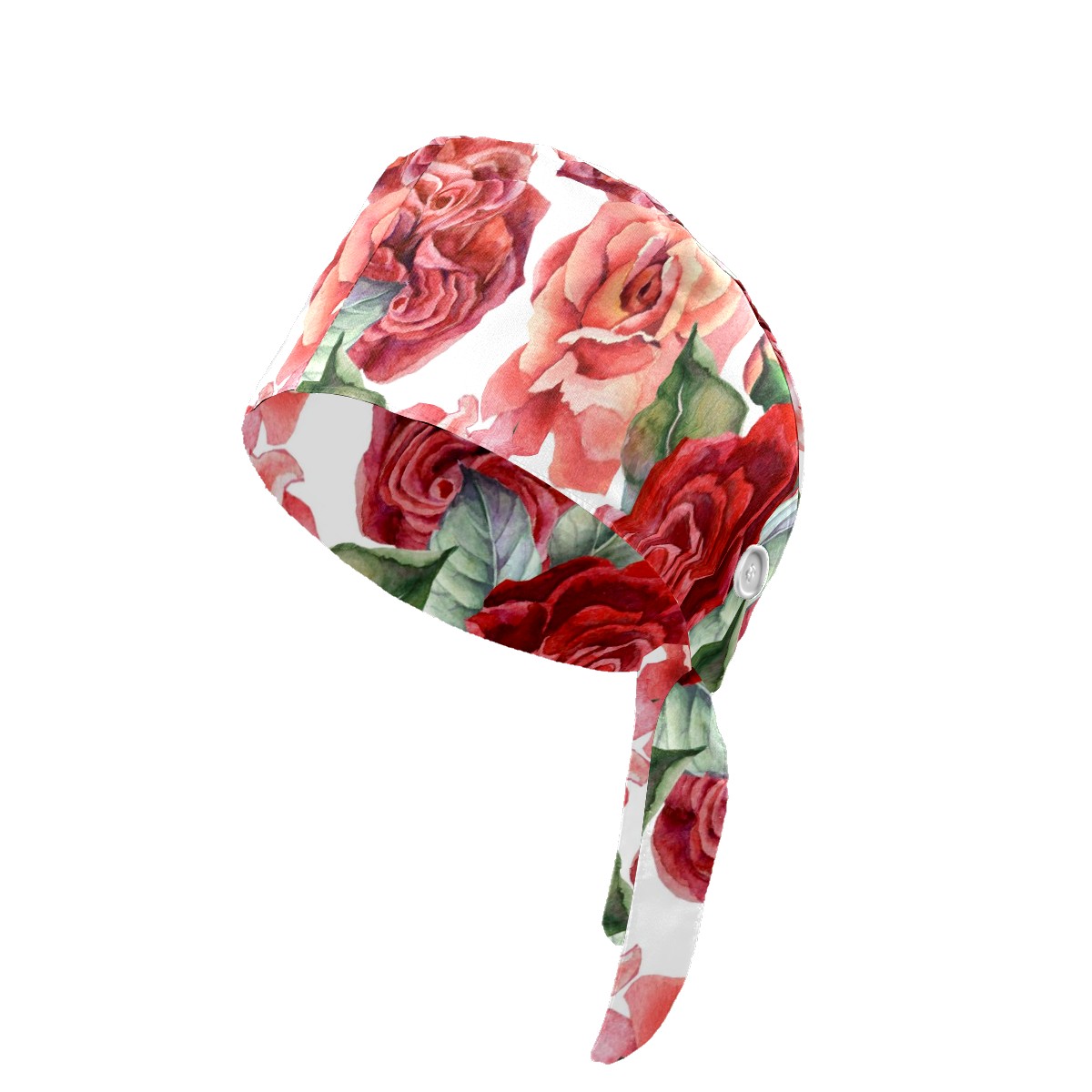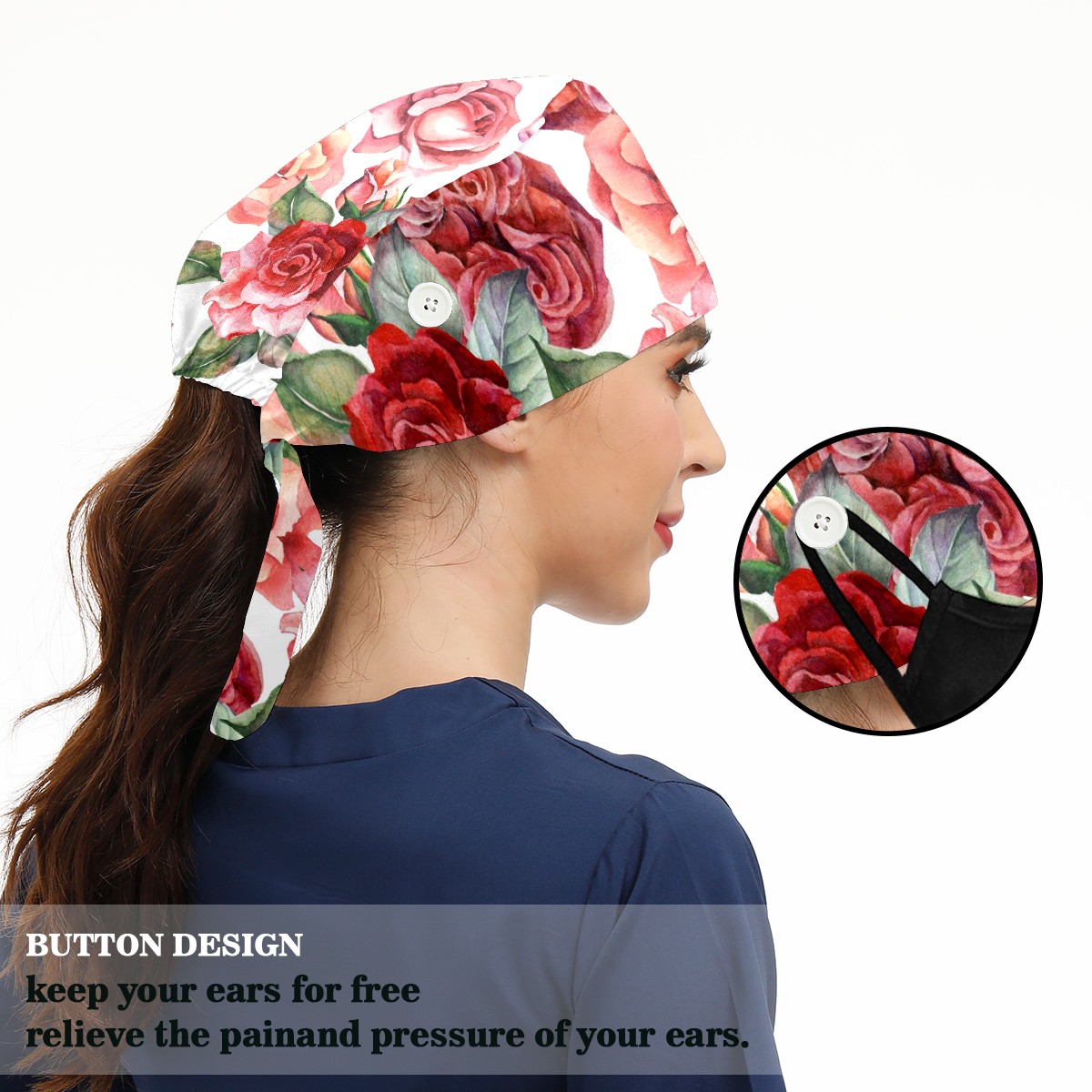 Working Caps with Button & Sweatband Satin Lined Cotton Adjustable Nurse Hats Elastic Band Scrub Cap Surgeon Hat Flower Red Rose