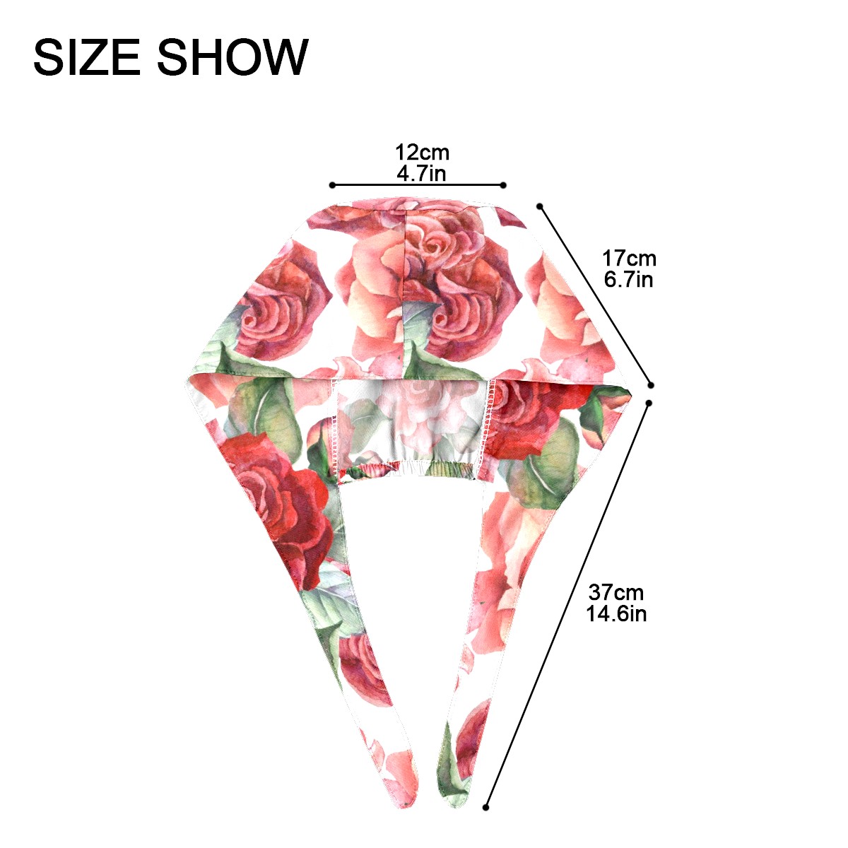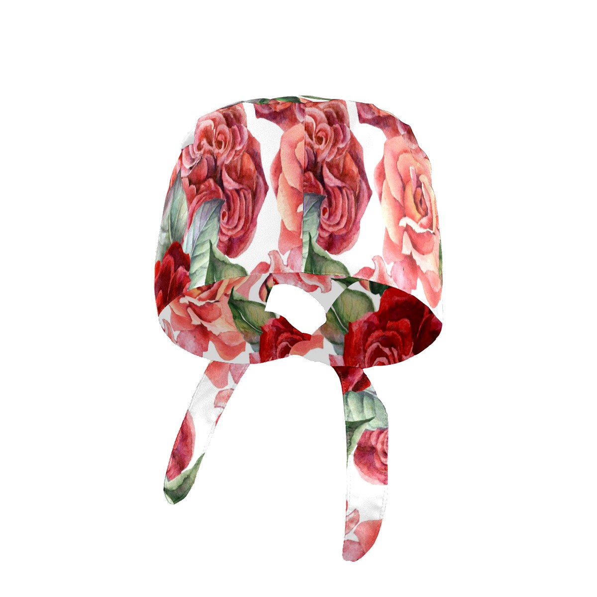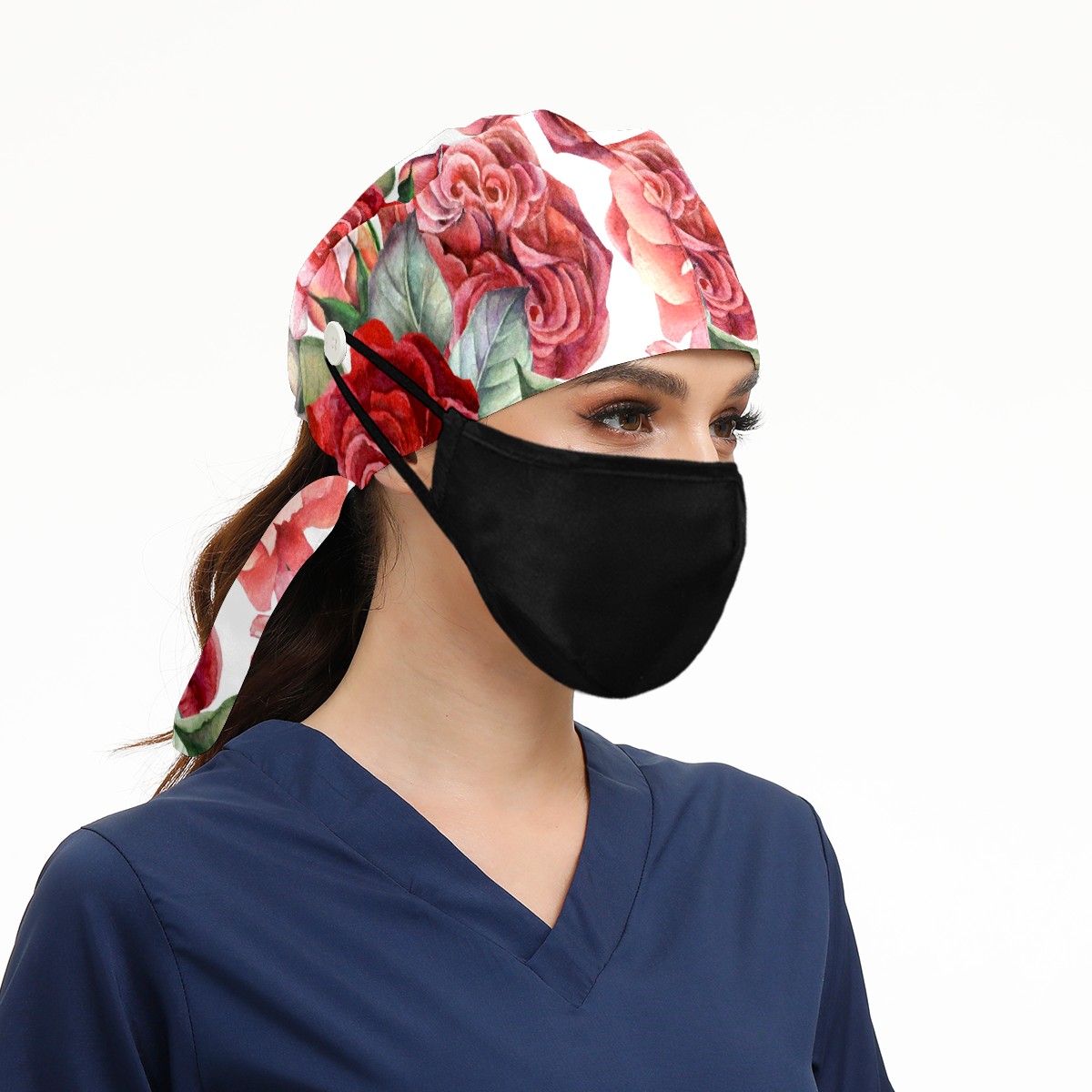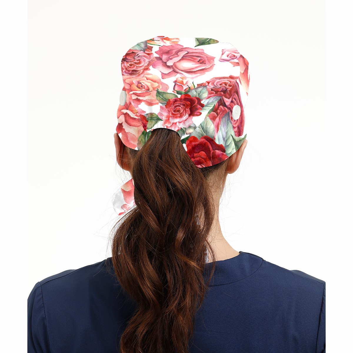 Working Caps with Button & Sweatband Satin Lined Cotton Adjustable Nurse Hats Elastic Band Scrub Cap Surgeon Hat Flower Red Rose