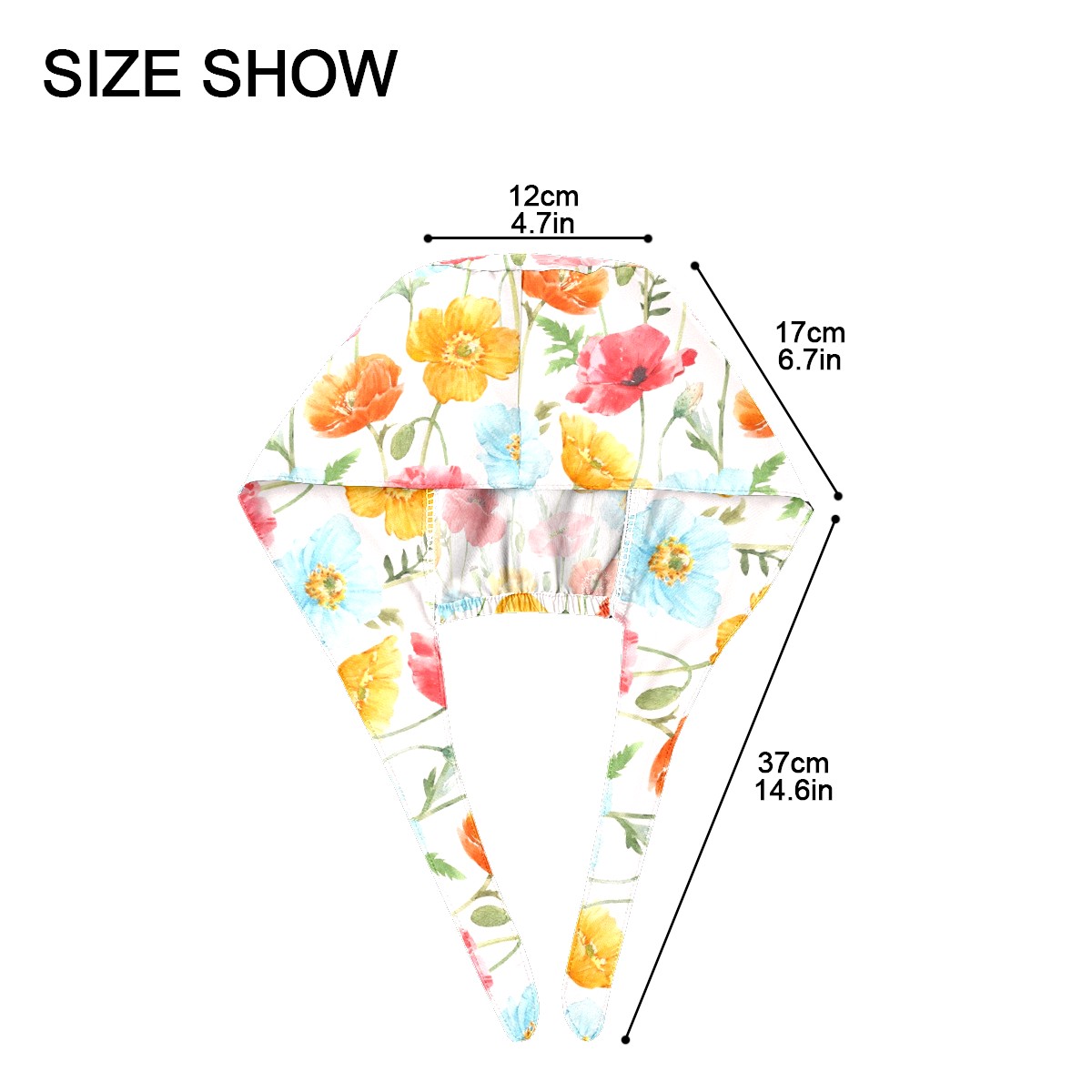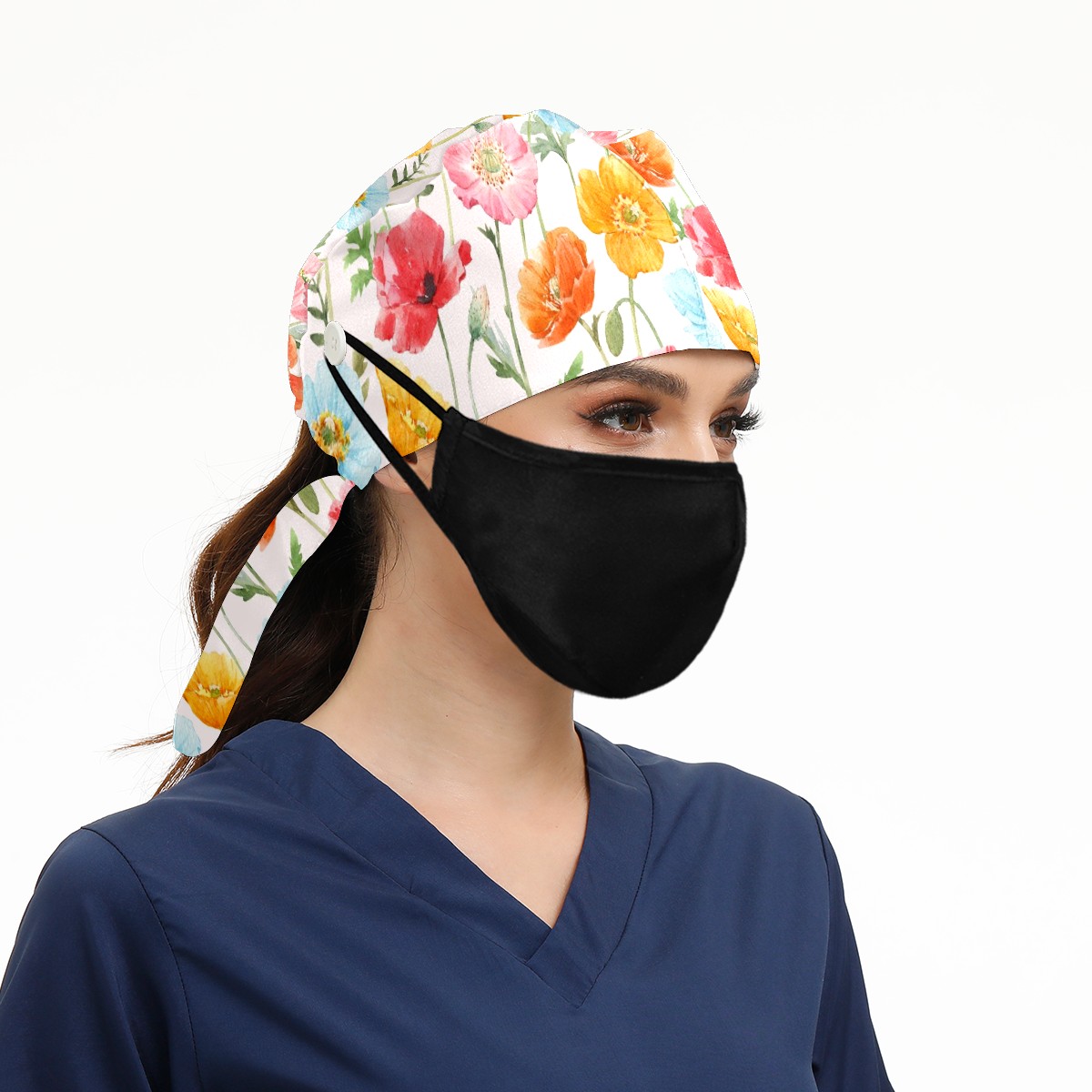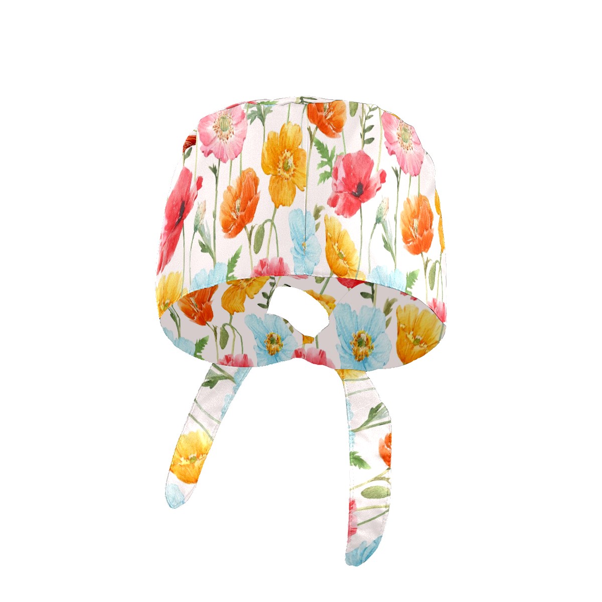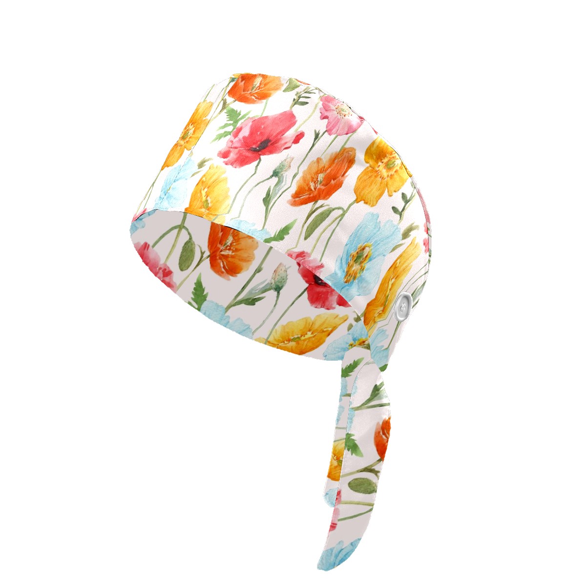 Working Caps with Button & Sweatband Satin Lined Cotton Adjustable Nurse Hats Elastic Band Scrub Cap Surgeon Hat Colorful Poppy Flowers Watercolor