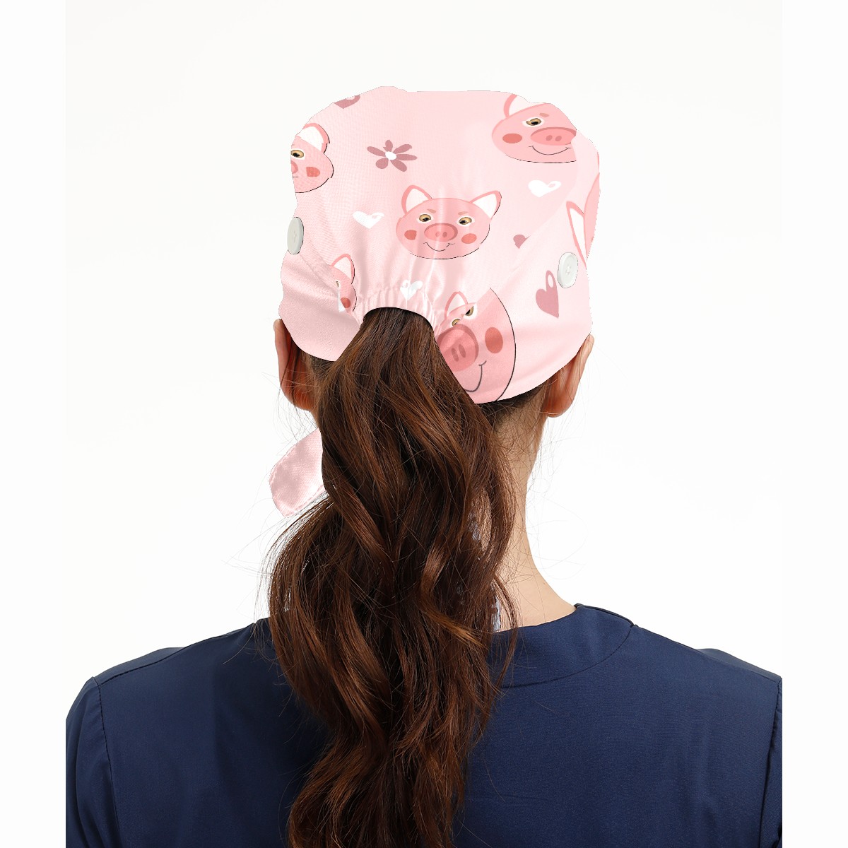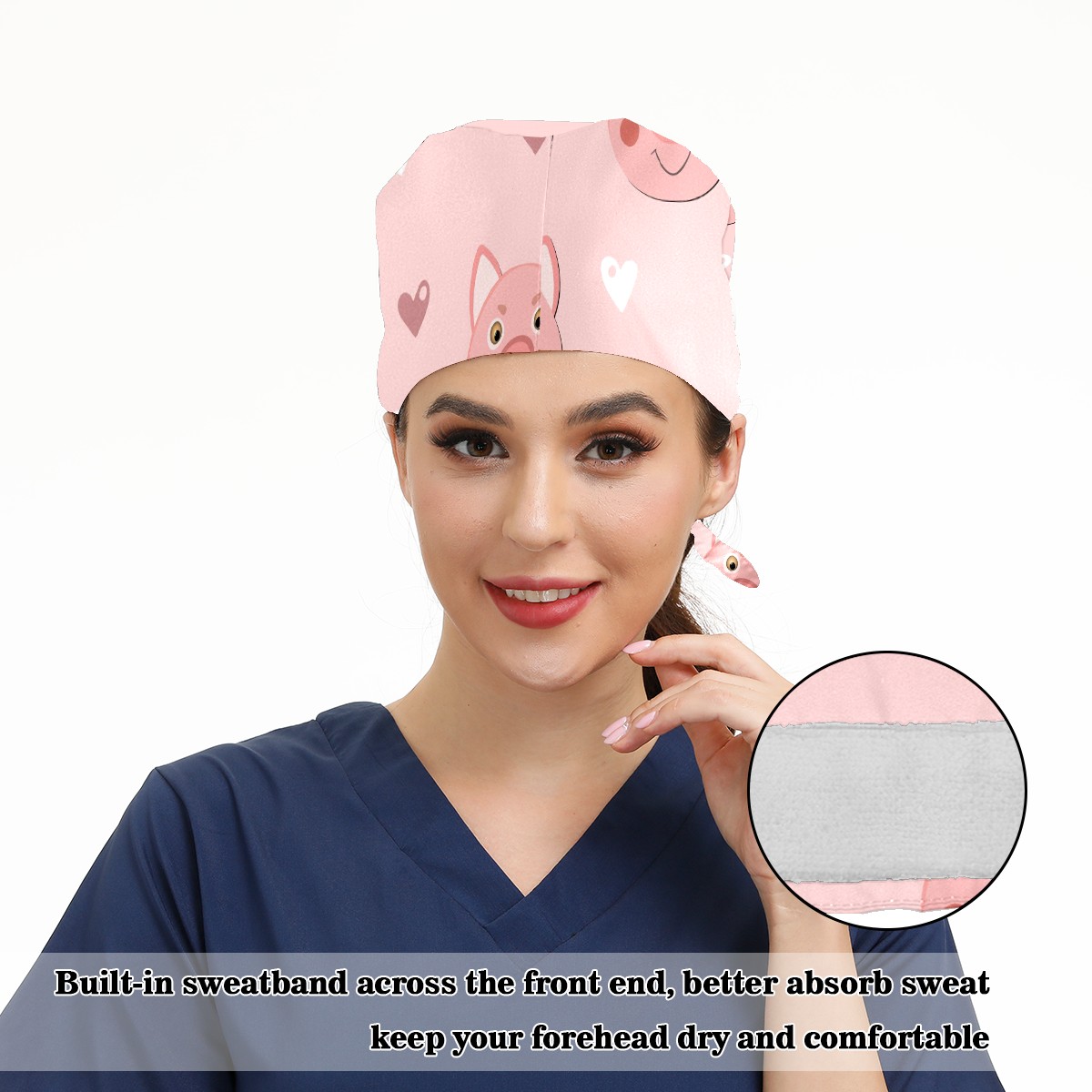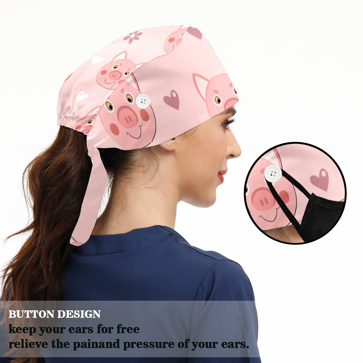 Working Caps with Button & Sweatband Satin Lined Cotton Adjustable Nurse Hats Elastic Band Scrub Cap Surgeon Hat Cute Pink Pig Flower