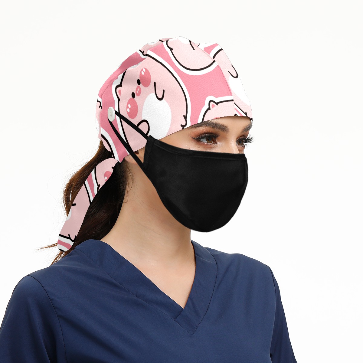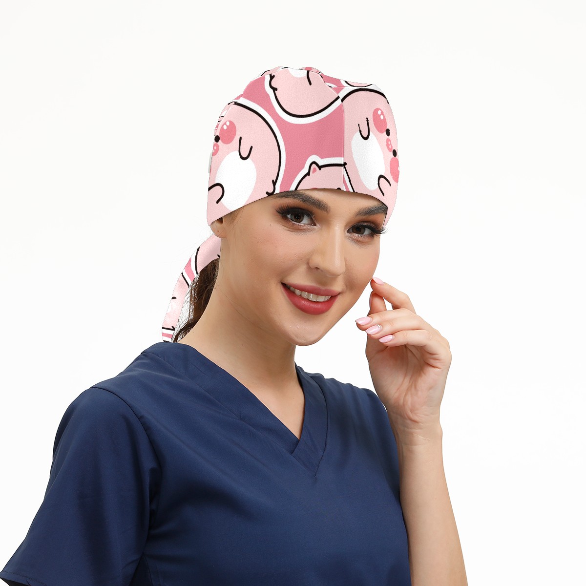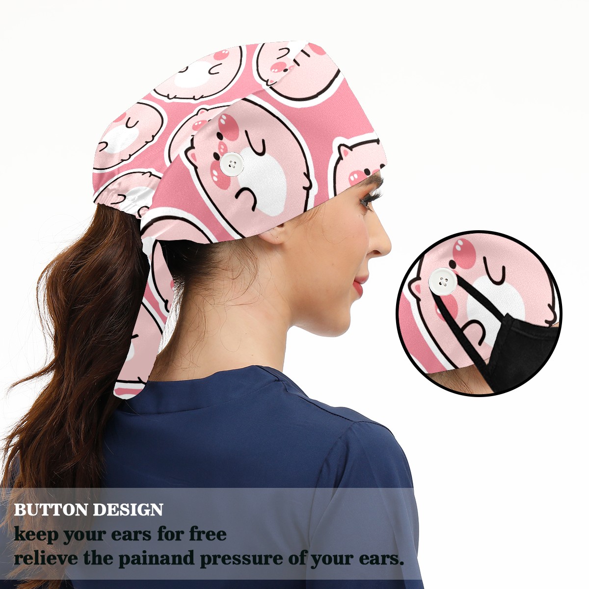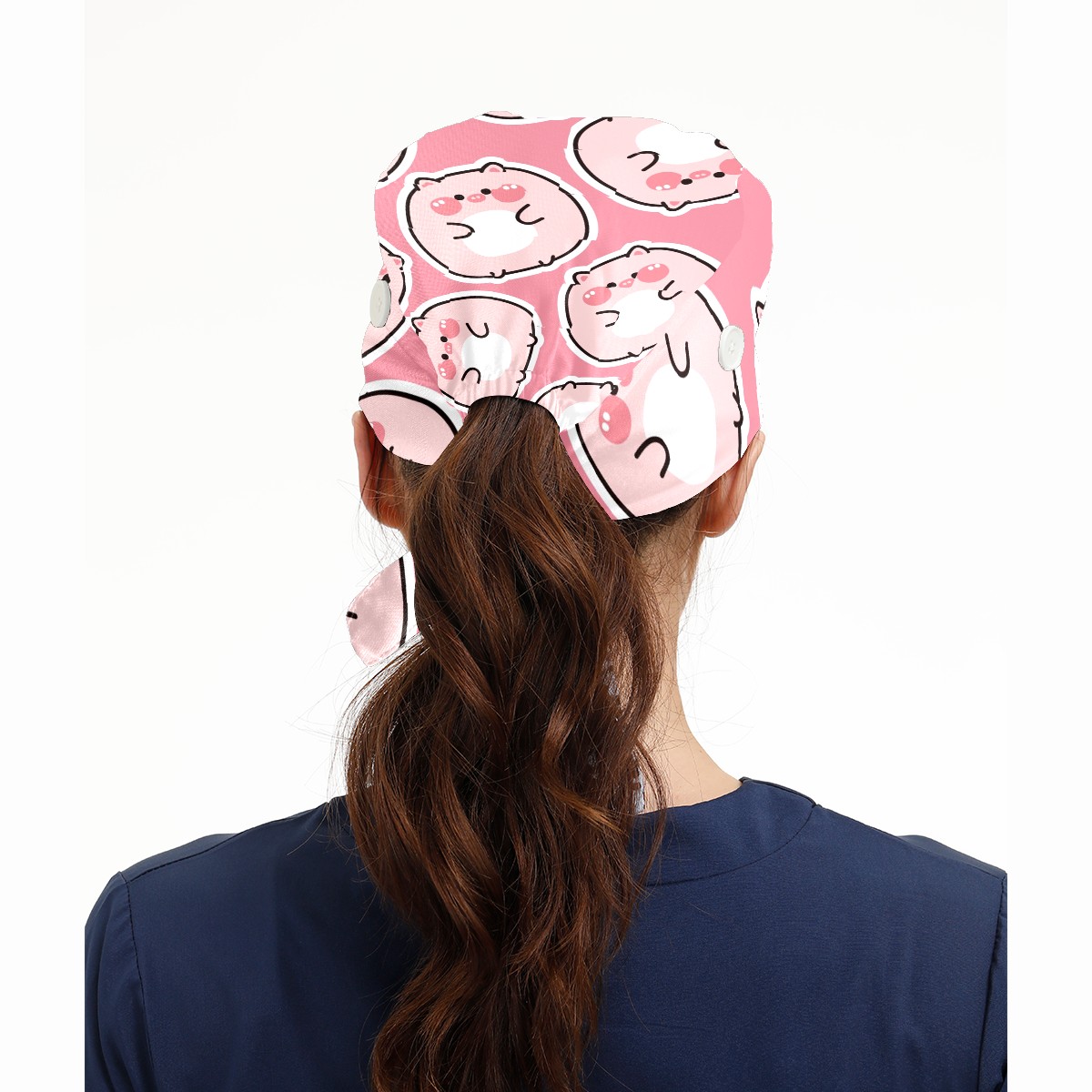 Working Caps with Button & Sweatband Satin Lined Cotton Adjustable Nurse Hats Elastic Band Scrub Cap Surgeon Hat Cute Fat Pig On Pink Background