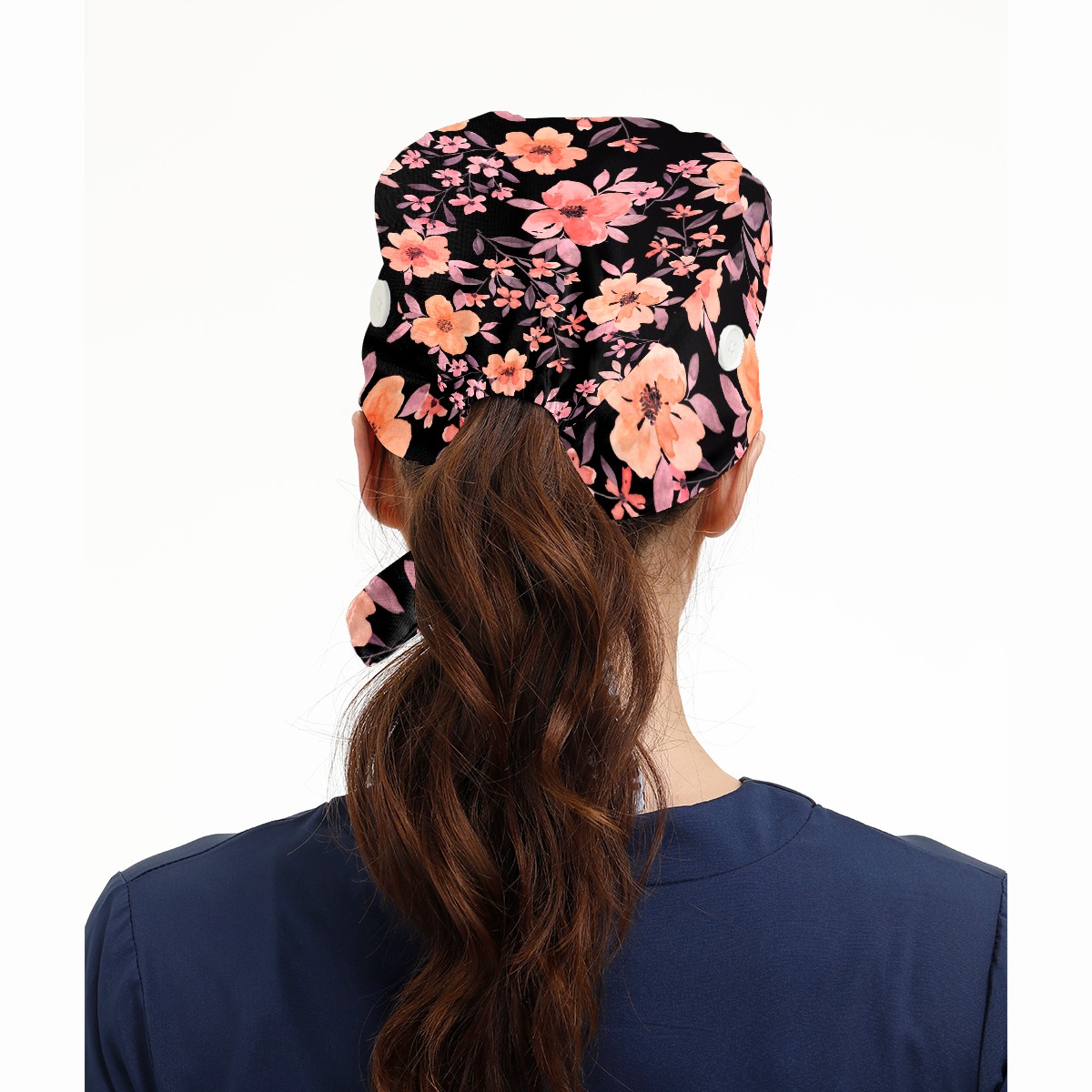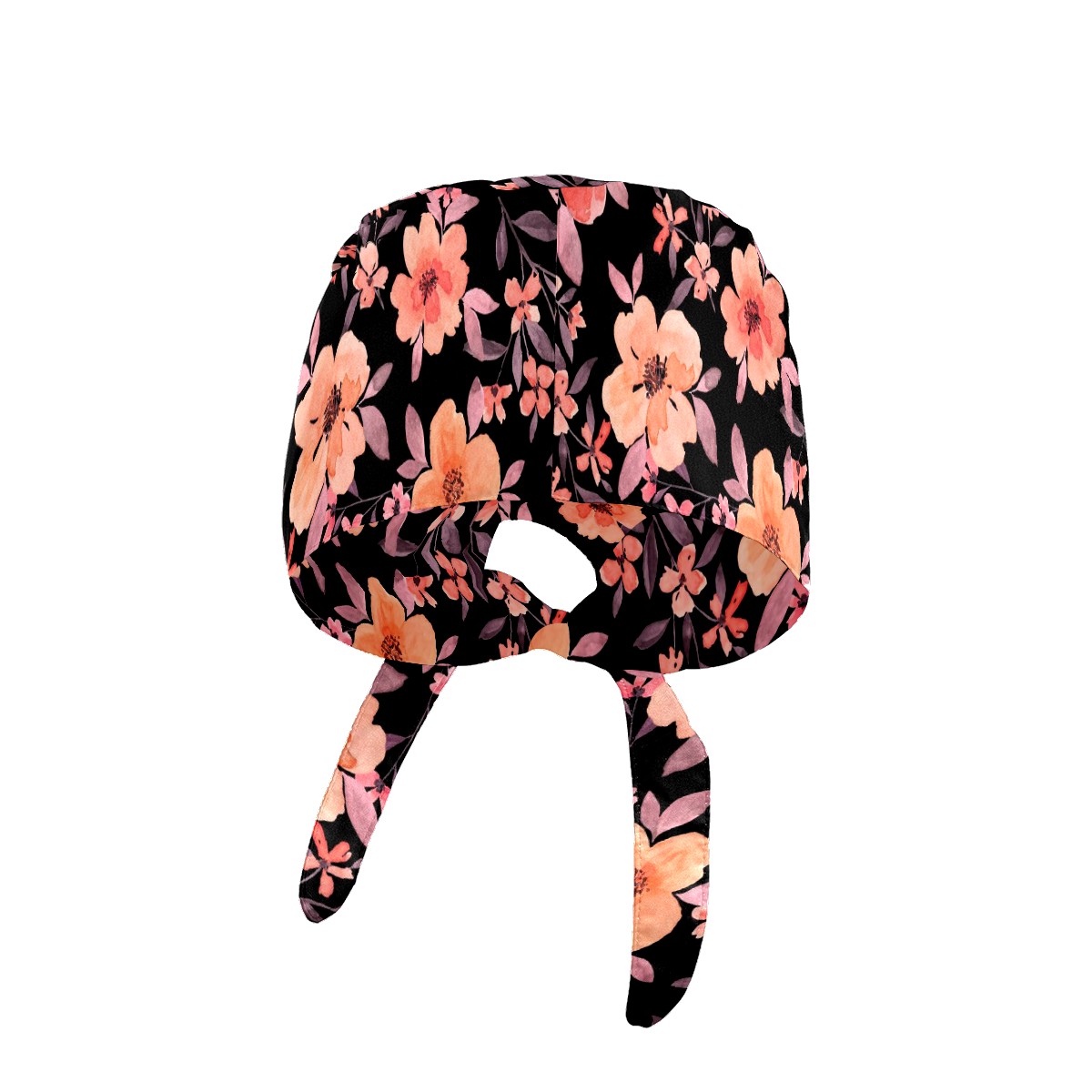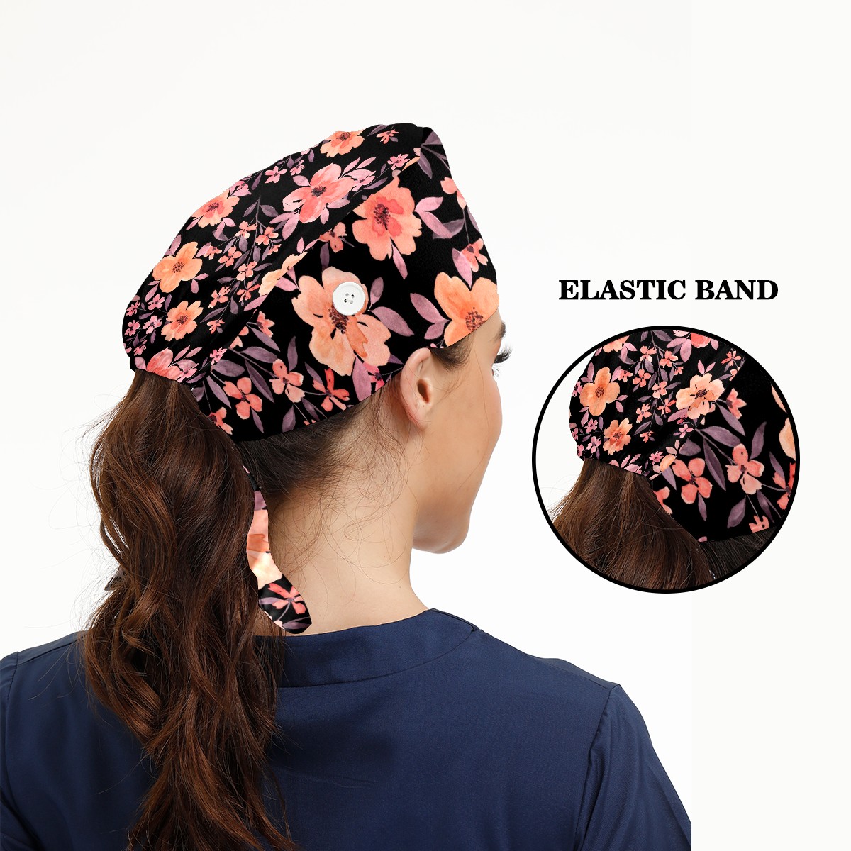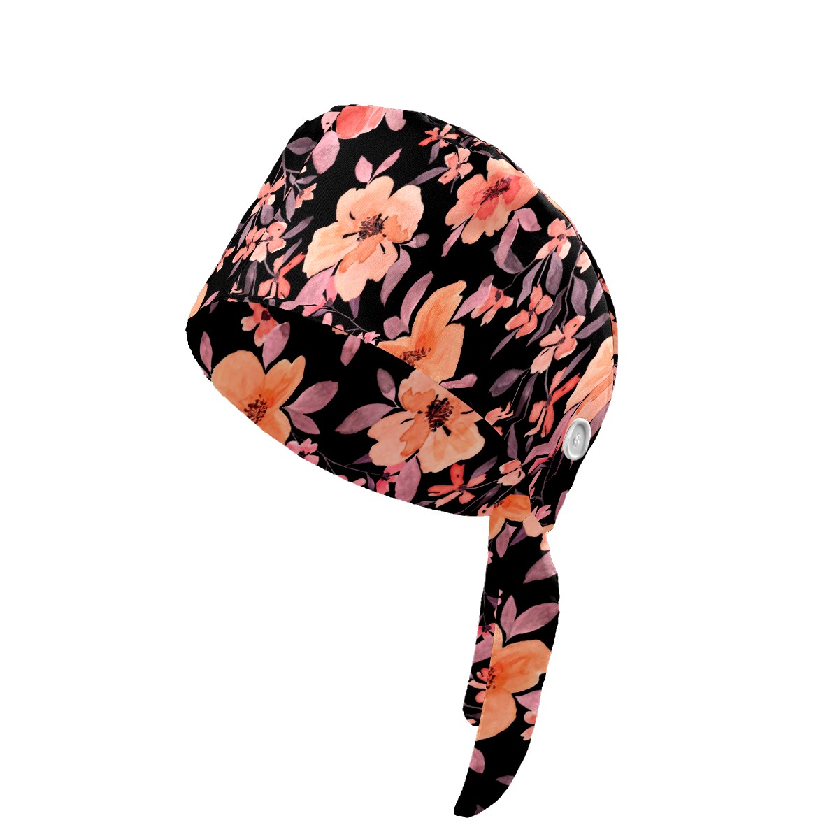 Working Caps with Button & Sweatband Satin Lined Cotton Adjustable Nurse Hats Elastic Band Scrub Cap Surgeon Hat Watercolor Peach Flowers On Black Background