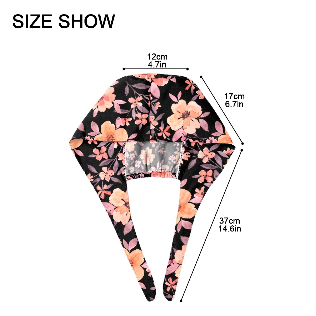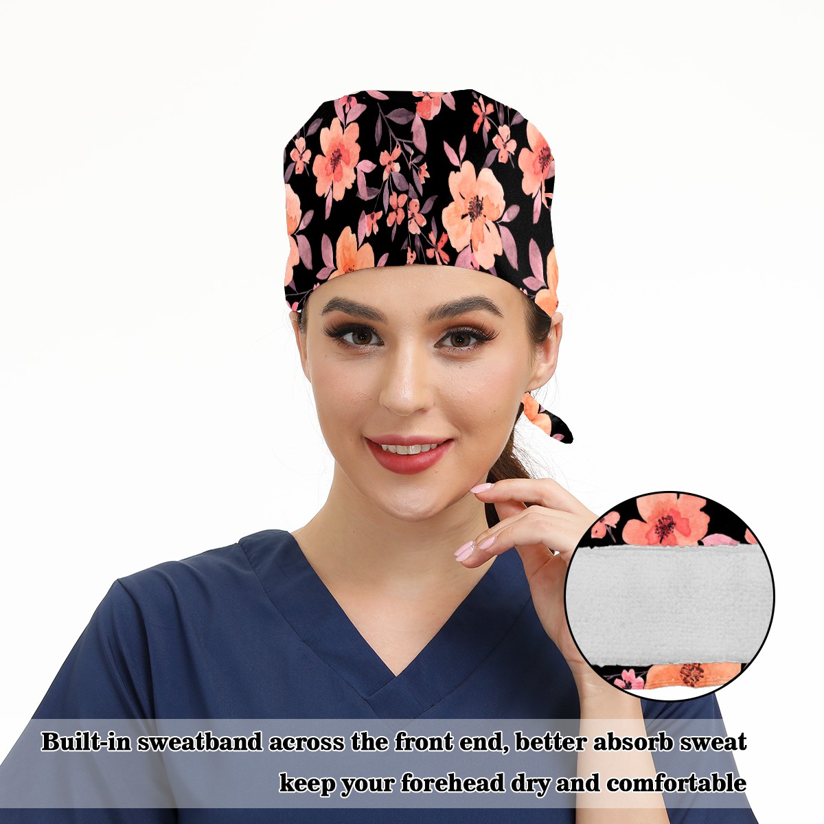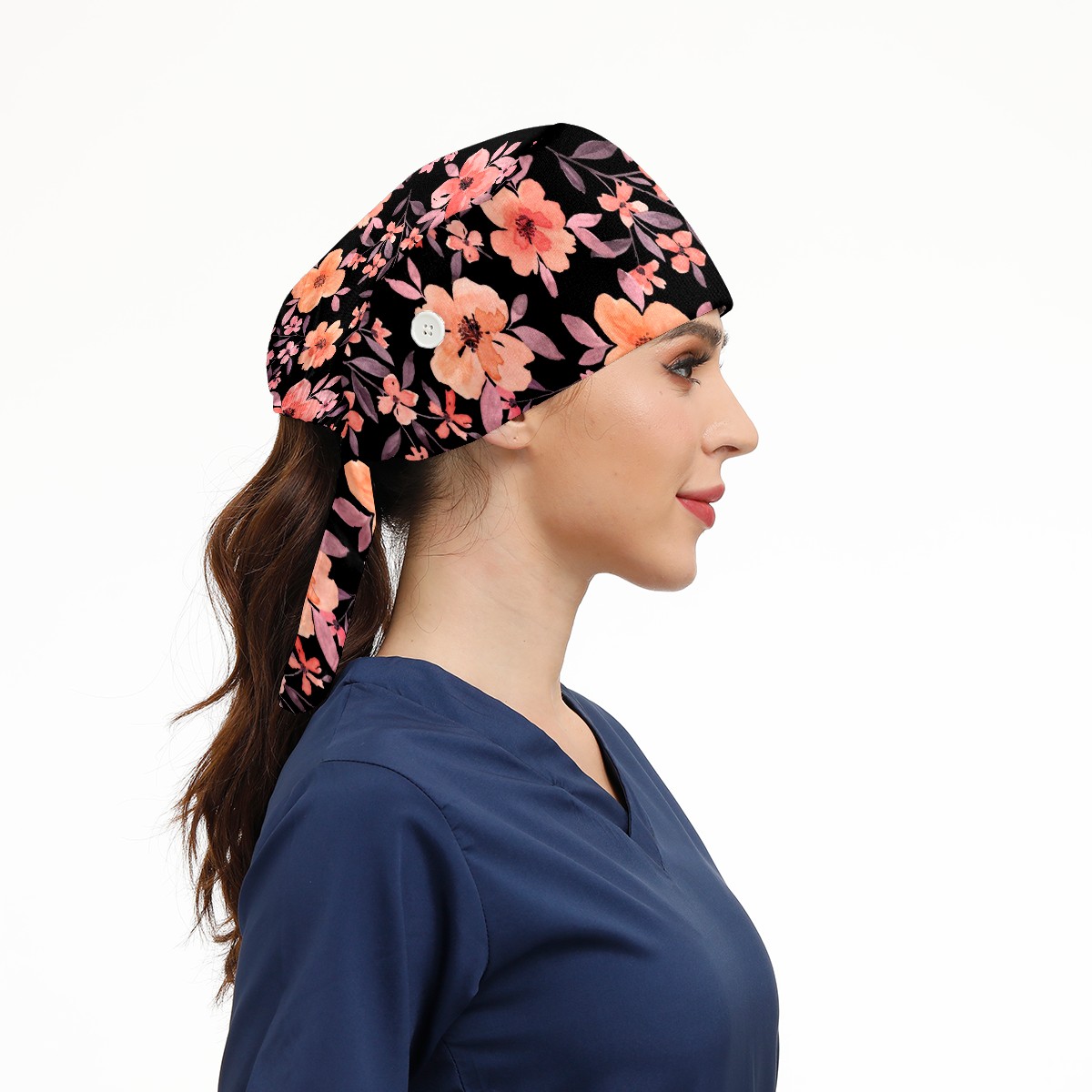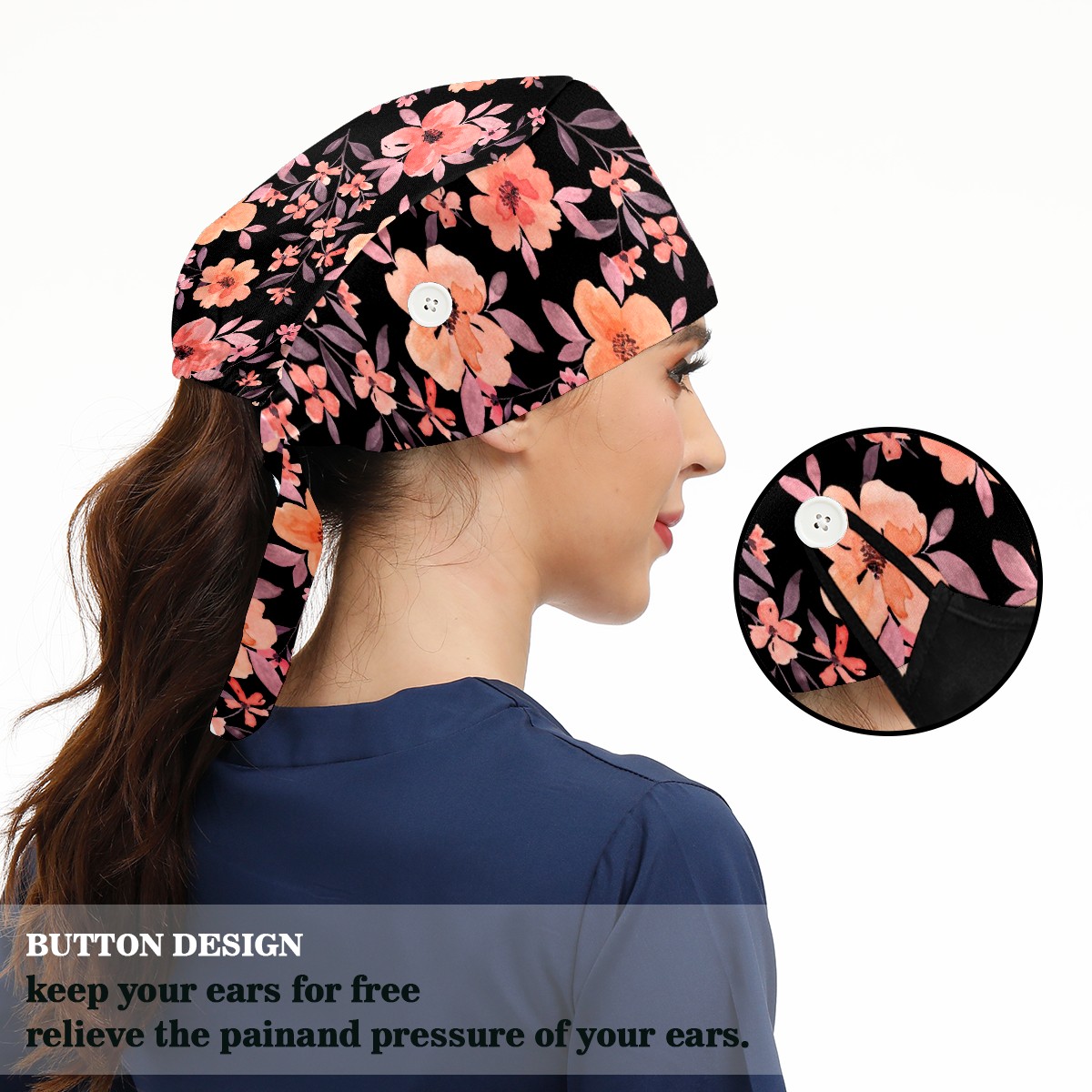 Working Caps with Button & Sweatband Satin Lined Cotton Adjustable Nurse Hats Elastic Band Scrub Cap Surgeon Hat Watercolor Peach Flowers On Black Background