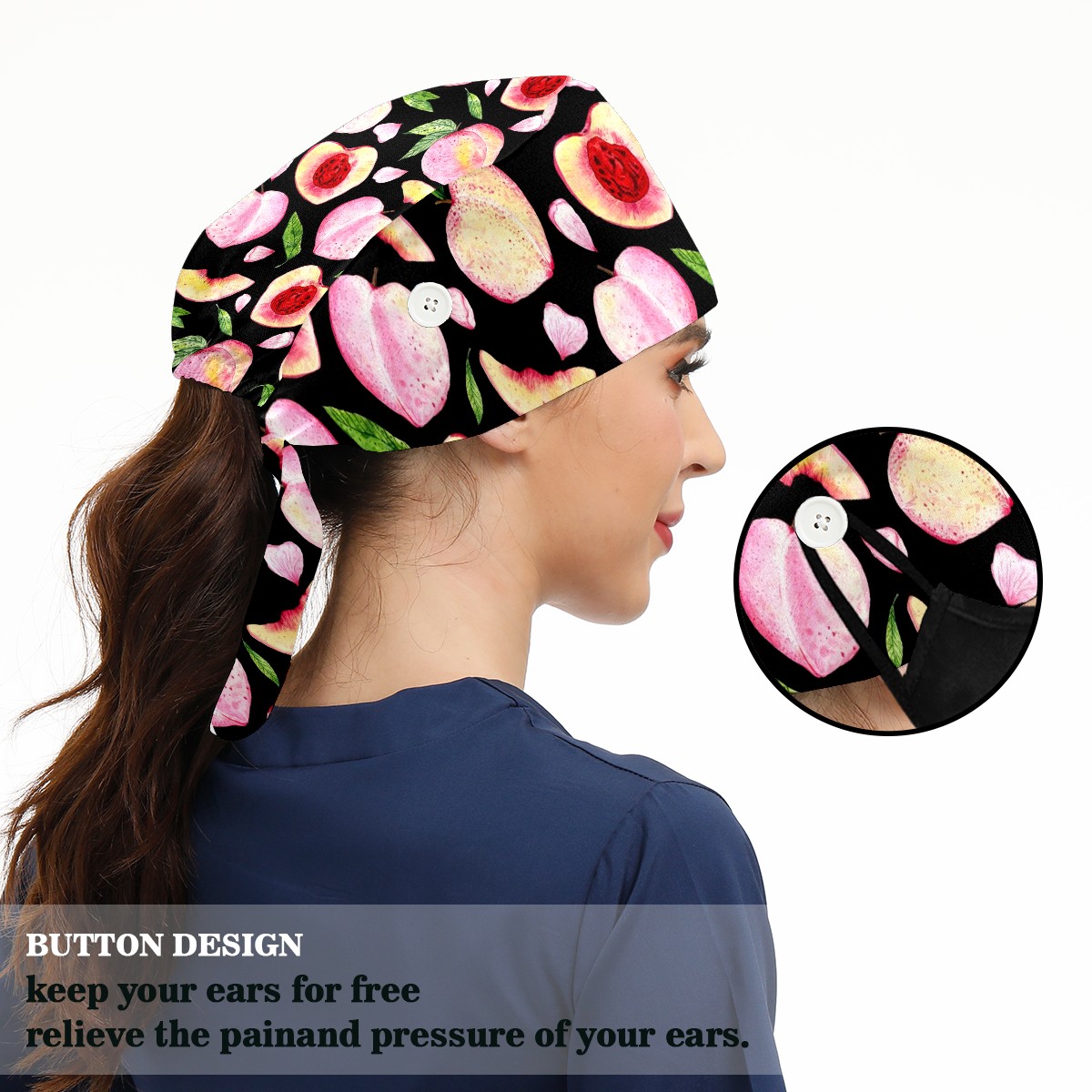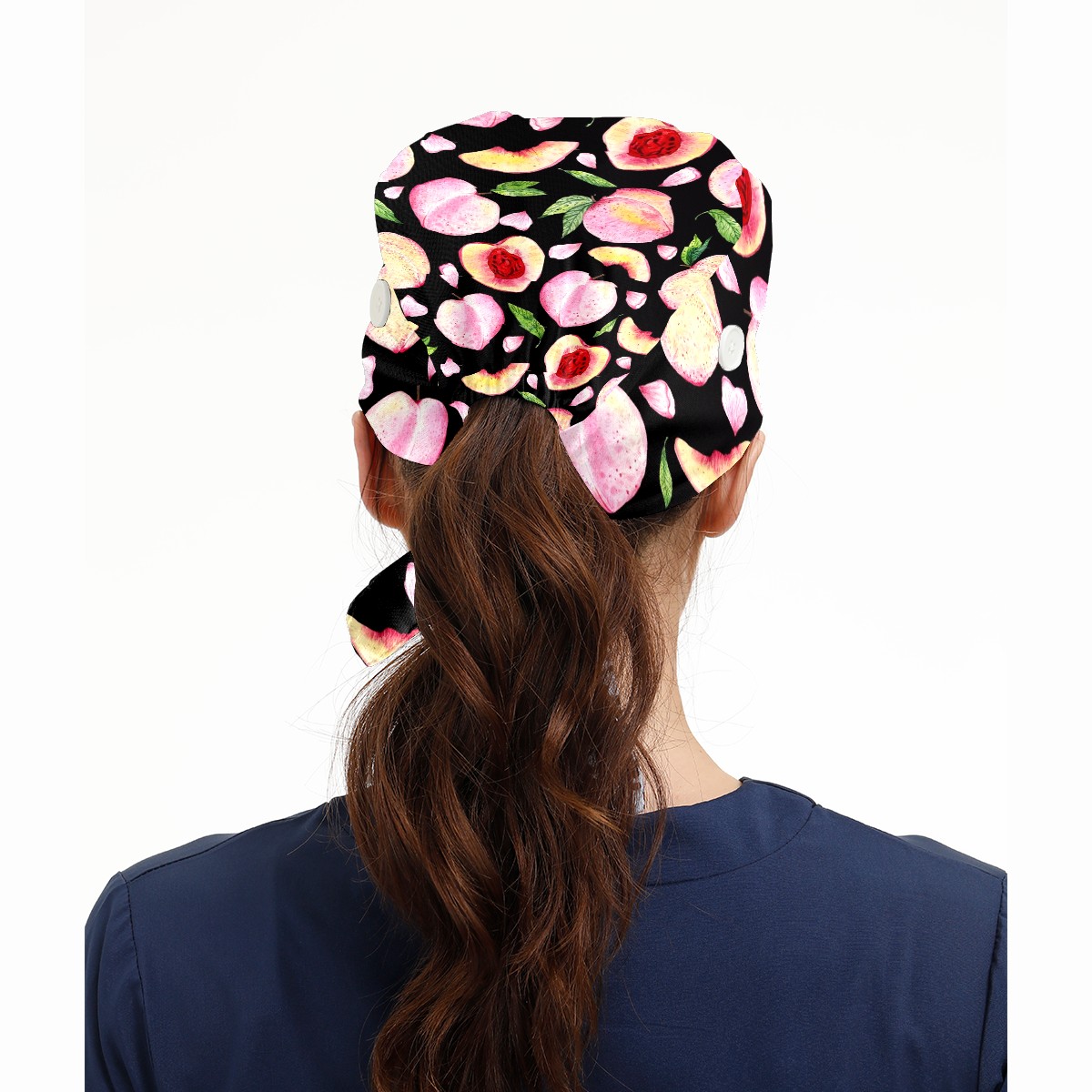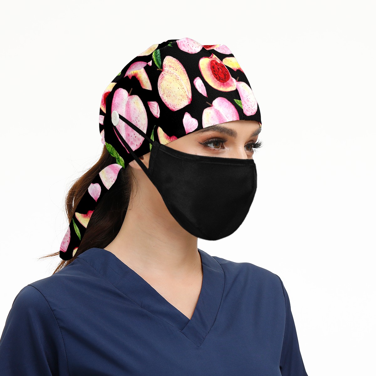 Working Caps with Button & Sweatband Satin Lined Cotton Adjustable Nurse Hats Elastic Band Scrub Cap Surgeon Hat Pink Peach On Black Background