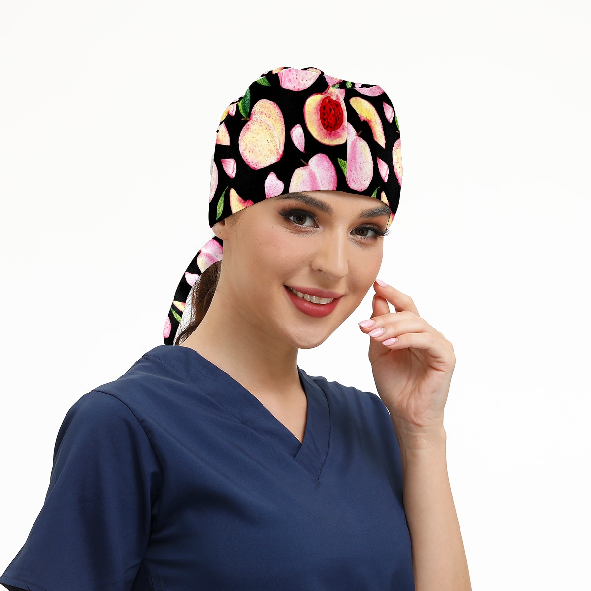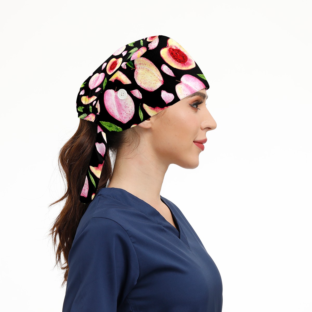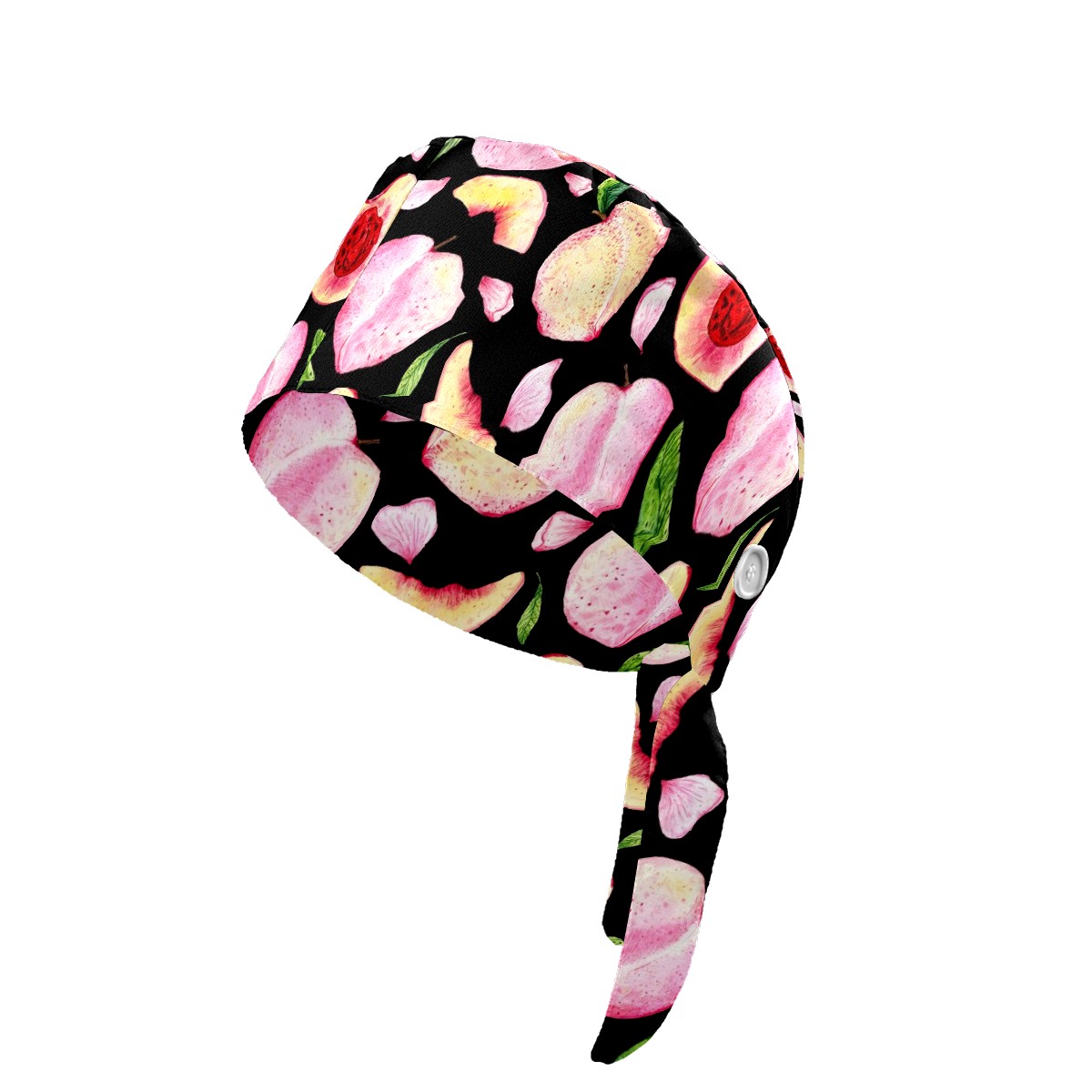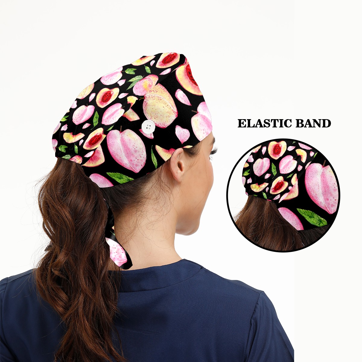 Working Caps with Button & Sweatband Satin Lined Cotton Adjustable Nurse Hats Elastic Band Scrub Cap Surgeon Hat Pink Peach On Black Background