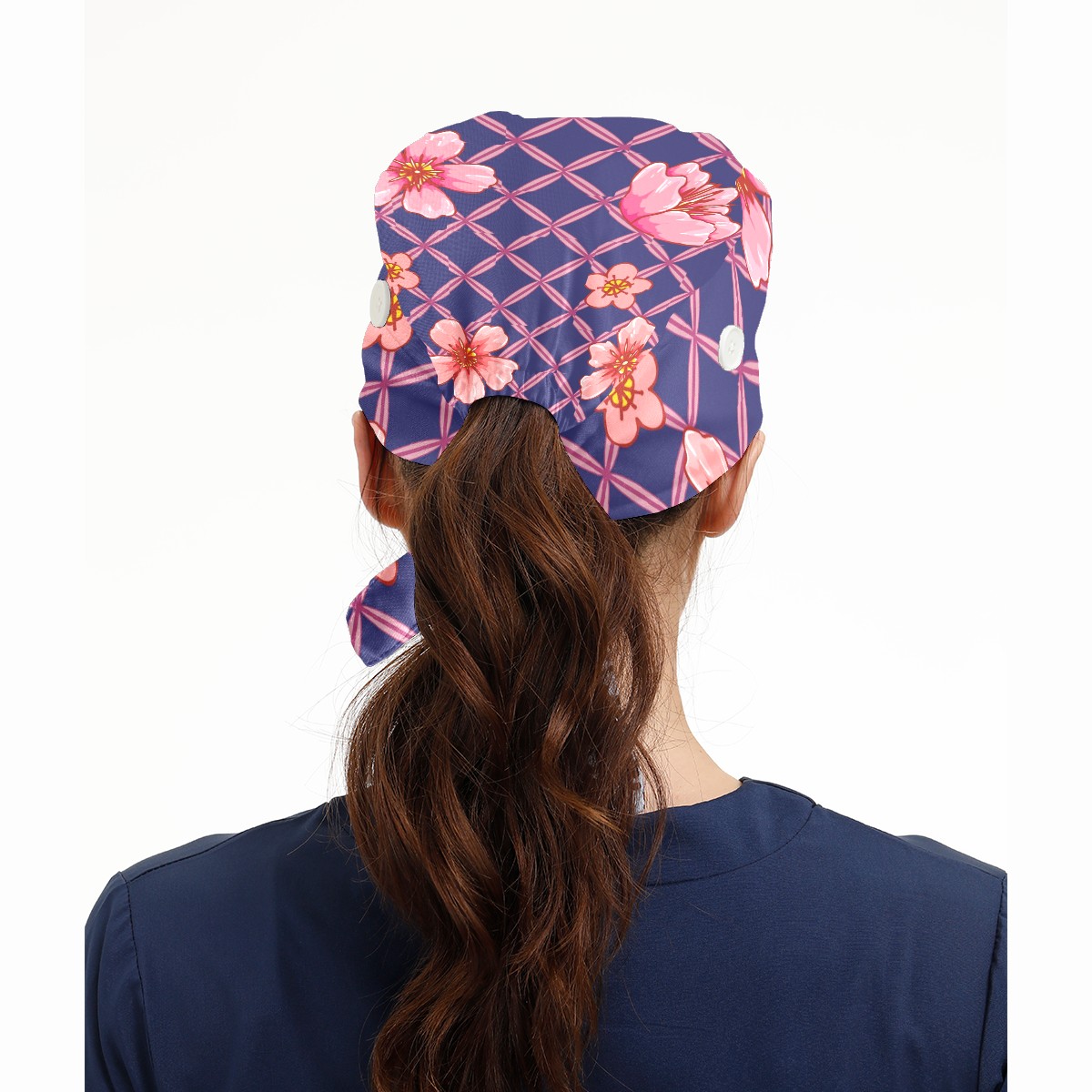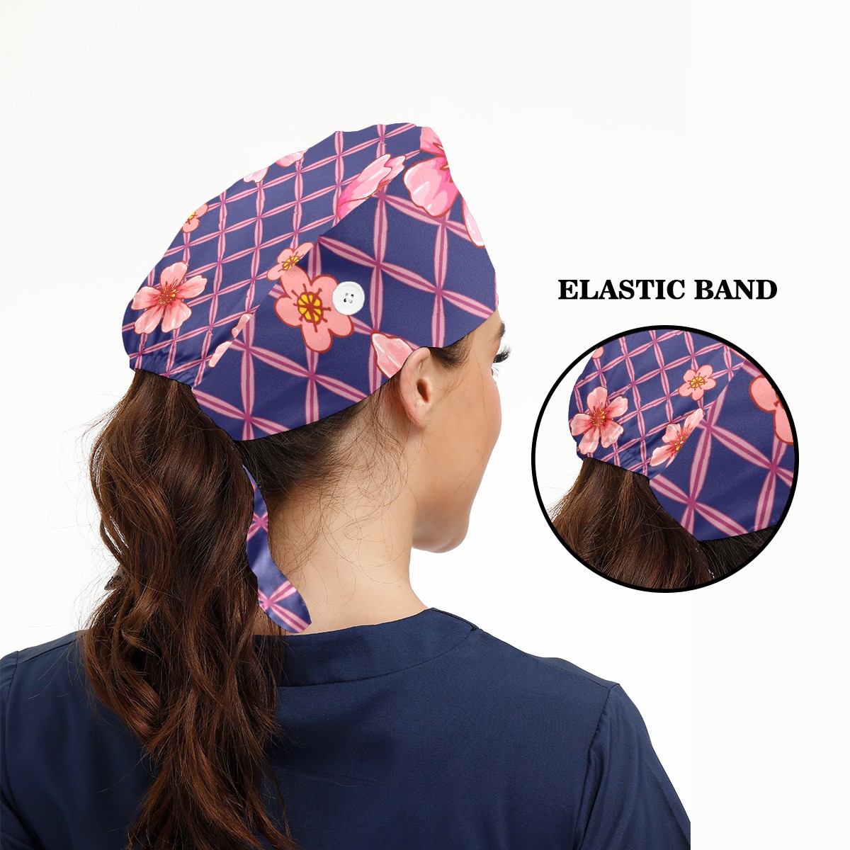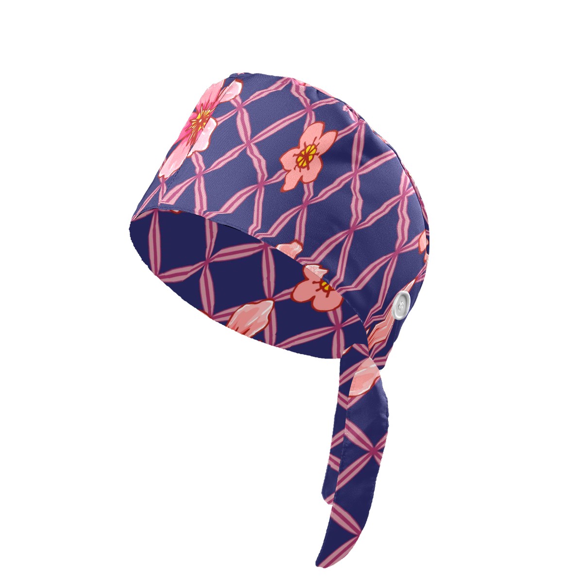 Working Caps with Button & Sweatband Satin Lined Cotton Adjustable Nurse Hats Elastic Band Scrub Cap Surgeon Hat Pink Peach Blossom Grid