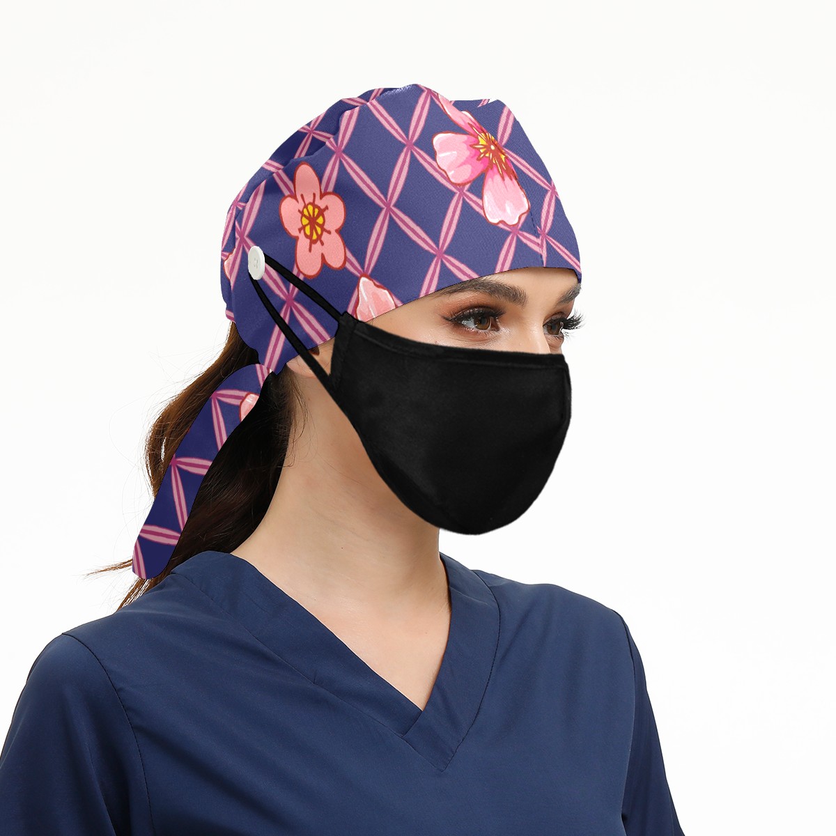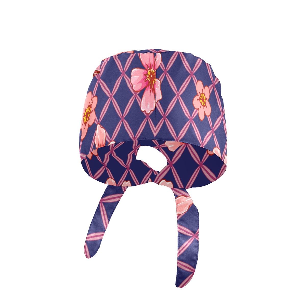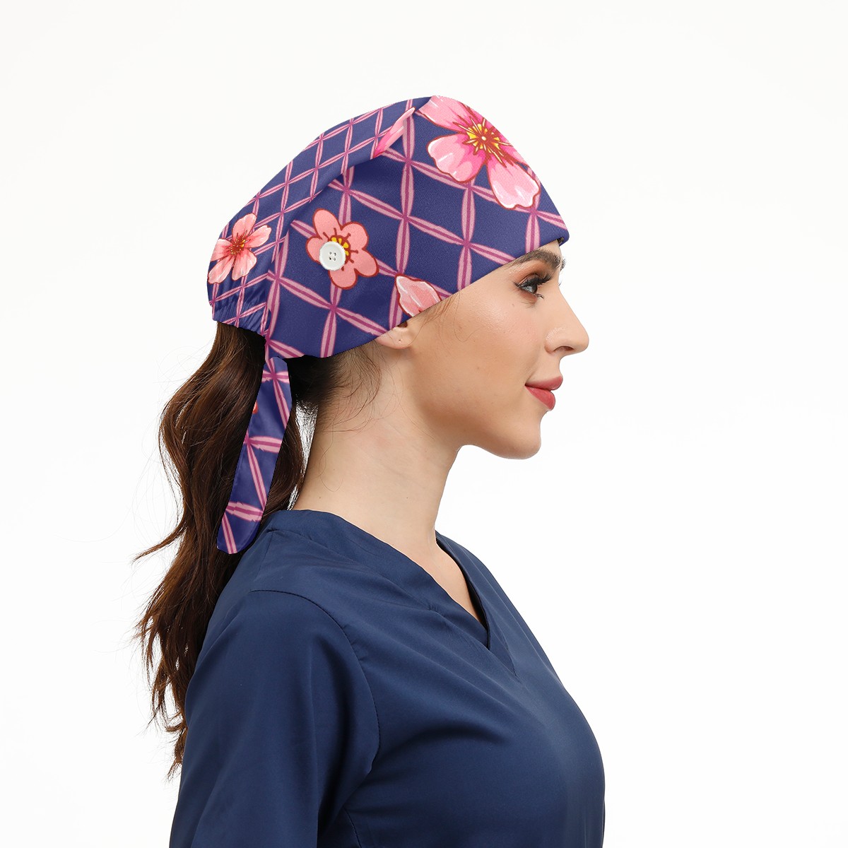 Working Caps with Button & Sweatband Satin Lined Cotton Adjustable Nurse Hats Elastic Band Scrub Cap Surgeon Hat Pink Peach Blossom Grid