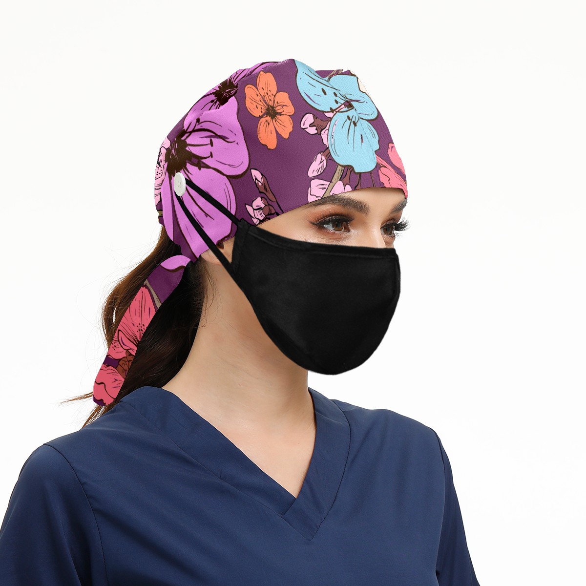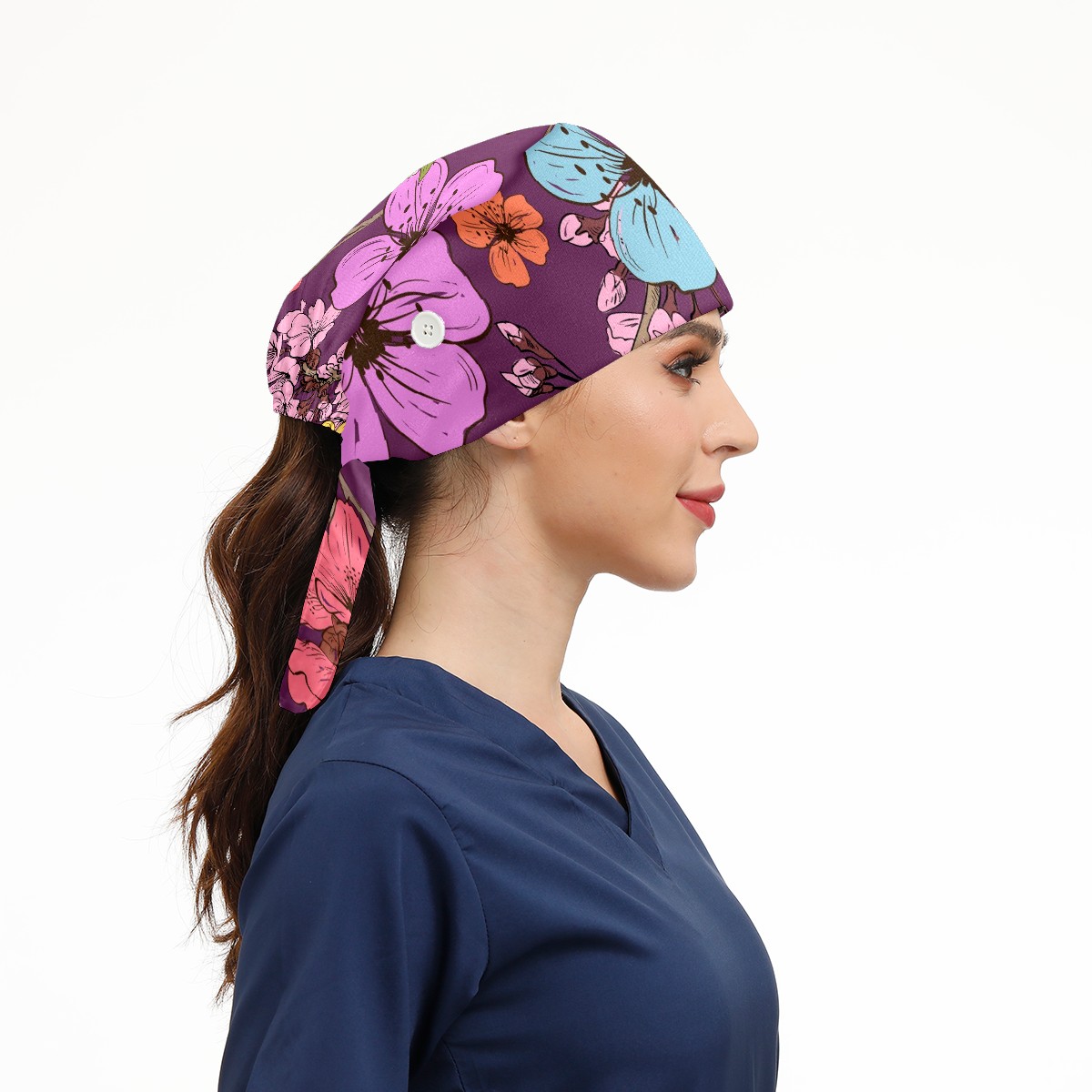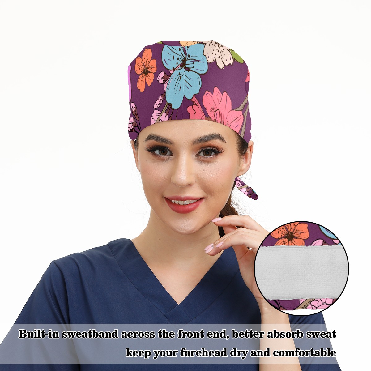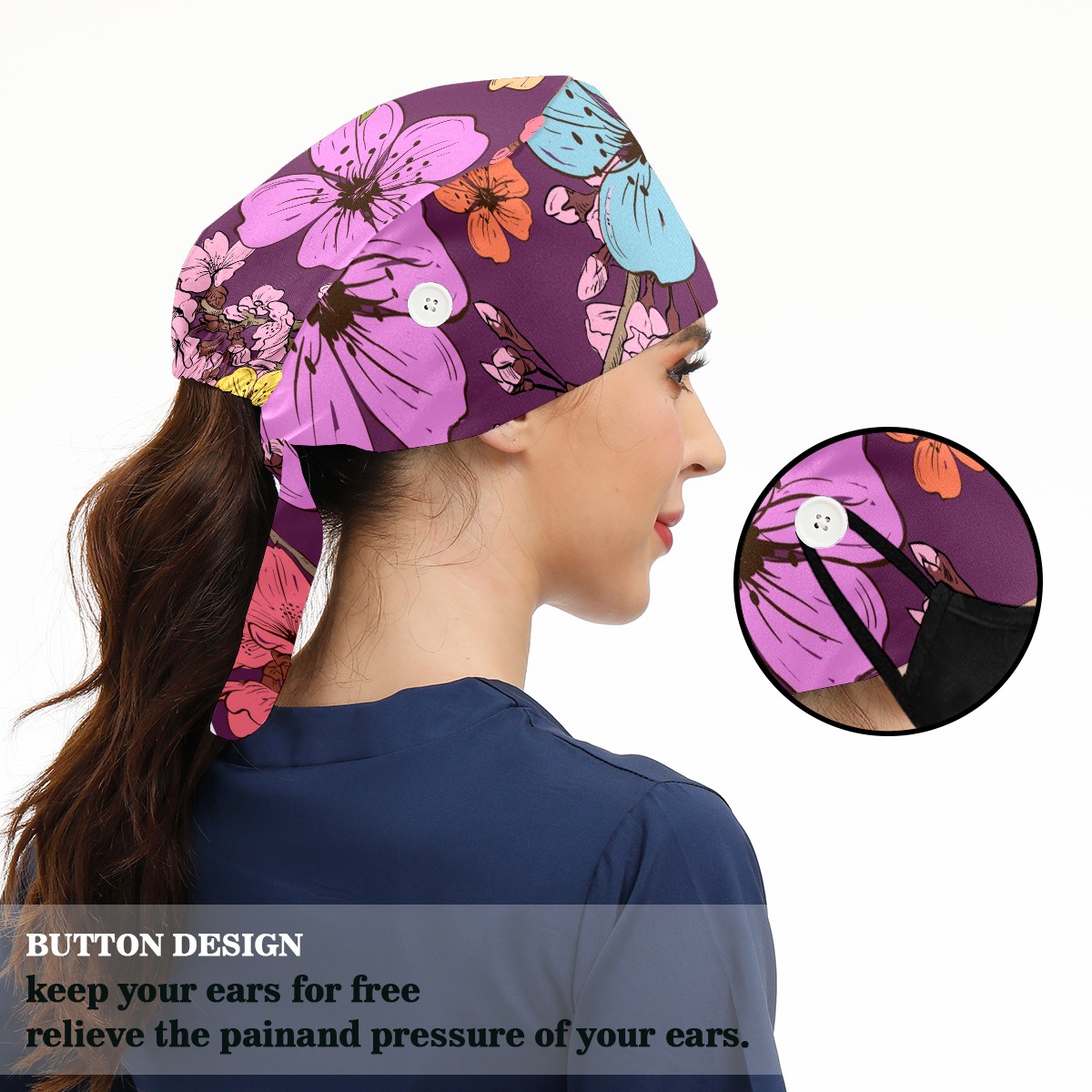 Working Caps with Button & Sweatband Satin Lined Cotton Adjustable Nurse Hats Elastic Band Scrub Cap Surgeon Hat Purple Flower