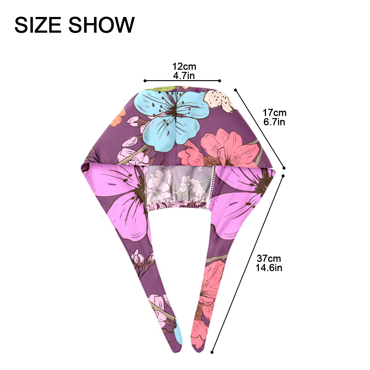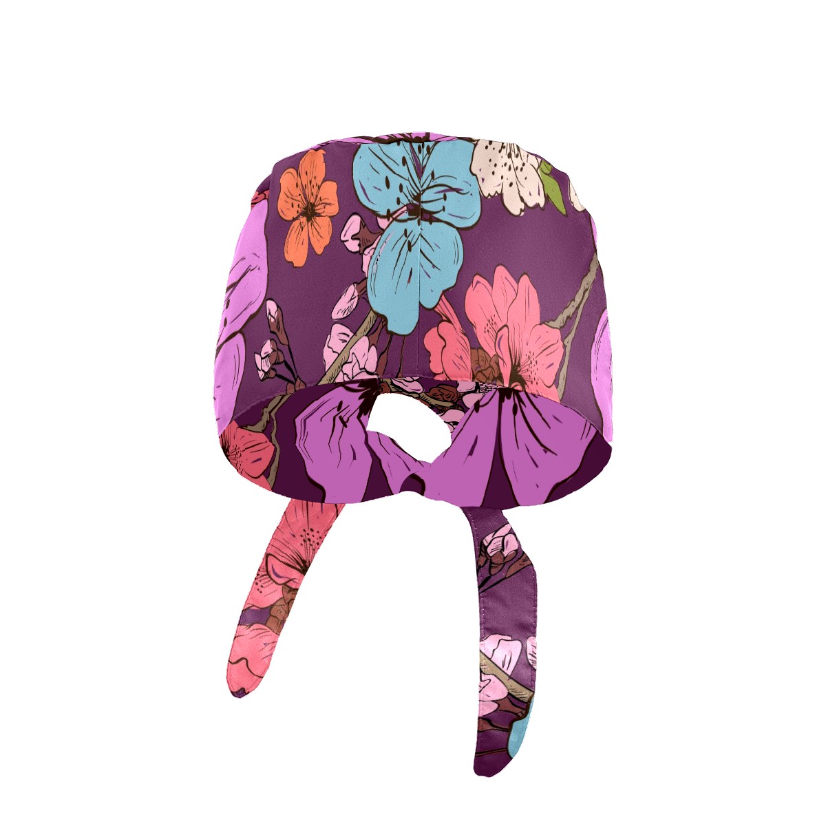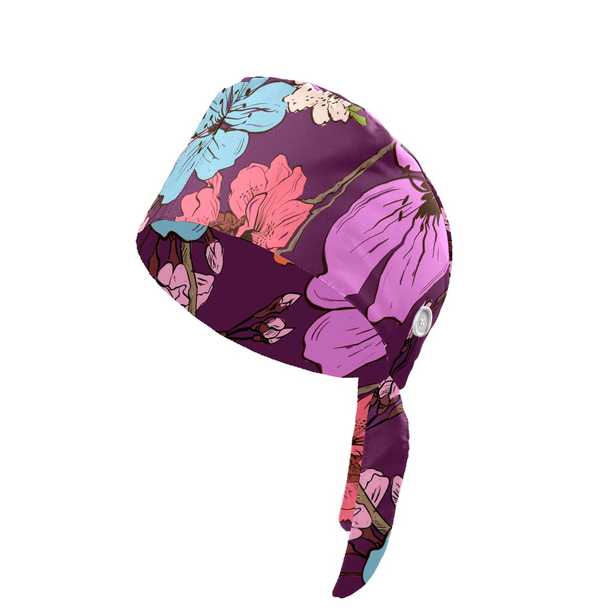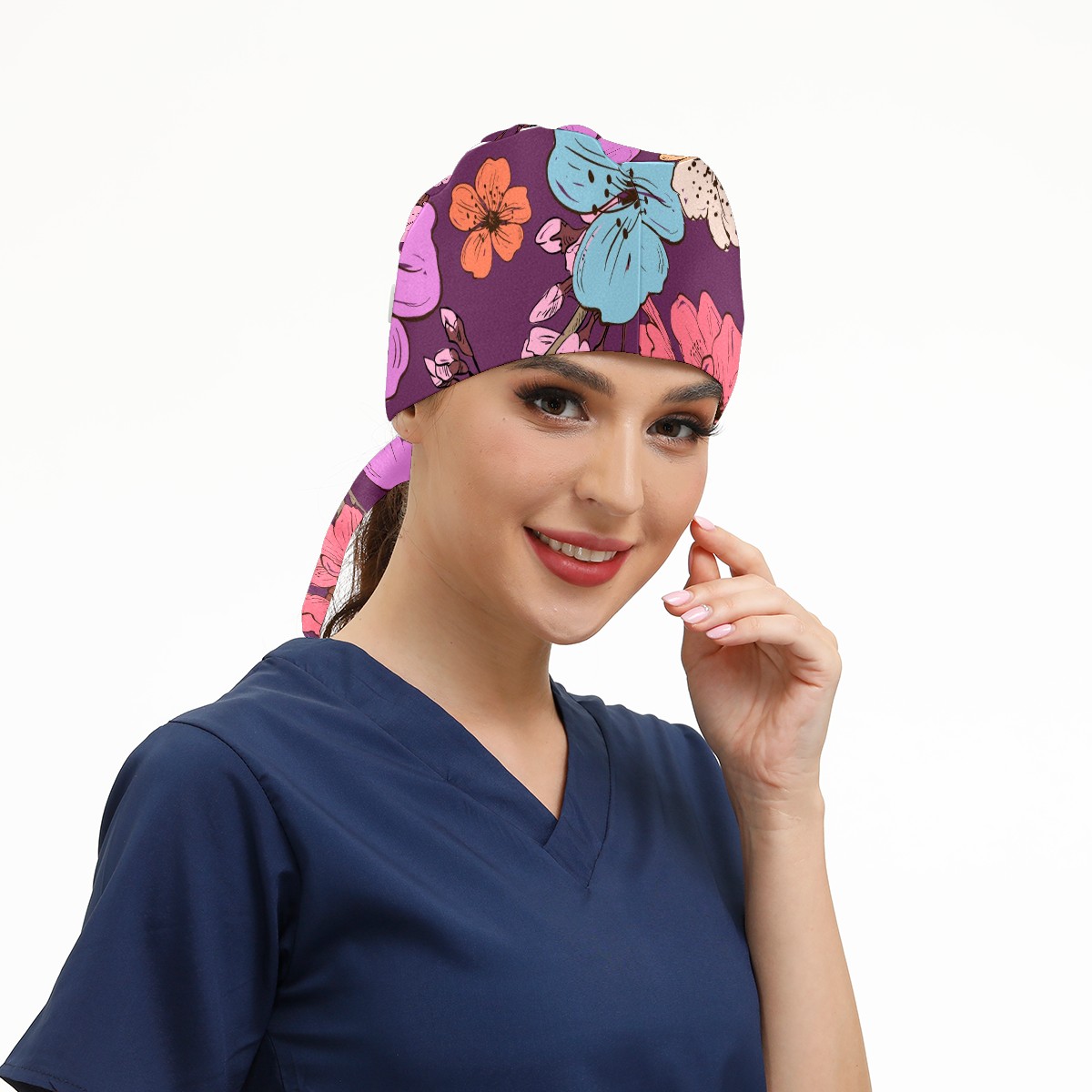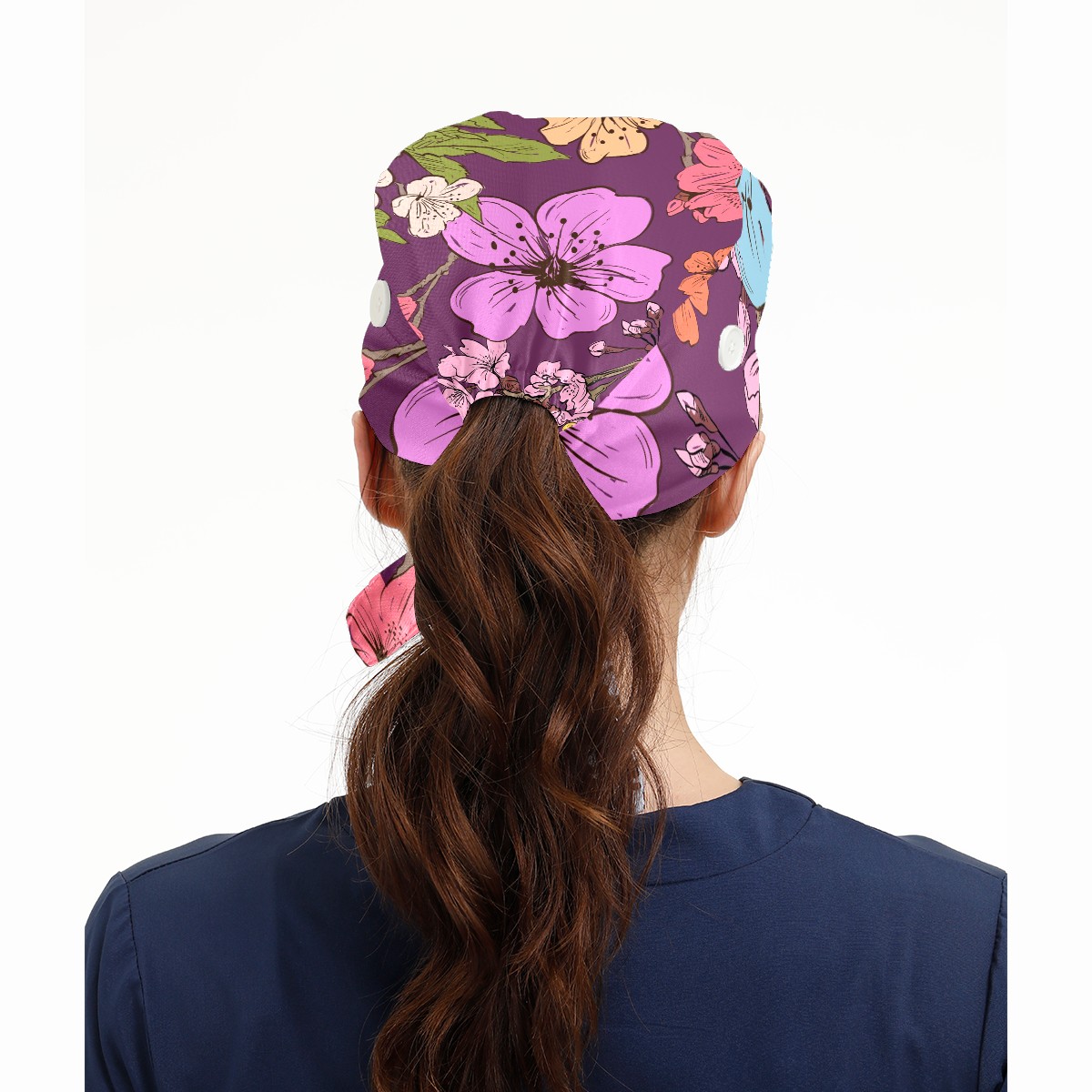 Working Caps with Button & Sweatband Satin Lined Cotton Adjustable Nurse Hats Elastic Band Scrub Cap Surgeon Hat Purple Flower