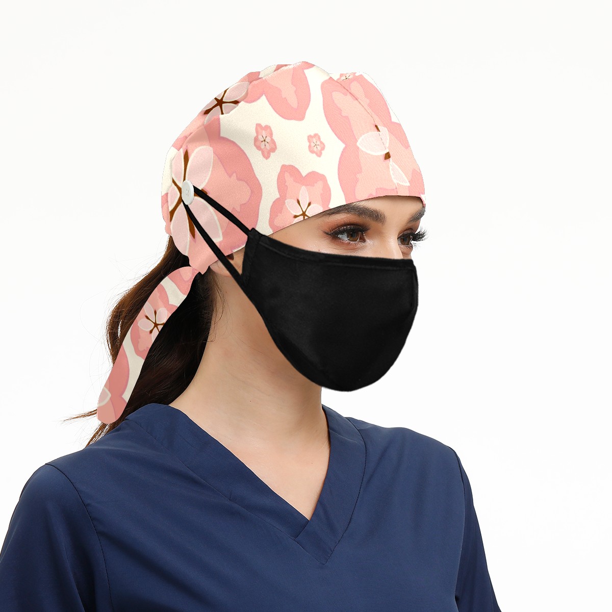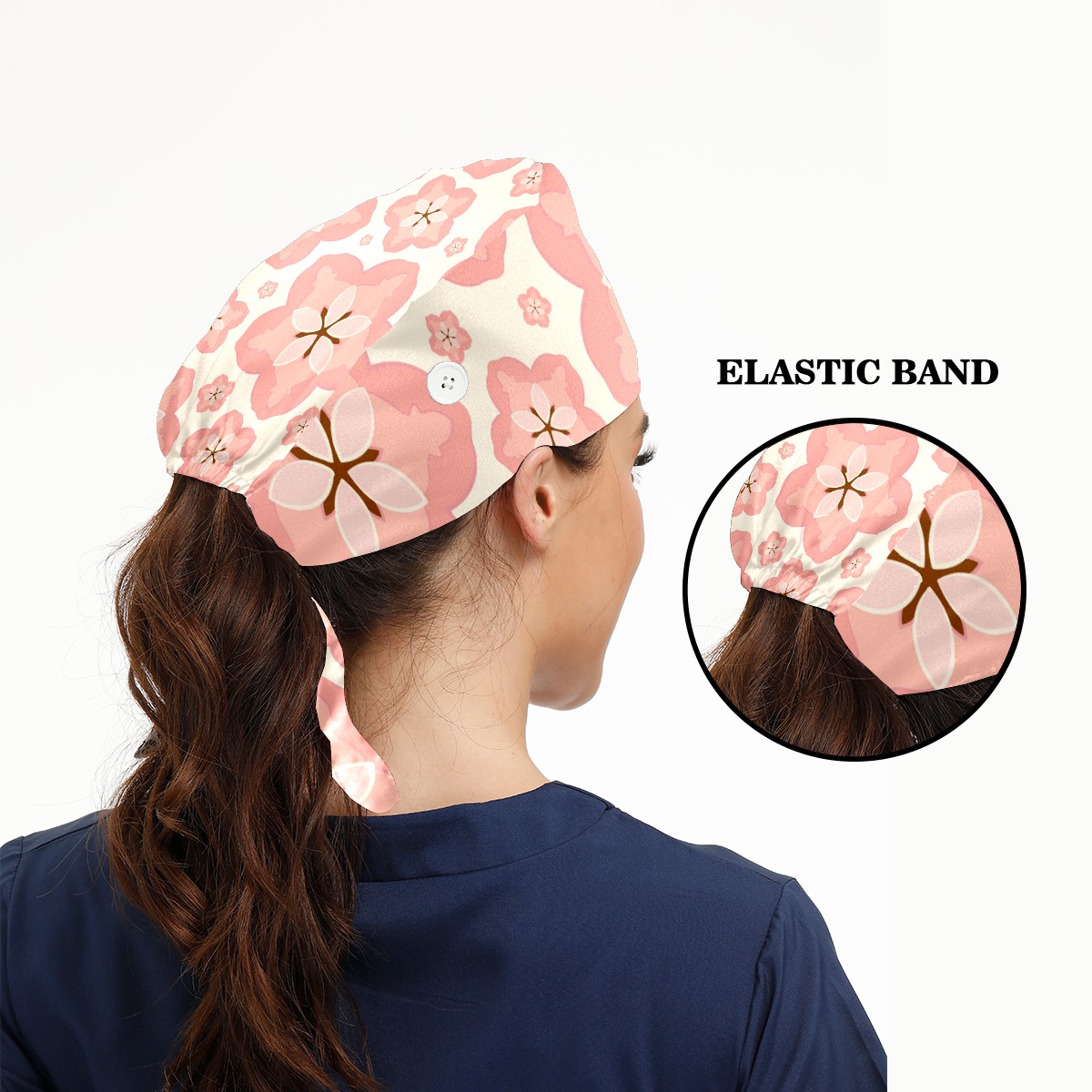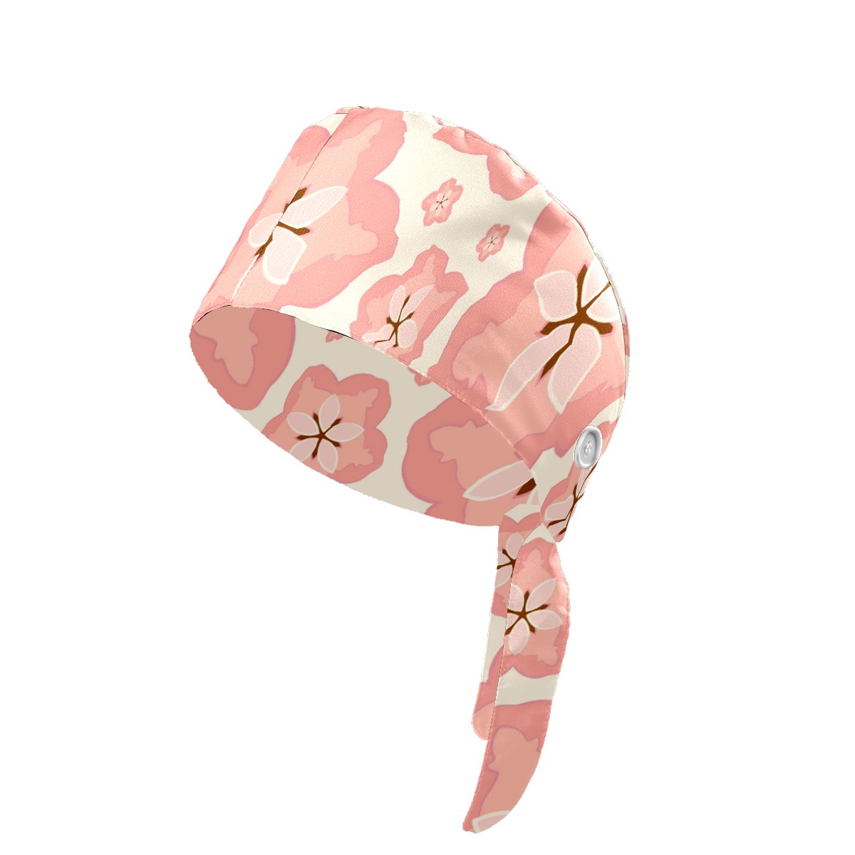 Working Caps with Button & Sweatband Satin Lined Cotton Adjustable Nurse Hats Elastic Band Scrub Cap Surgeon Hat Sakura Flowers On Light Pastel Peach Background