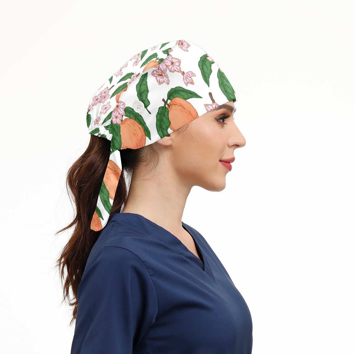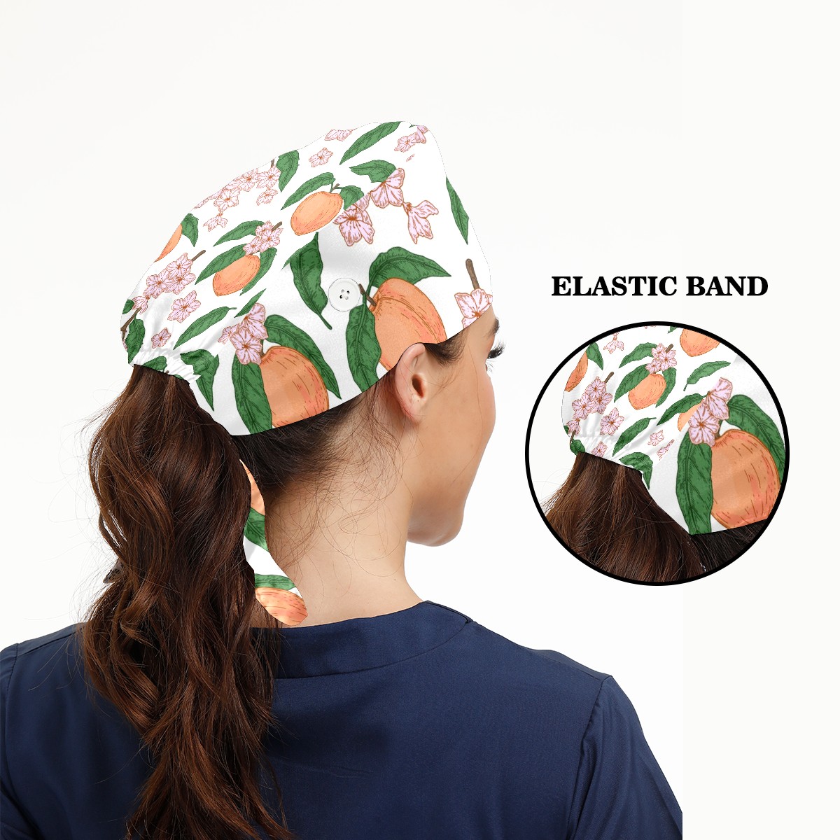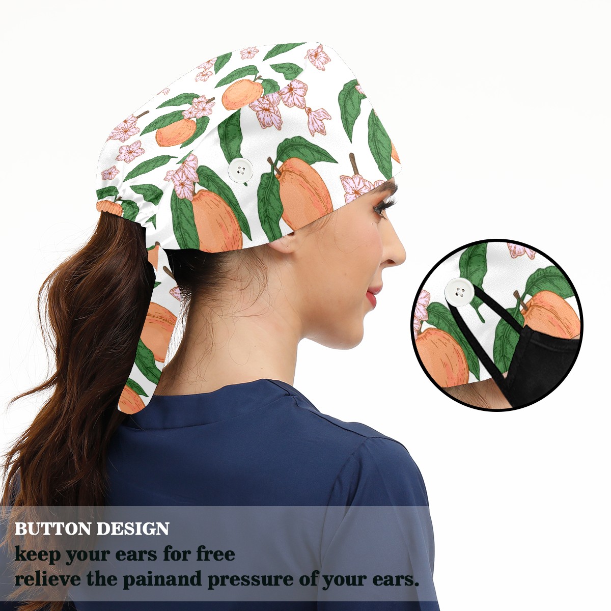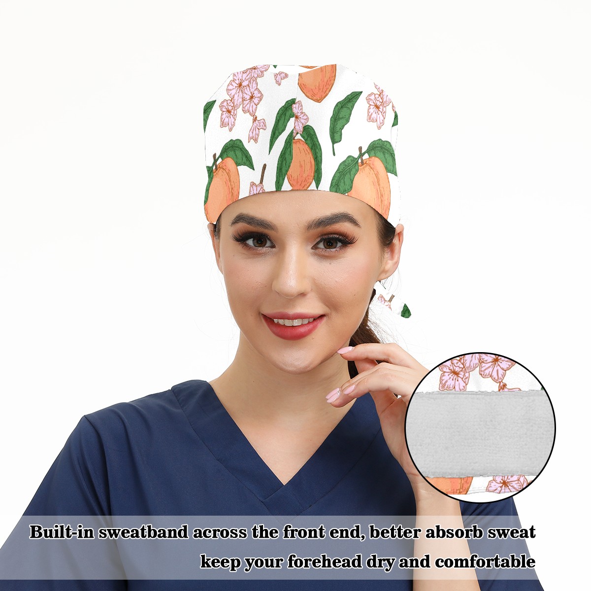 Working Caps with Button & Sweatband Satin Lined Cotton Adjustable Nurse Hats Elastic Band Scrub Cap Surgeon Hat Hand Drawn Peach Flower