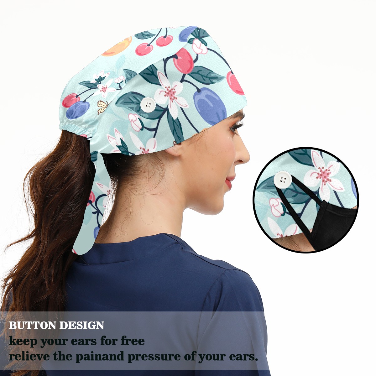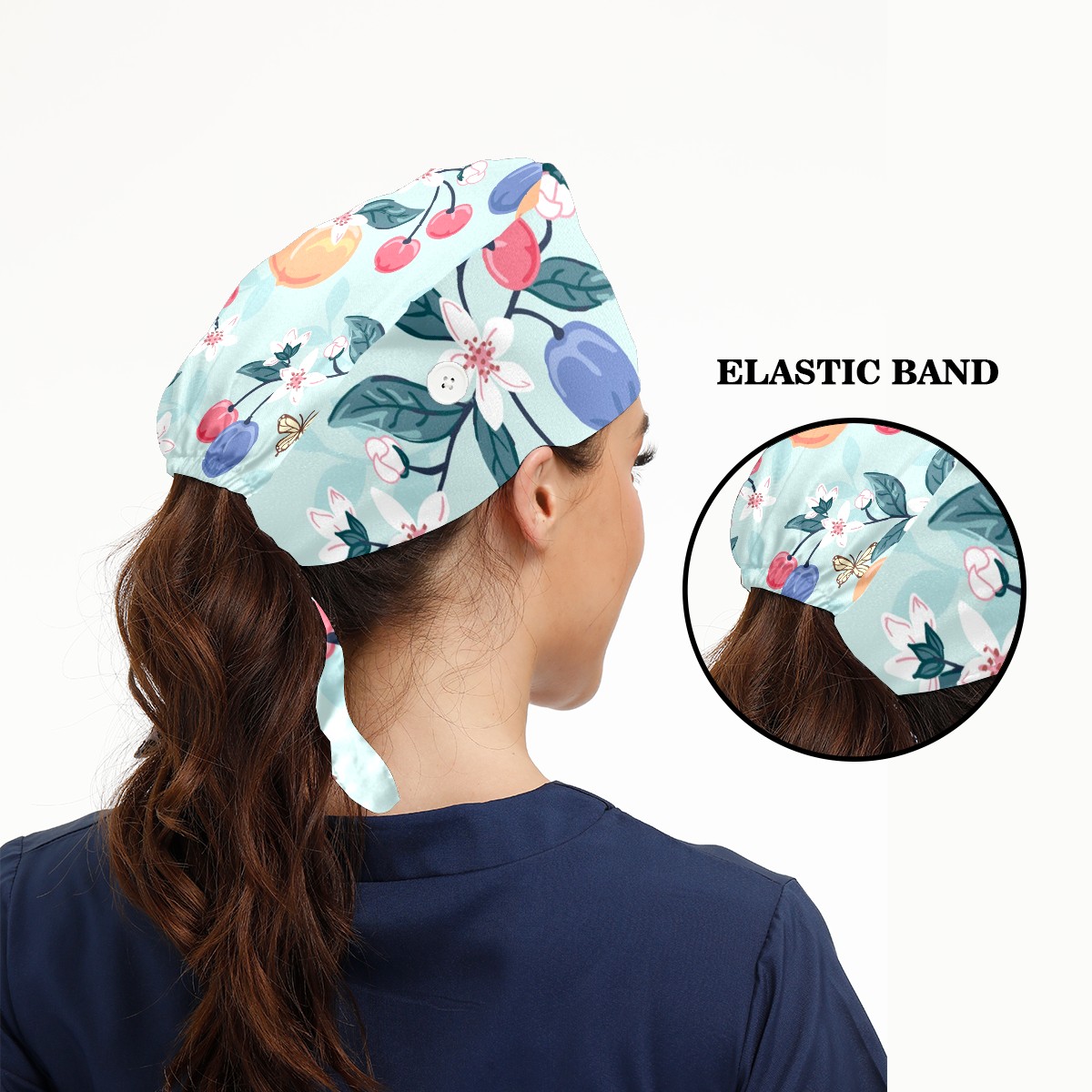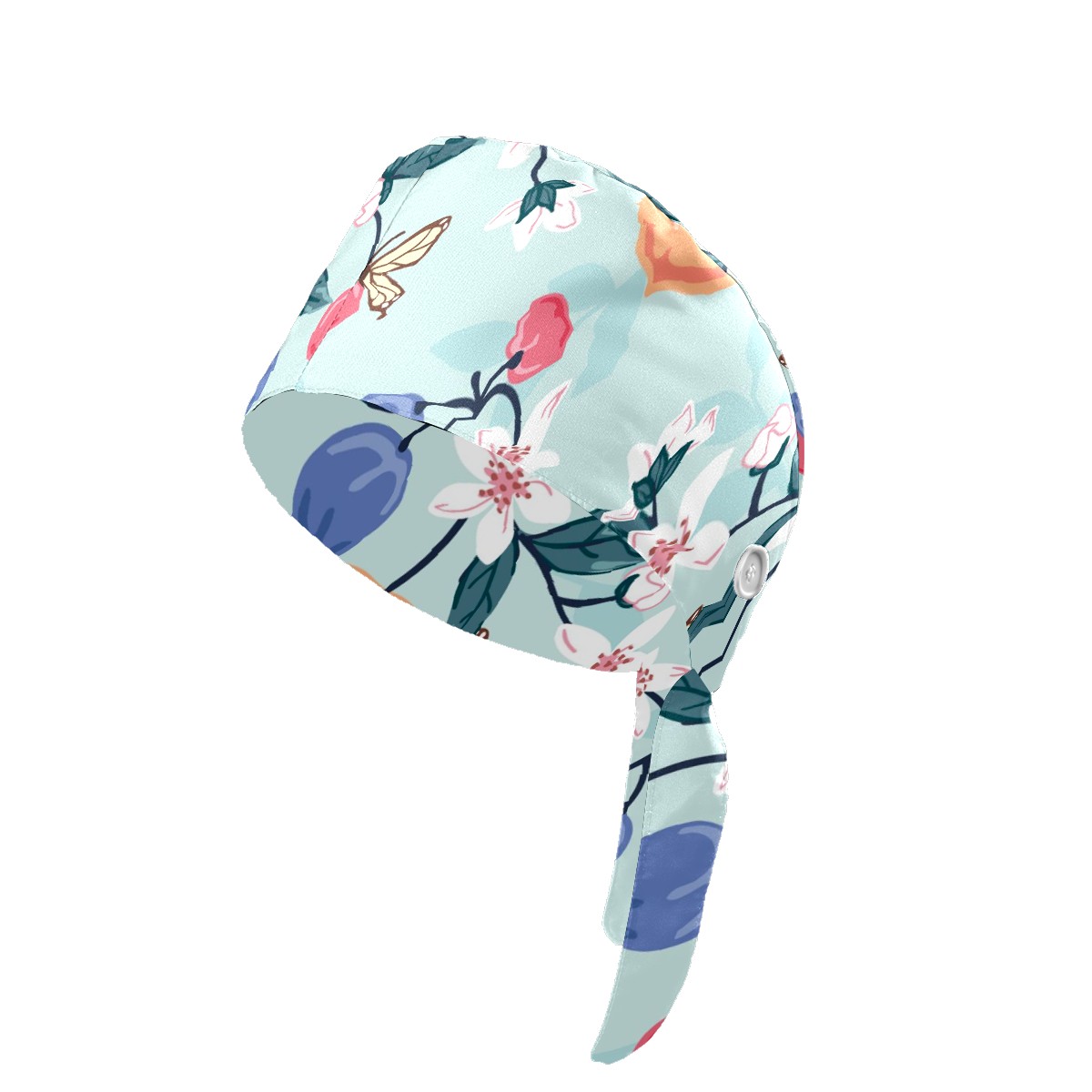 Working Caps with Button & Sweatband Satin Lined Cotton Adjustable Nurse Hats Elastic Band Scrub Cap Surgeon Hat Peach Cherry Butterfly Flower