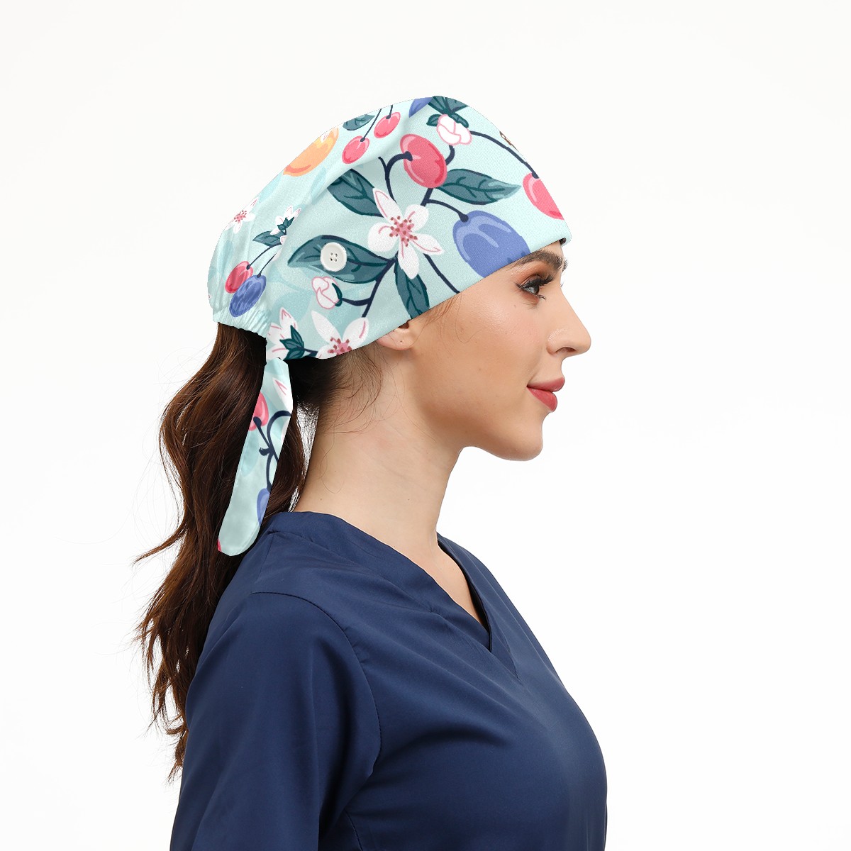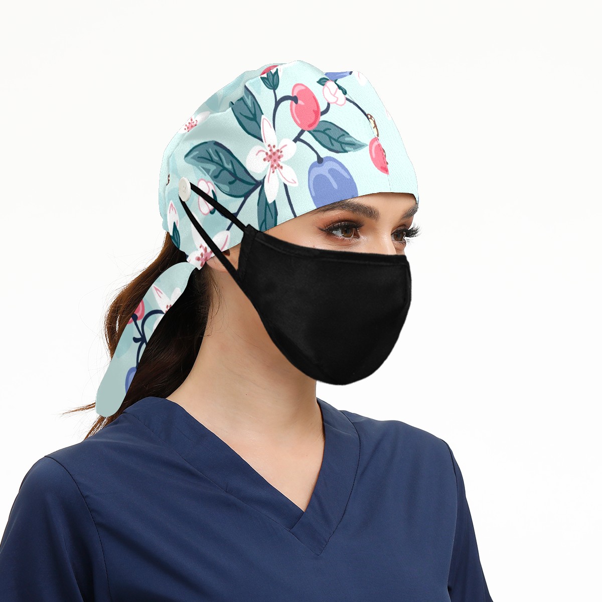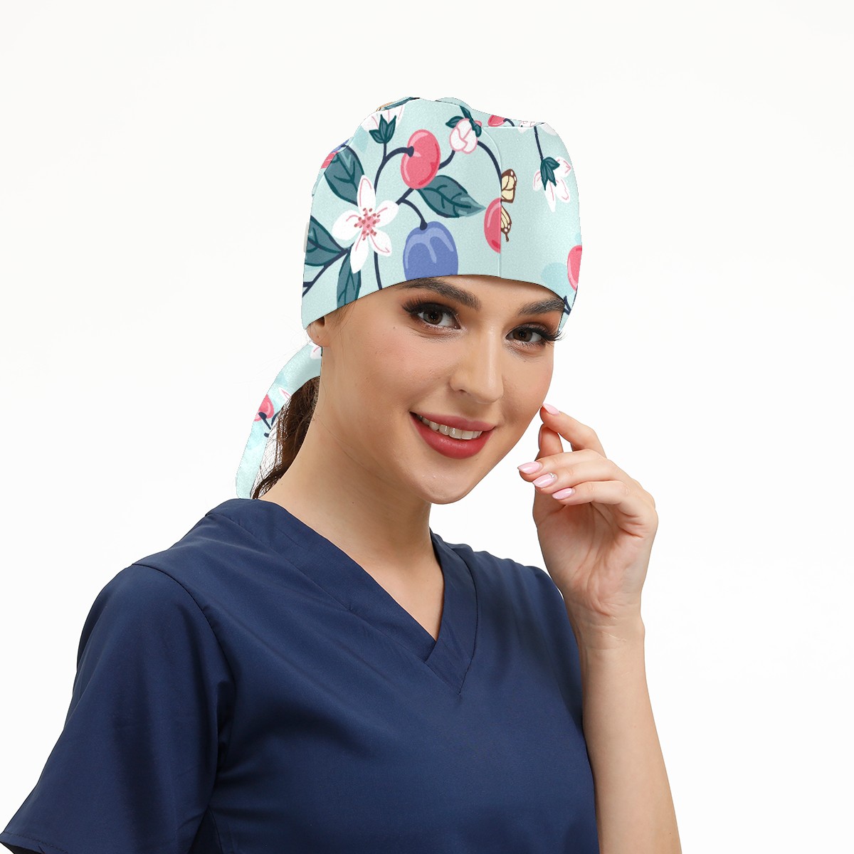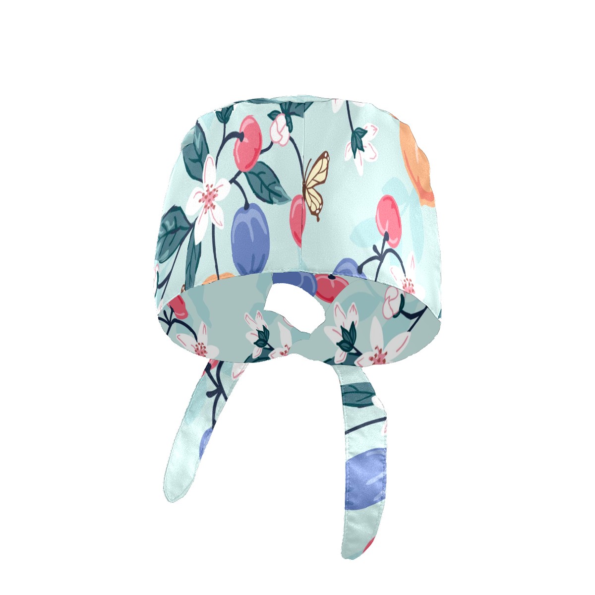 Working Caps with Button & Sweatband Satin Lined Cotton Adjustable Nurse Hats Elastic Band Scrub Cap Surgeon Hat Peach Cherry Butterfly Flower