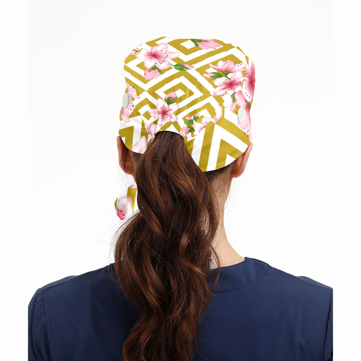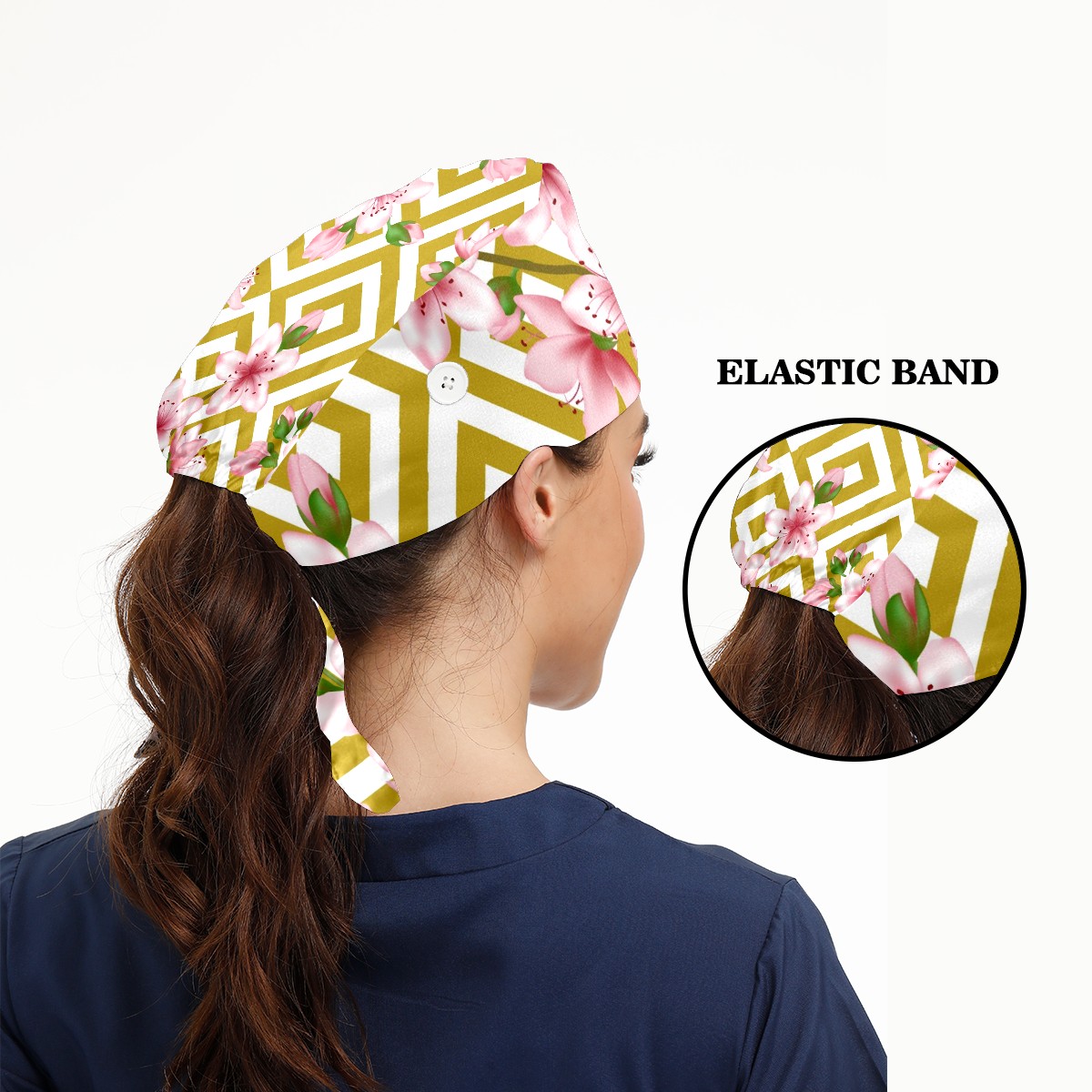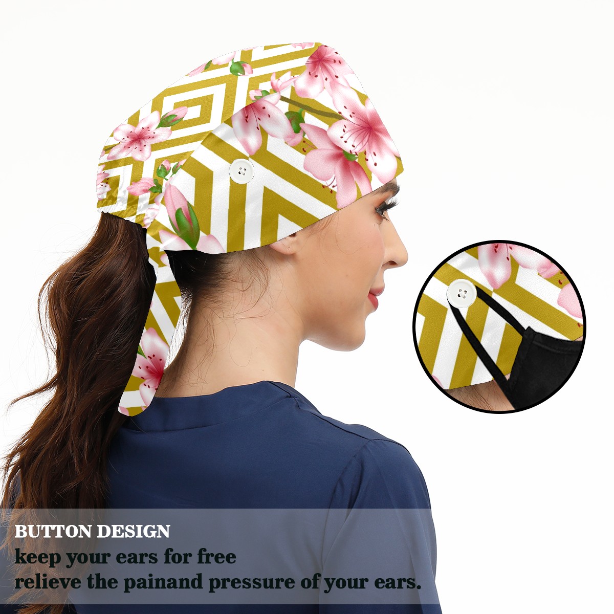 Working Caps with Button & Sweatband Satin Lined Cotton Adjustable Nurse Hats Elastic Band Scrub Cap Surgeon Hat Pink Cherry Blossom Geometric