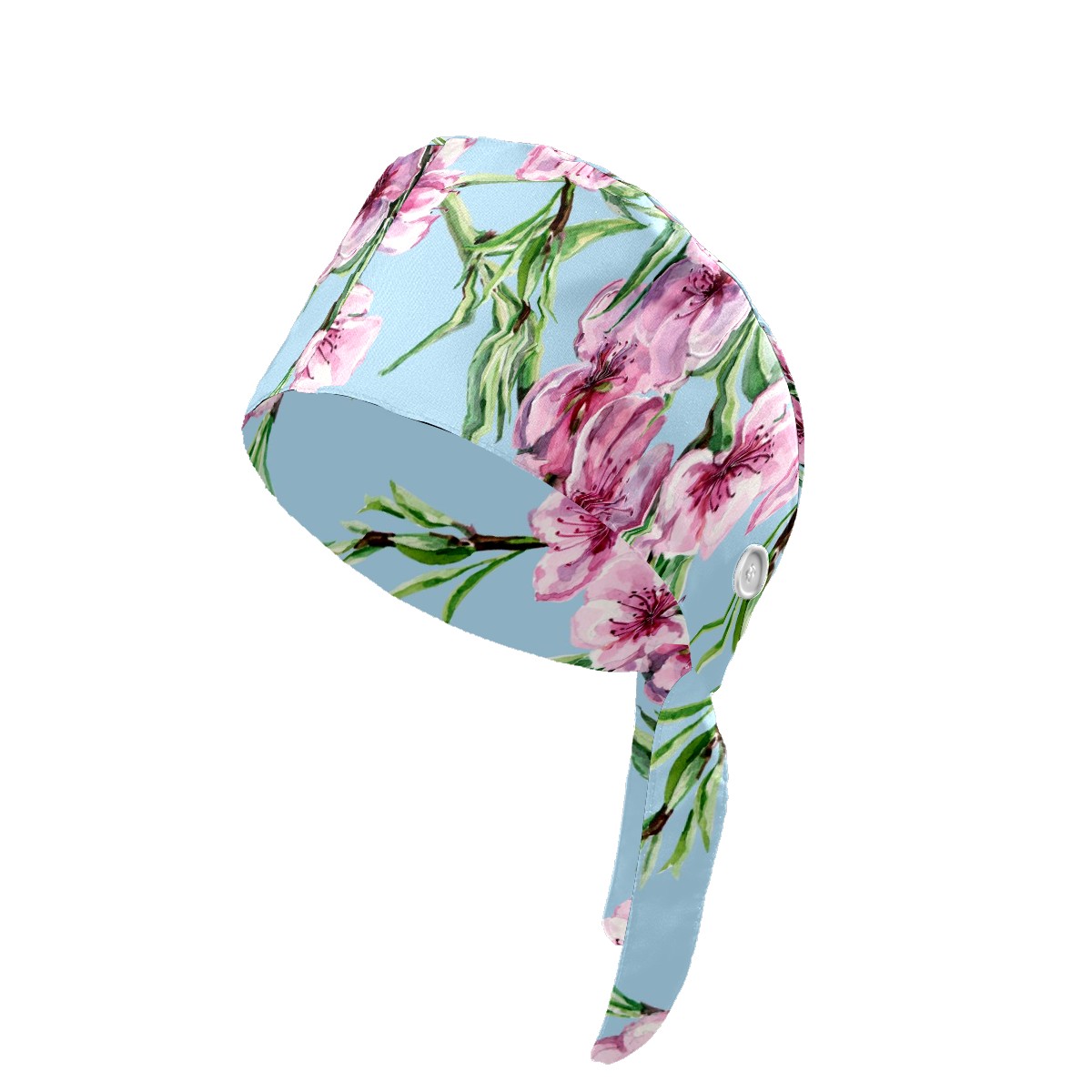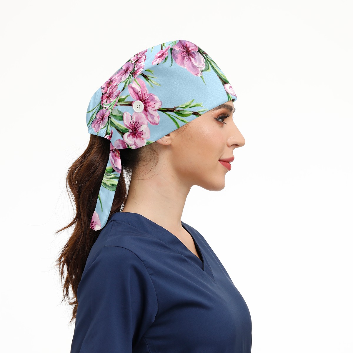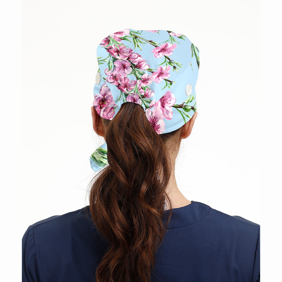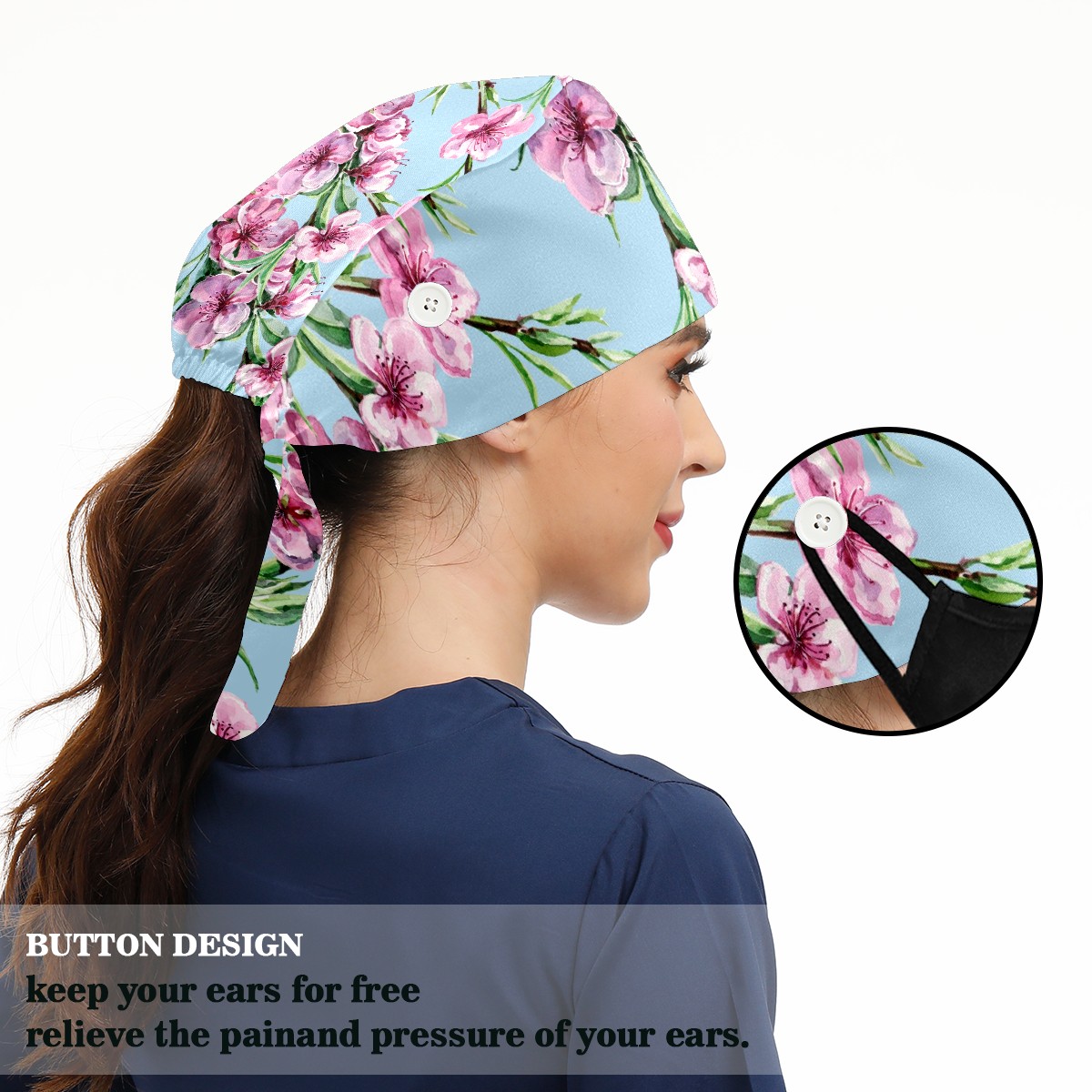Working Caps with Button & Sweatband Satin Lined Cotton Adjustable Nurse Hats Elastic Band Scrub Cap Surgeon Hat Blossoming Peach Flower