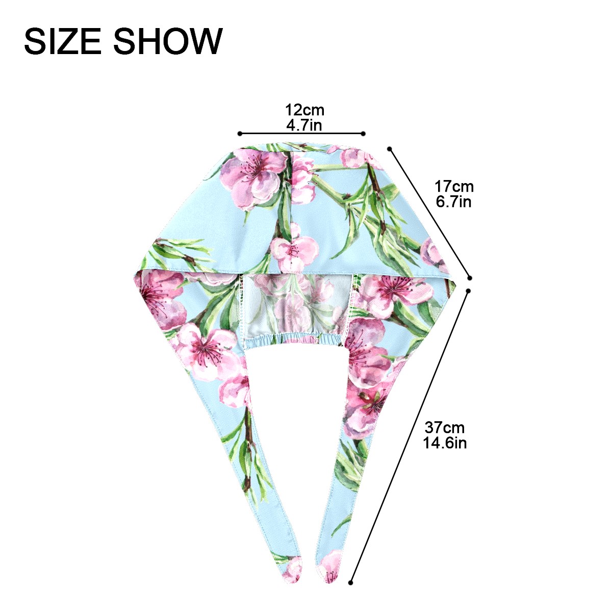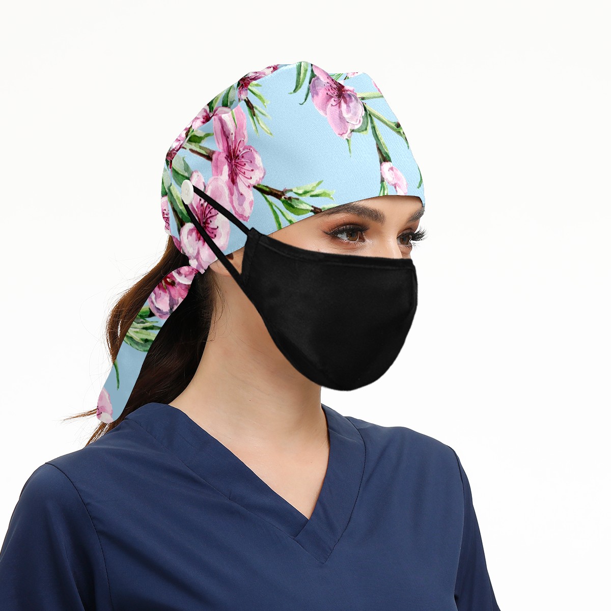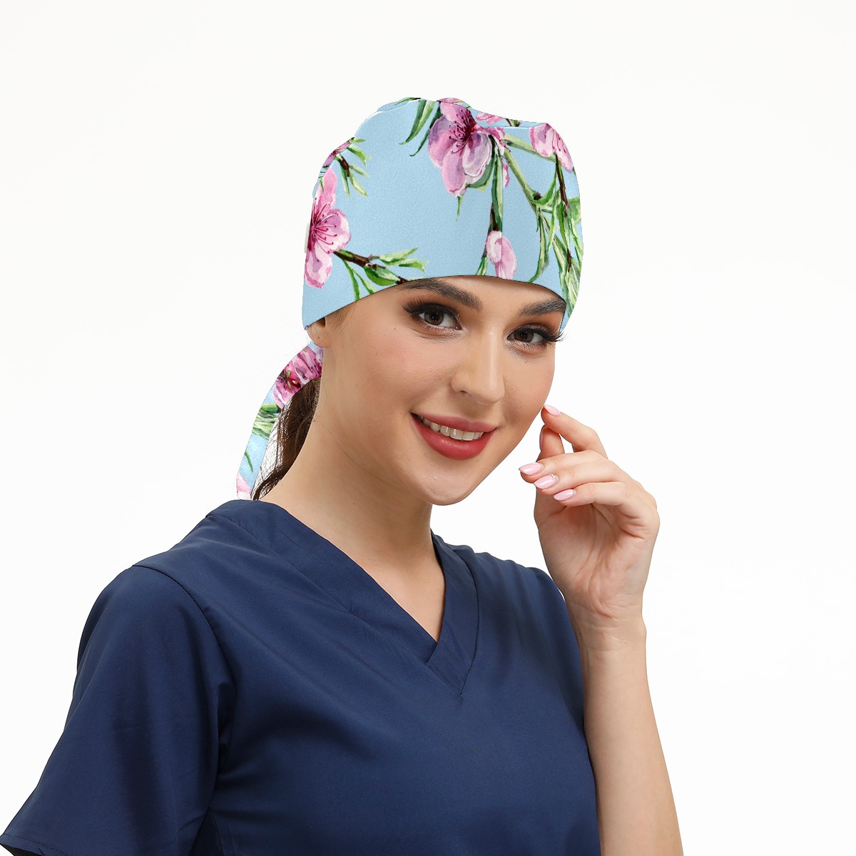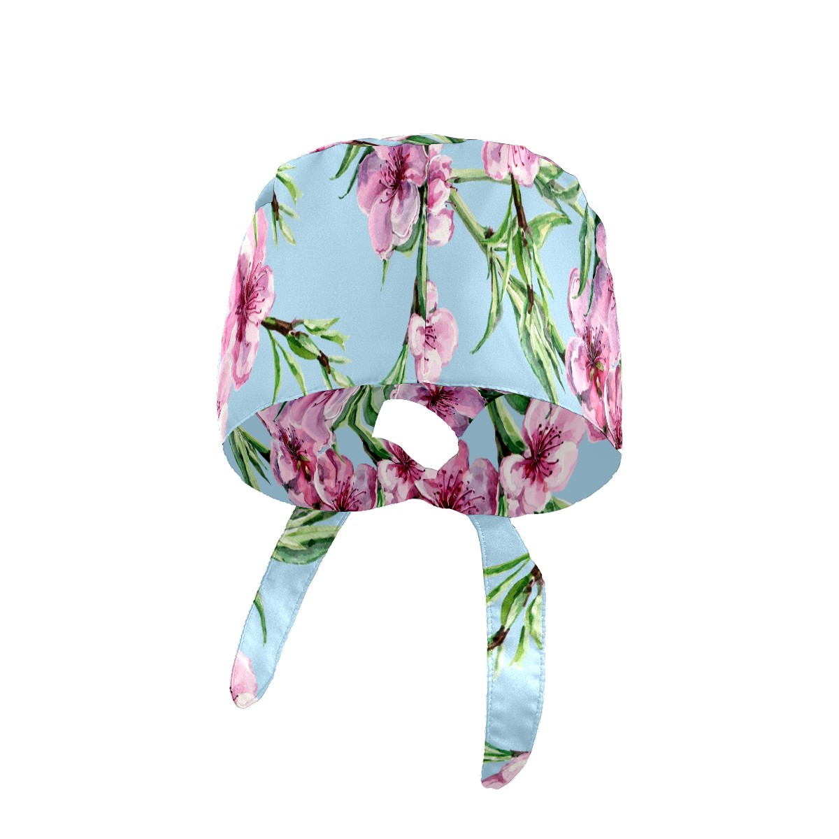 Working Caps with Button & Sweatband Satin Lined Cotton Adjustable Nurse Hats Elastic Band Scrub Cap Surgeon Hat Blossoming Peach Flower