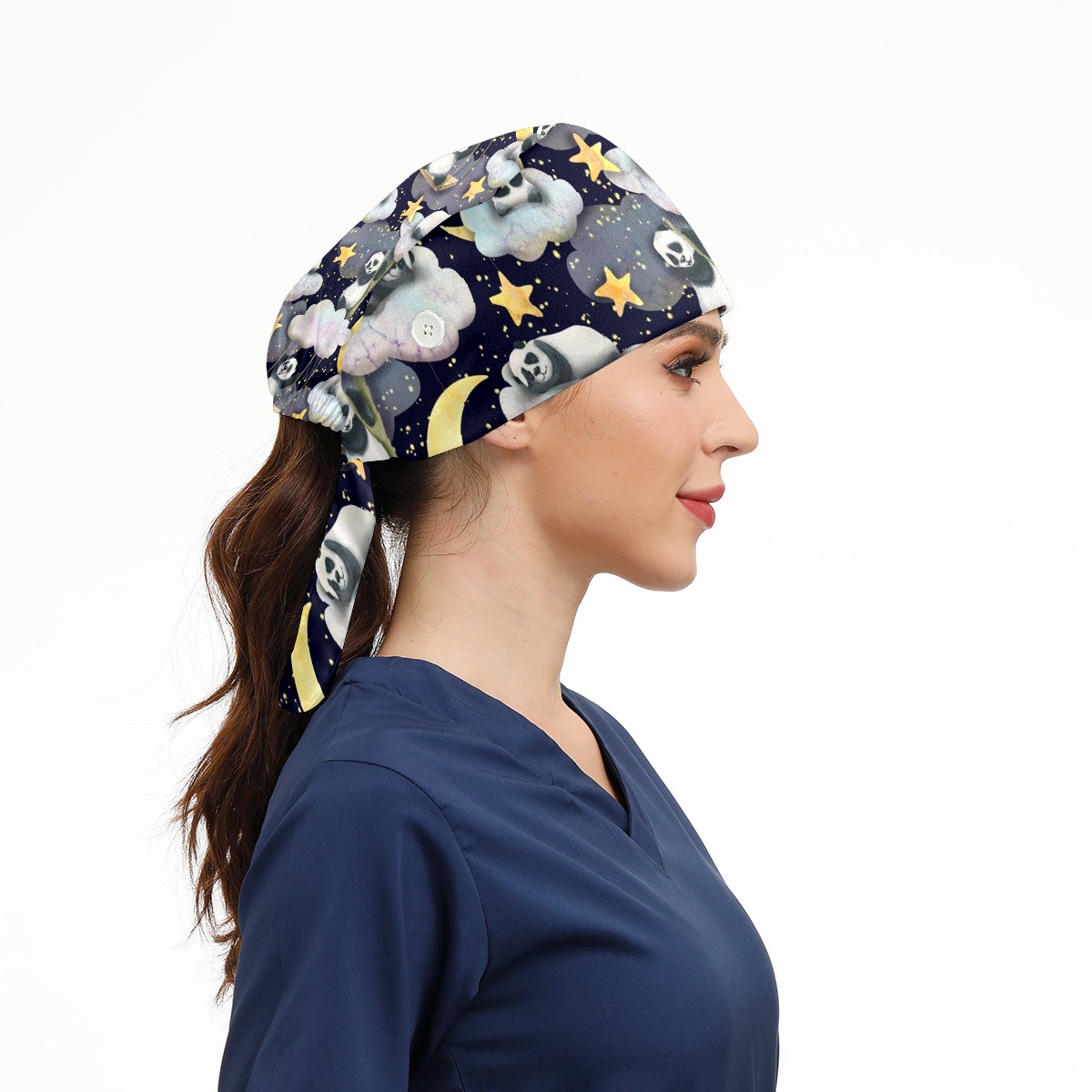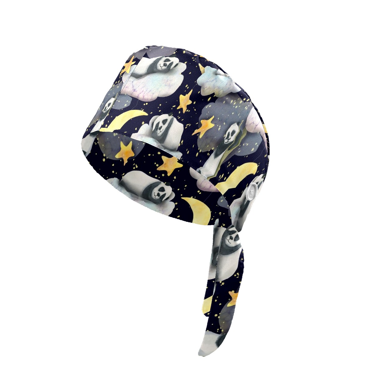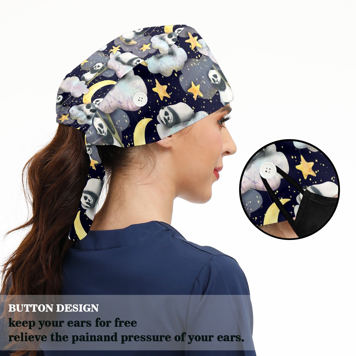 Working Caps with Button & Sweatband Satin Lined Cotton Adjustable Nurse Hats Elastic Band Scrub Cap Surgeon Hat Panda Moon Star