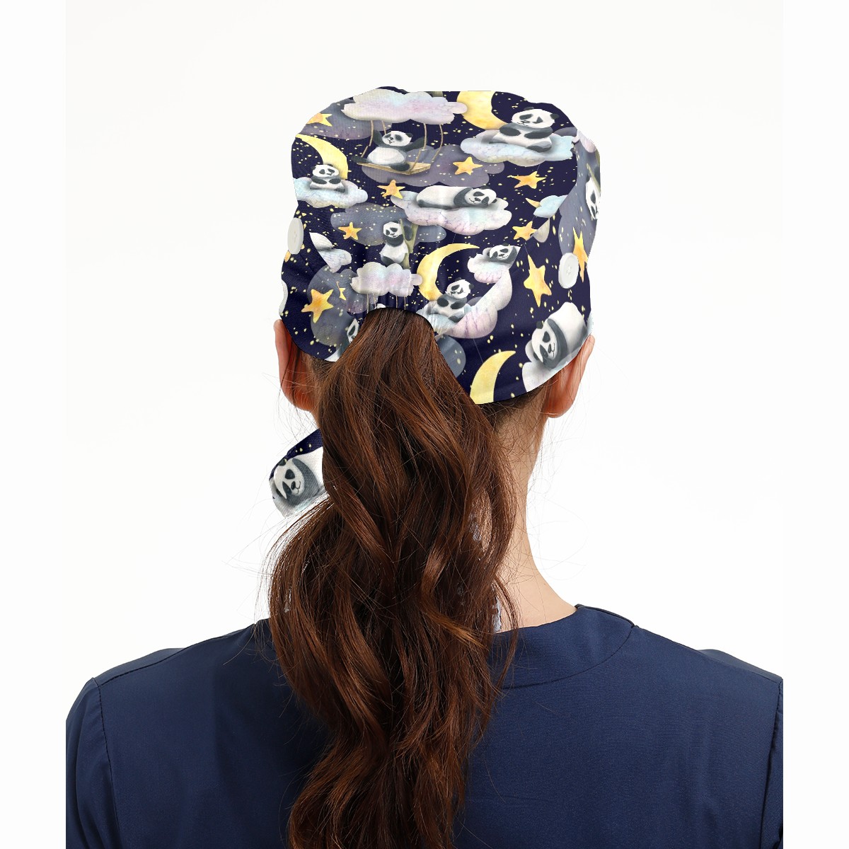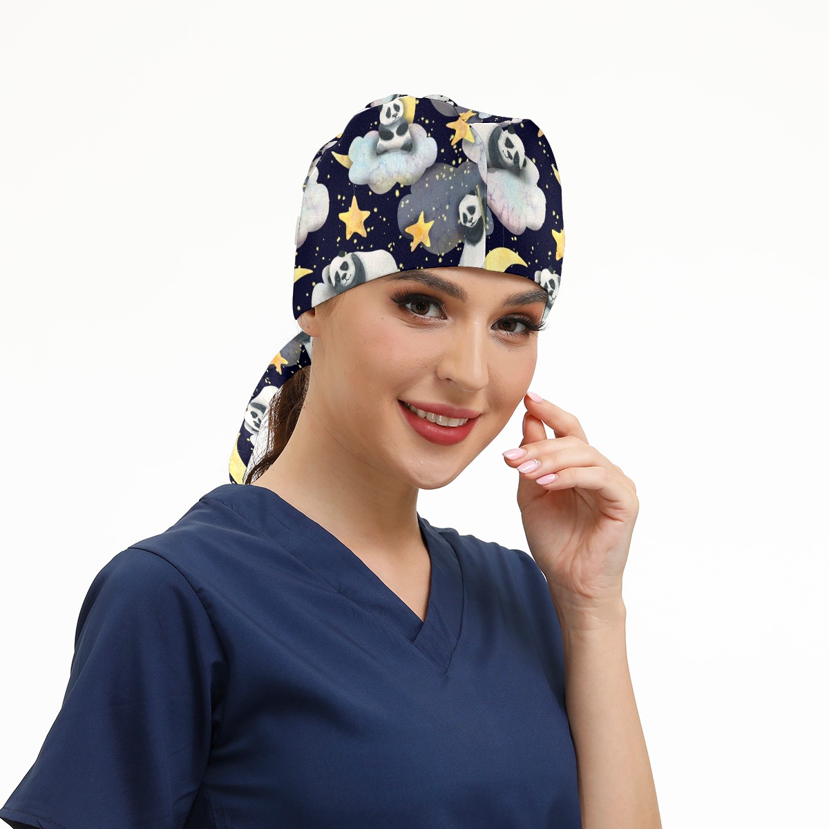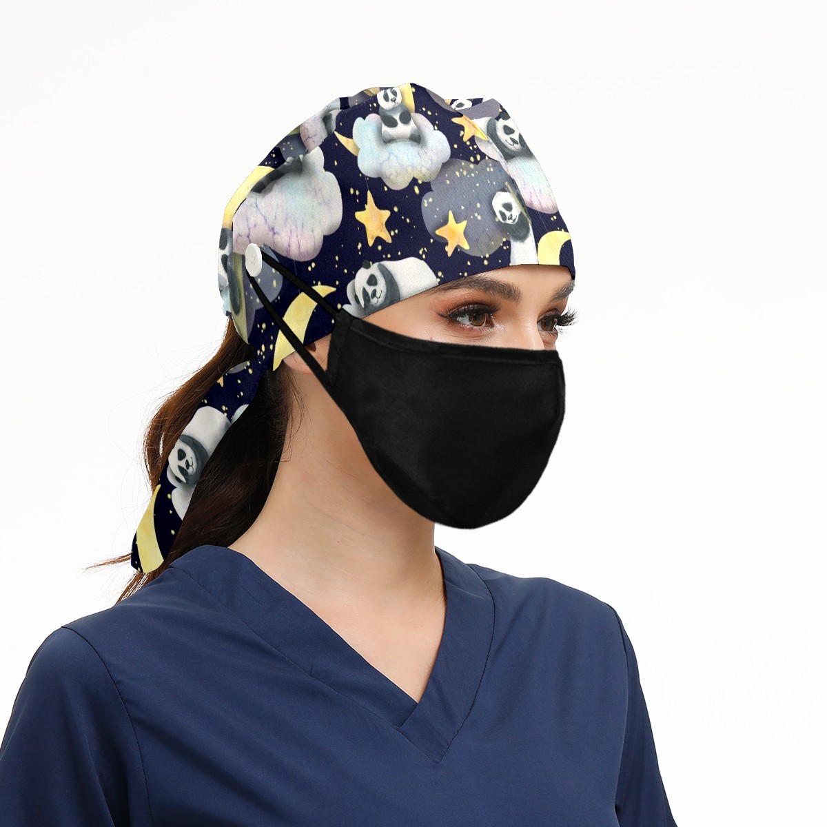 Working Caps with Button & Sweatband Satin Lined Cotton Adjustable Nurse Hats Elastic Band Scrub Cap Surgeon Hat Panda Moon Star