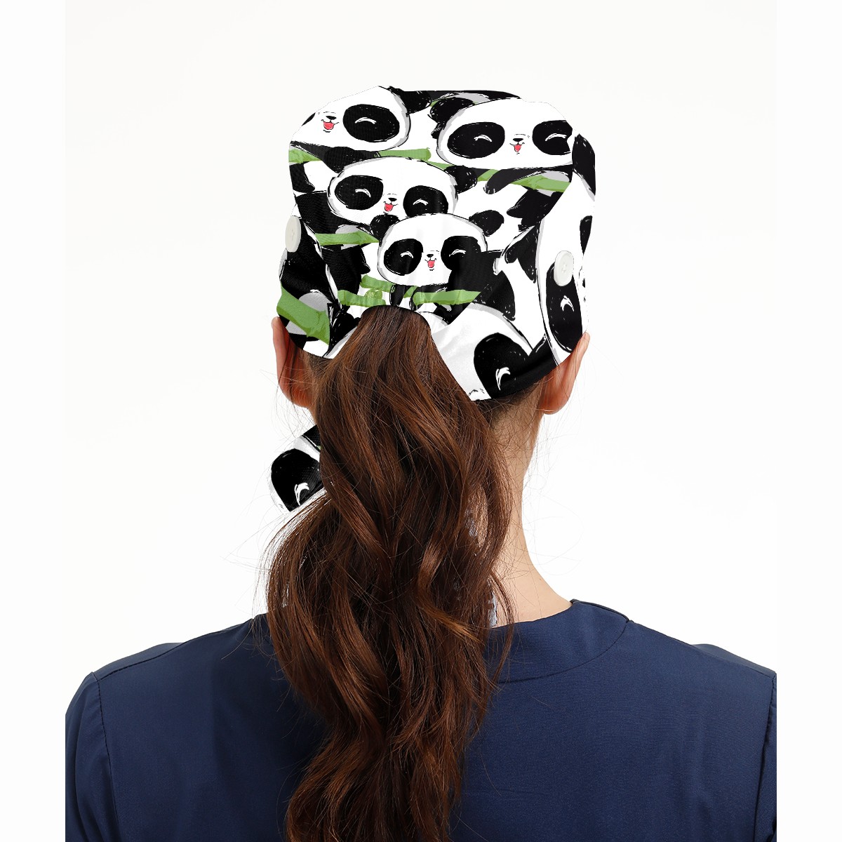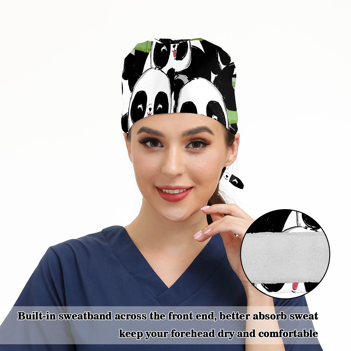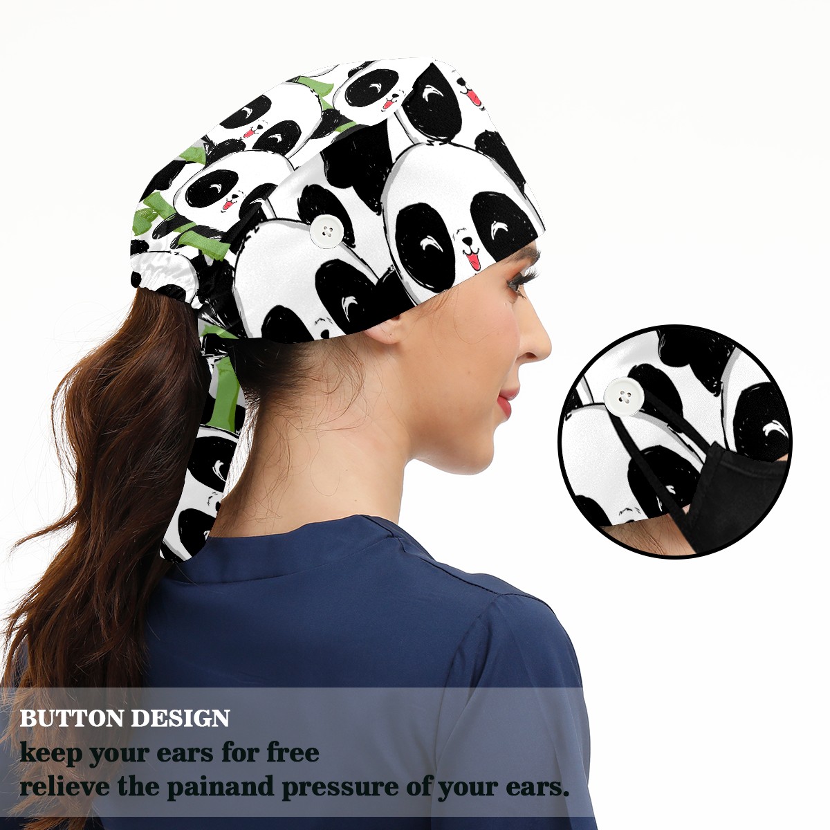 Working Caps with Button & Sweatband Satin Lined Cotton Adjustable Nurse Hats Elastic Band Scrub Cap Surgeon Hat Cute Panda