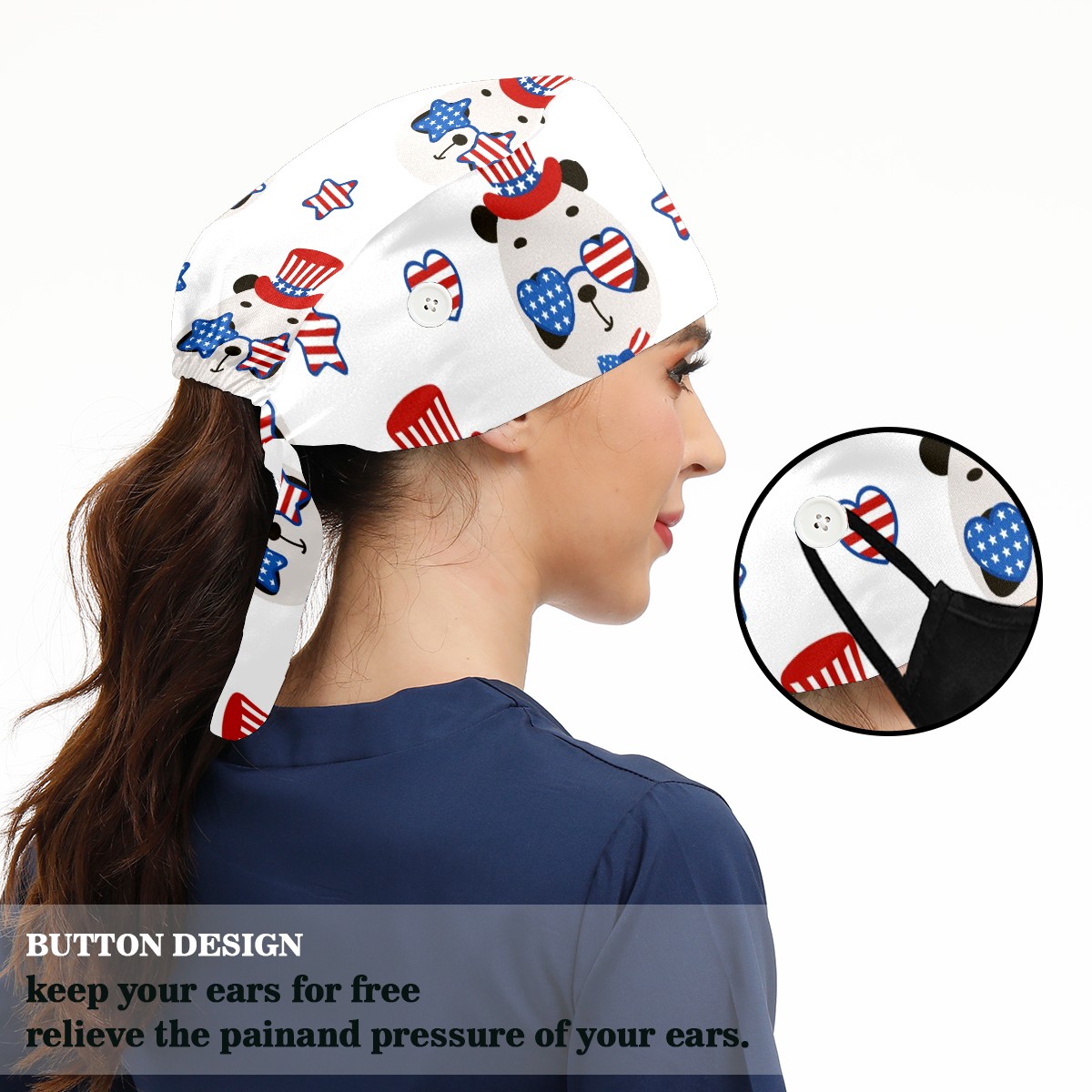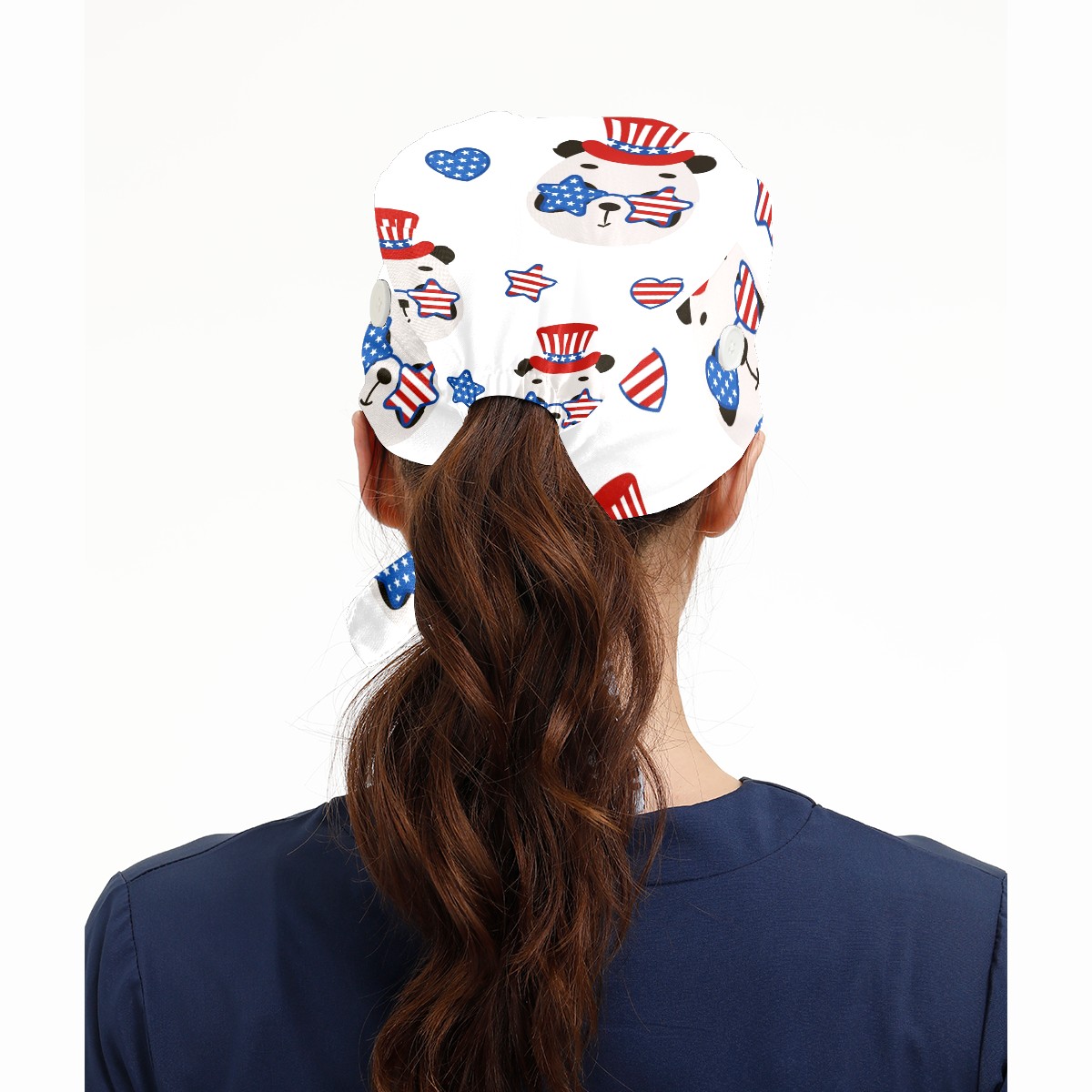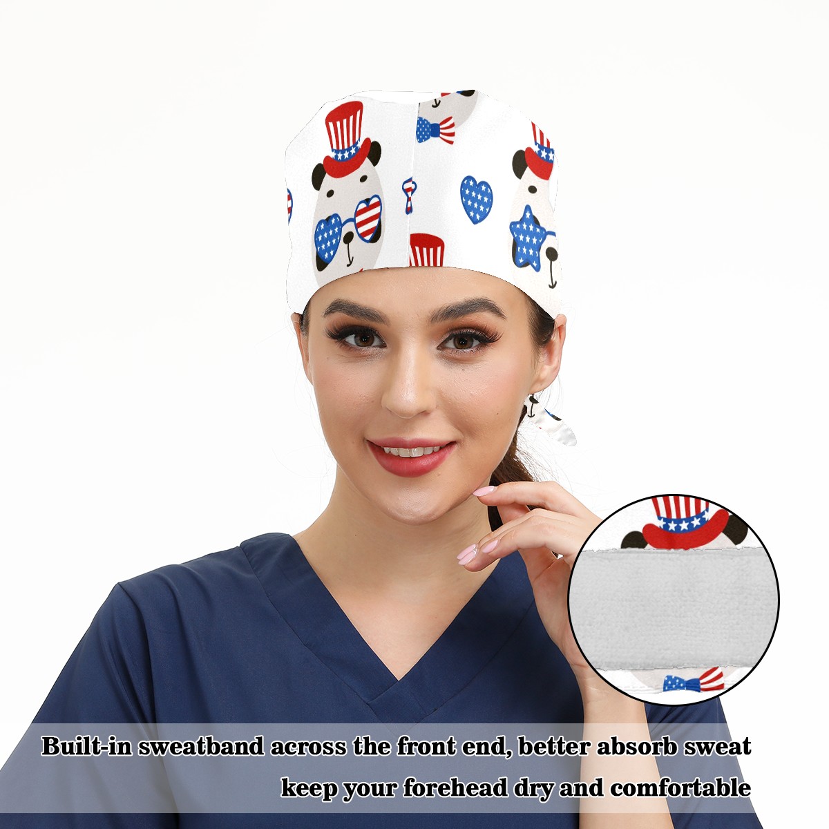 Working Caps with Button & Sweatband Satin Lined Cotton Adjustable Nurse Hats Elastic Band Scrub Cap Surgeon Hat Cute Panda USA Patriotic Hat