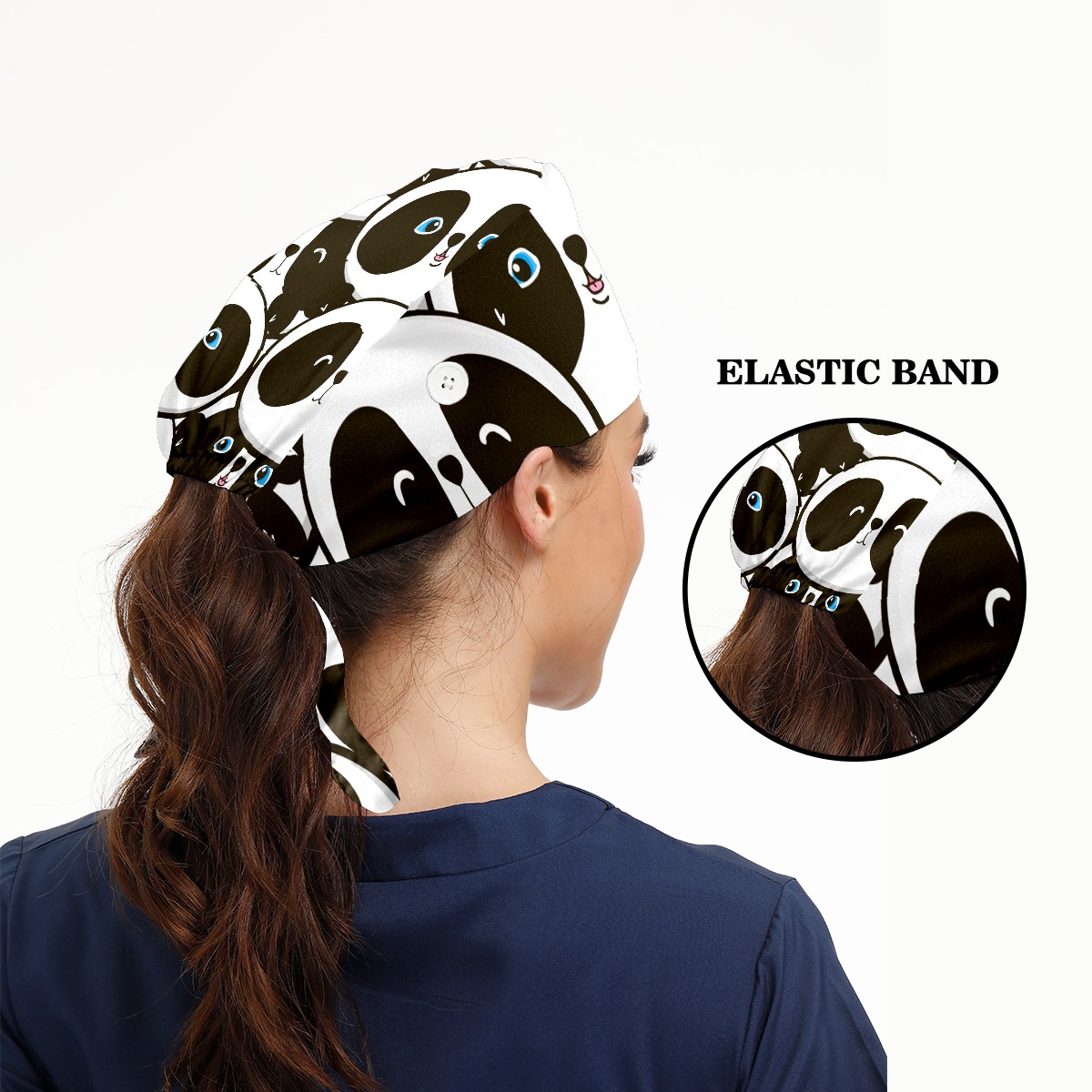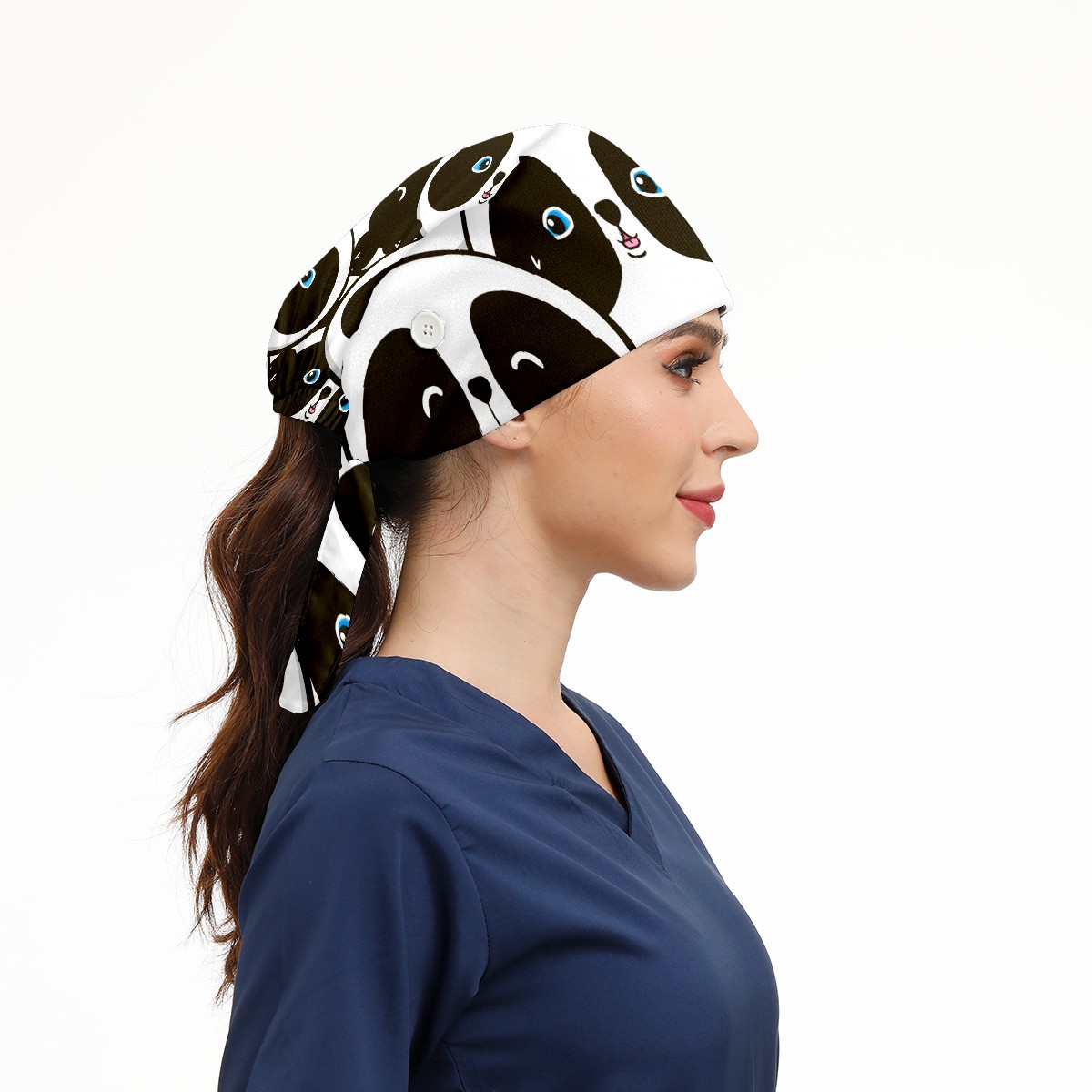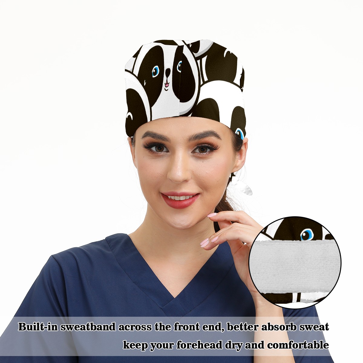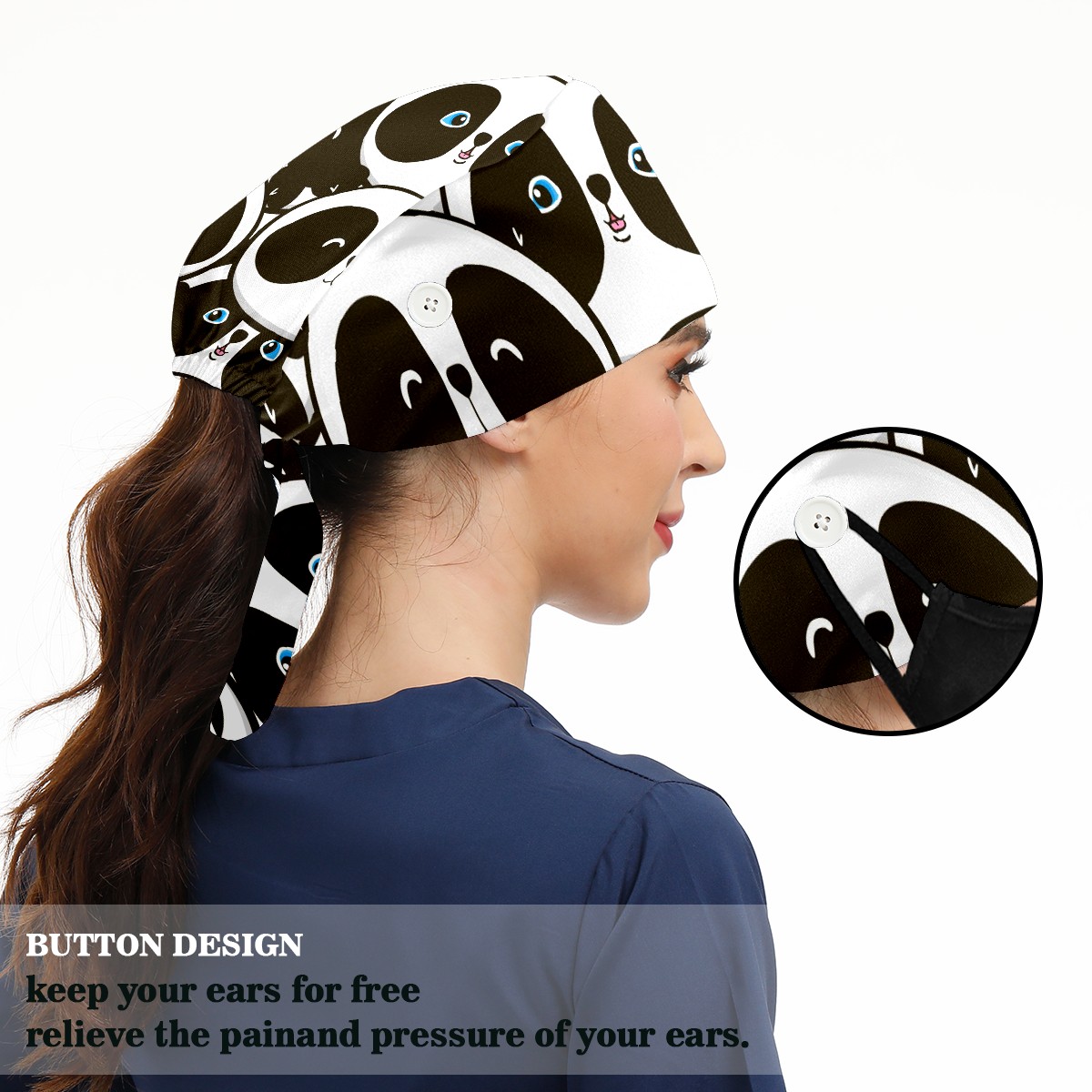 Working Caps with Button & Sweatband Satin Lined Cotton Adjustable Nurse Hats Elastic Band Scrub Cap Surgeon Hat Cute Panda Baby