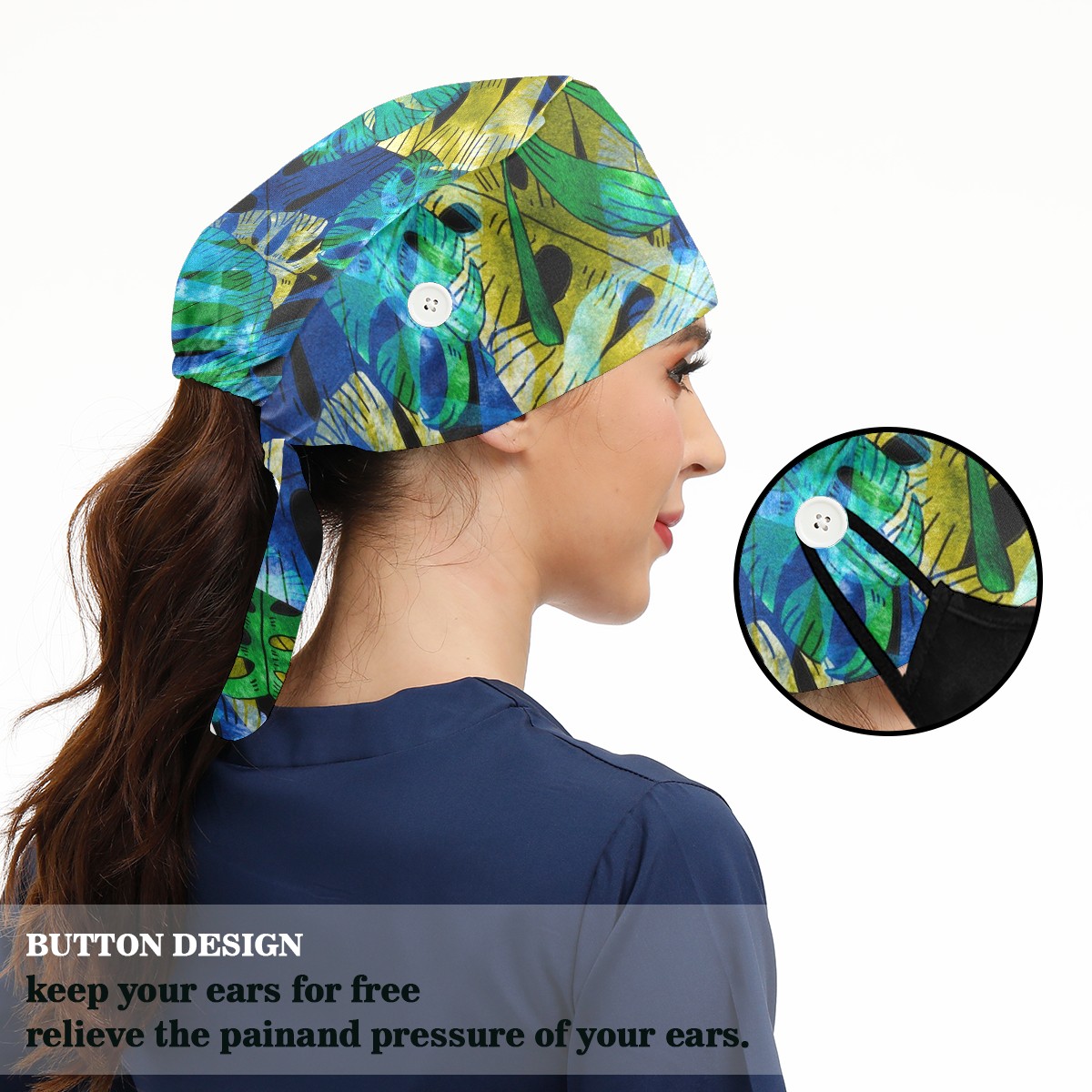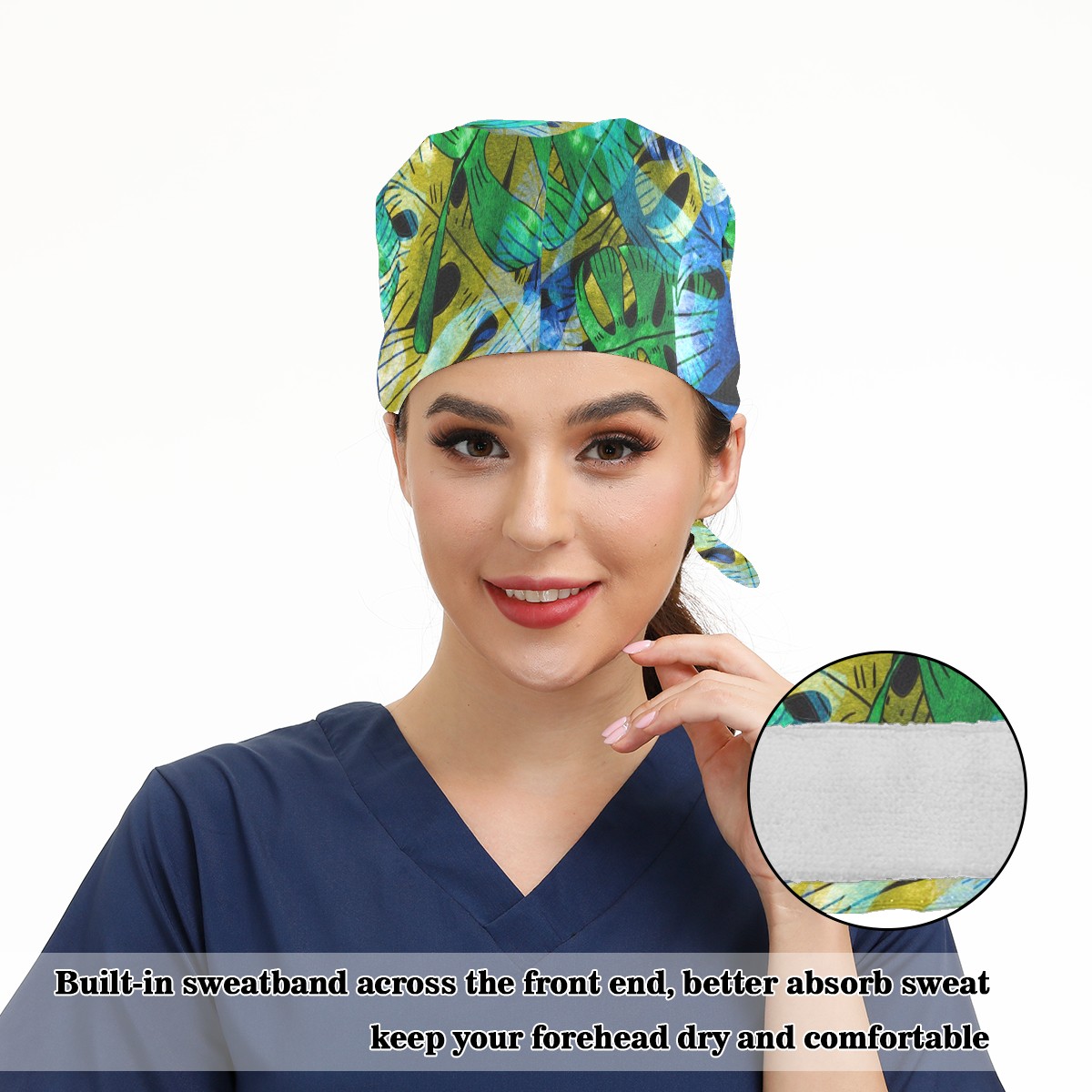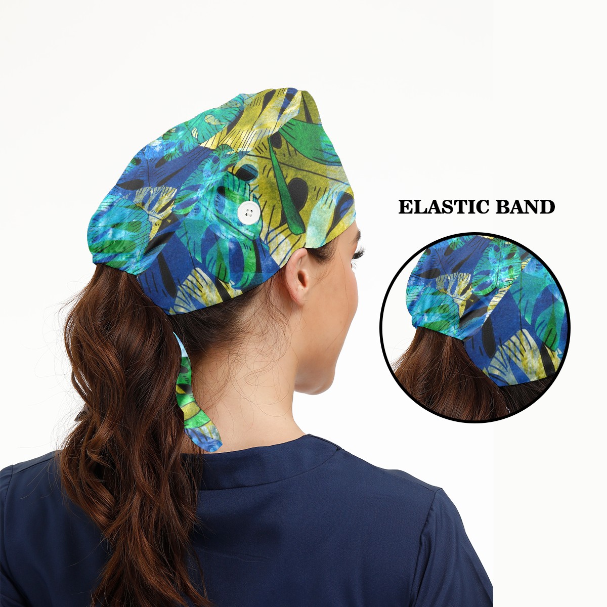 Working Caps with Button & Sweatband Satin Lined Cotton Adjustable Nurse Hats Elastic Band Scrub Cap Surgeon Hat Exotic Leaves