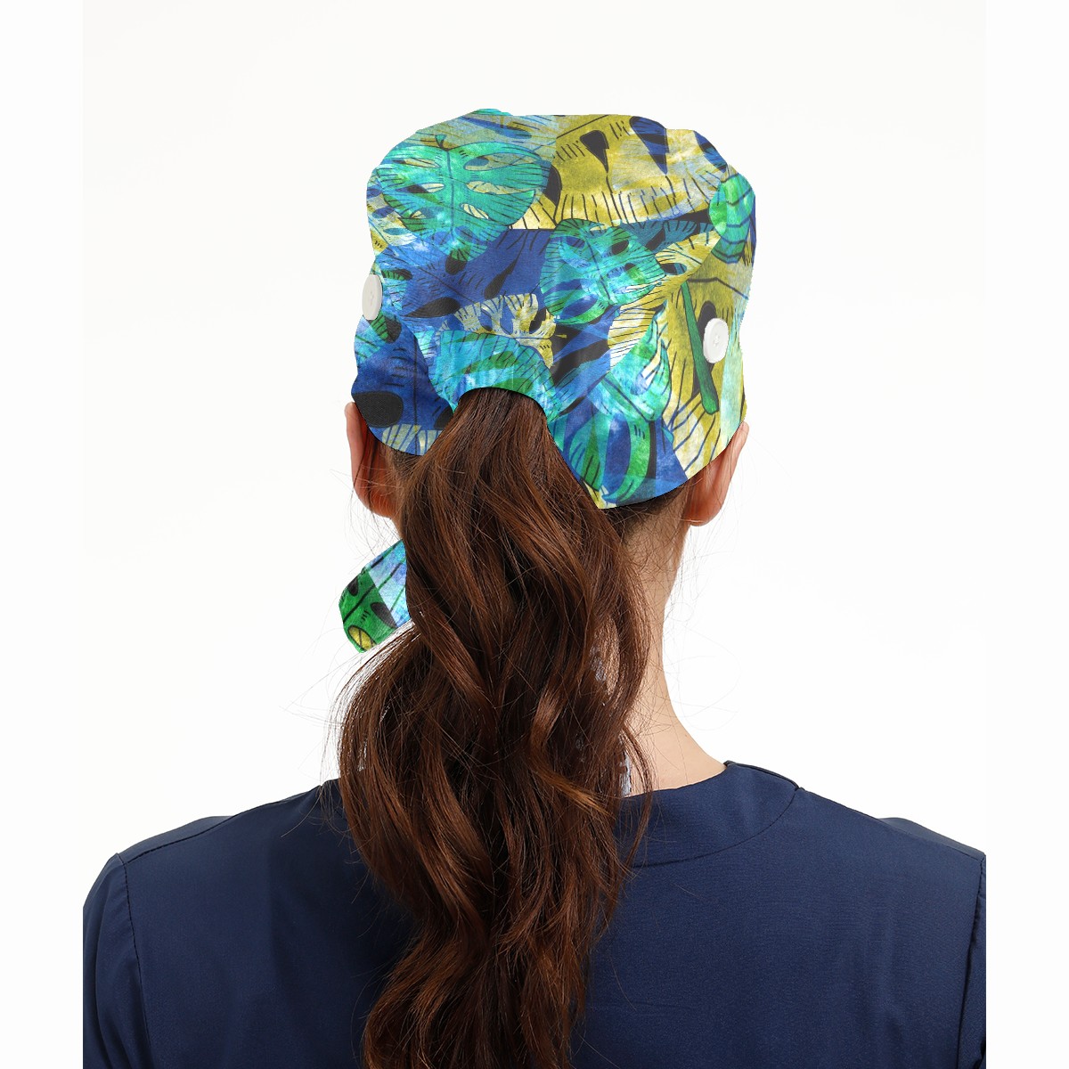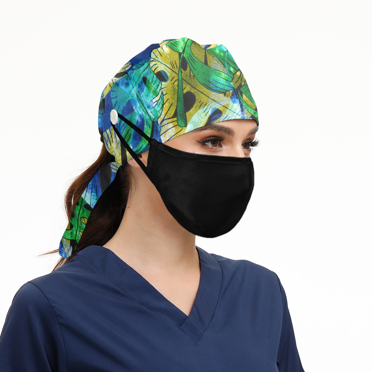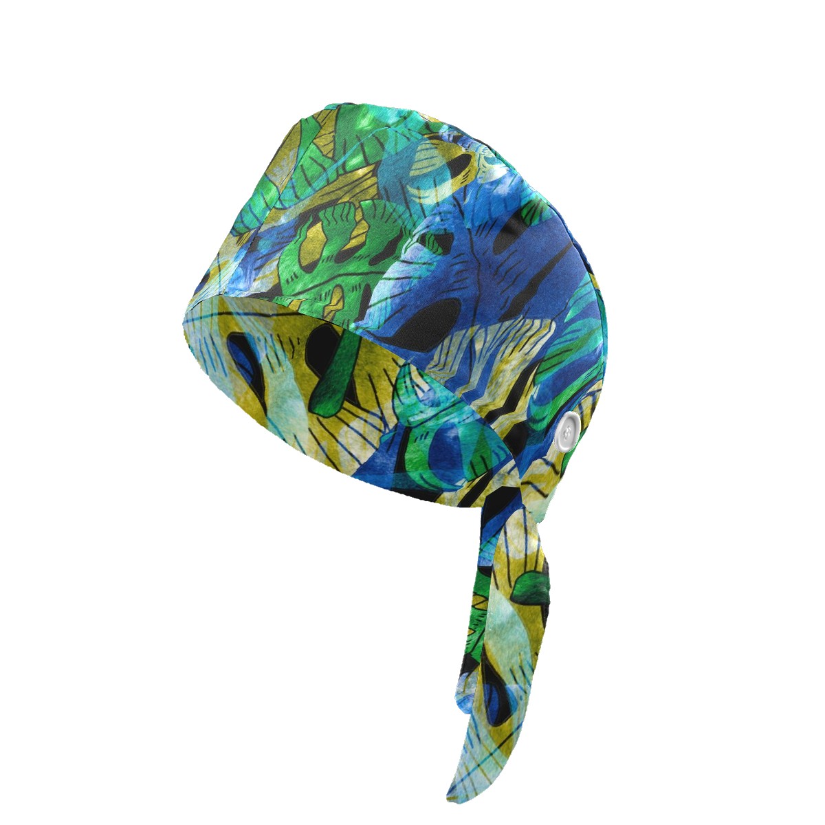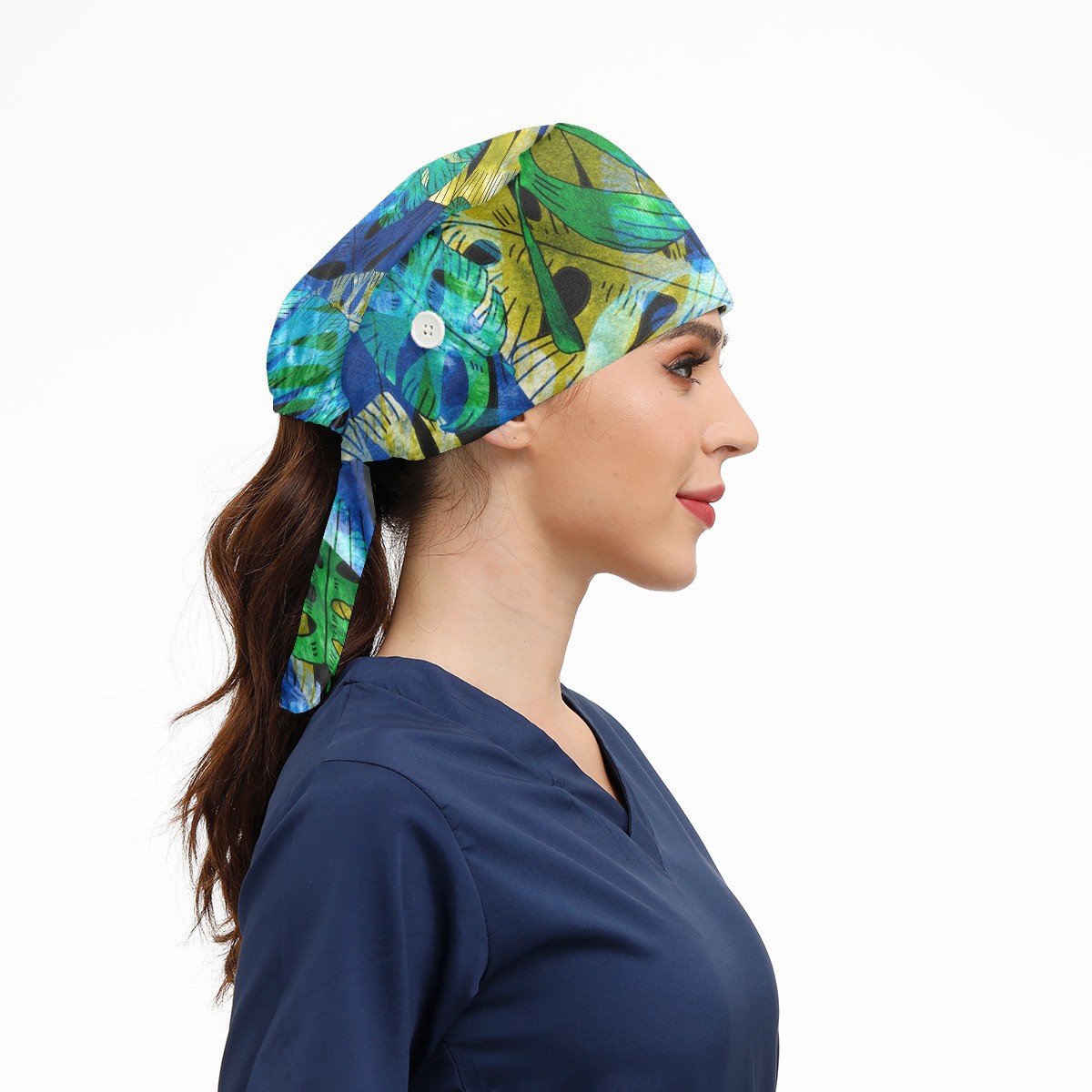 Working Caps with Button & Sweatband Satin Lined Cotton Adjustable Nurse Hats Elastic Band Scrub Cap Surgeon Hat Exotic Leaves