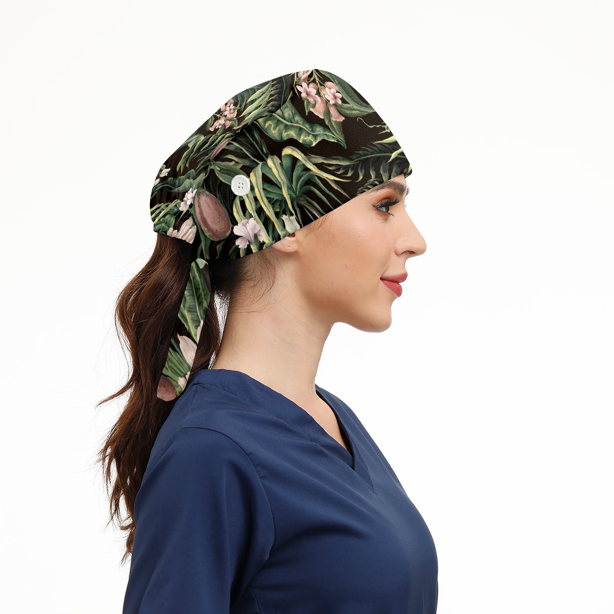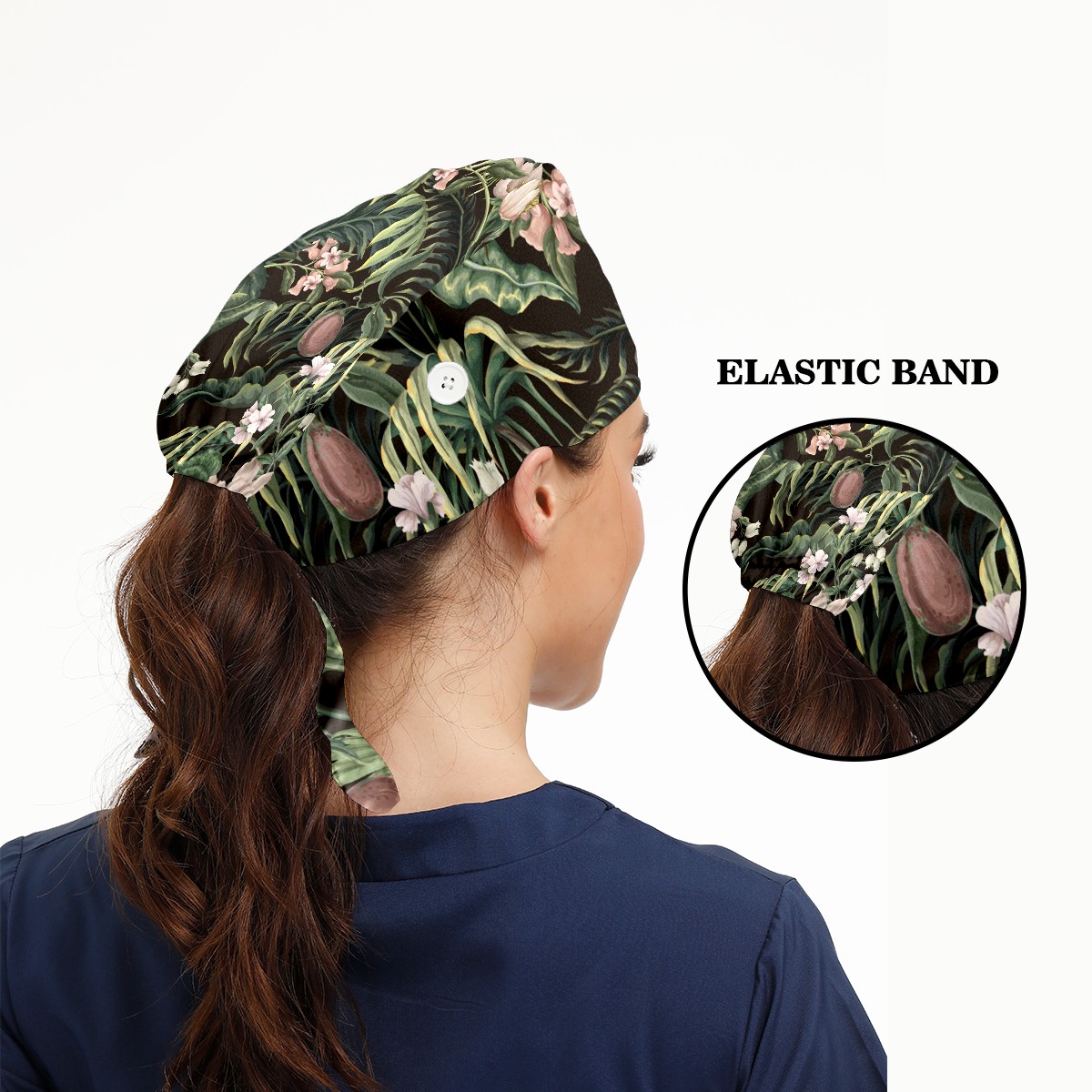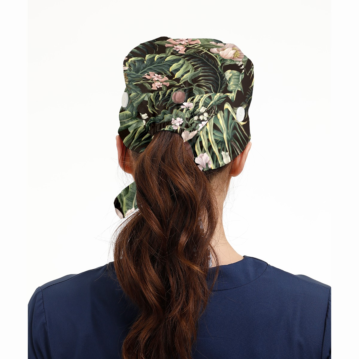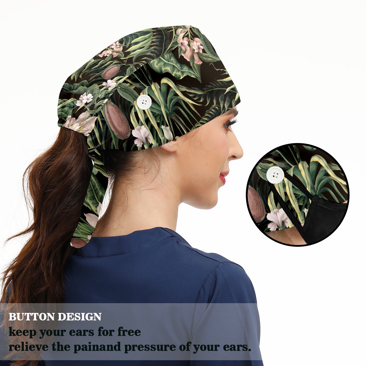 Working Caps with Button & Sweatband Satin Lined Cotton Adjustable Nurse Hats Elastic Band Scrub Cap Surgeon Hat Tropical Leaves Plants And Flowers