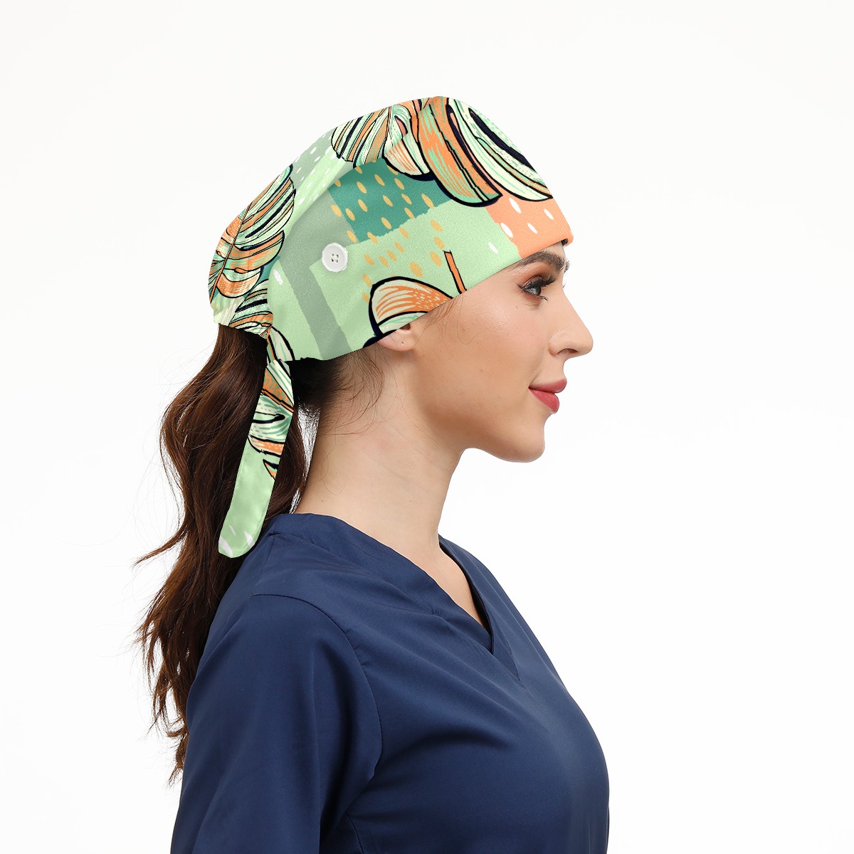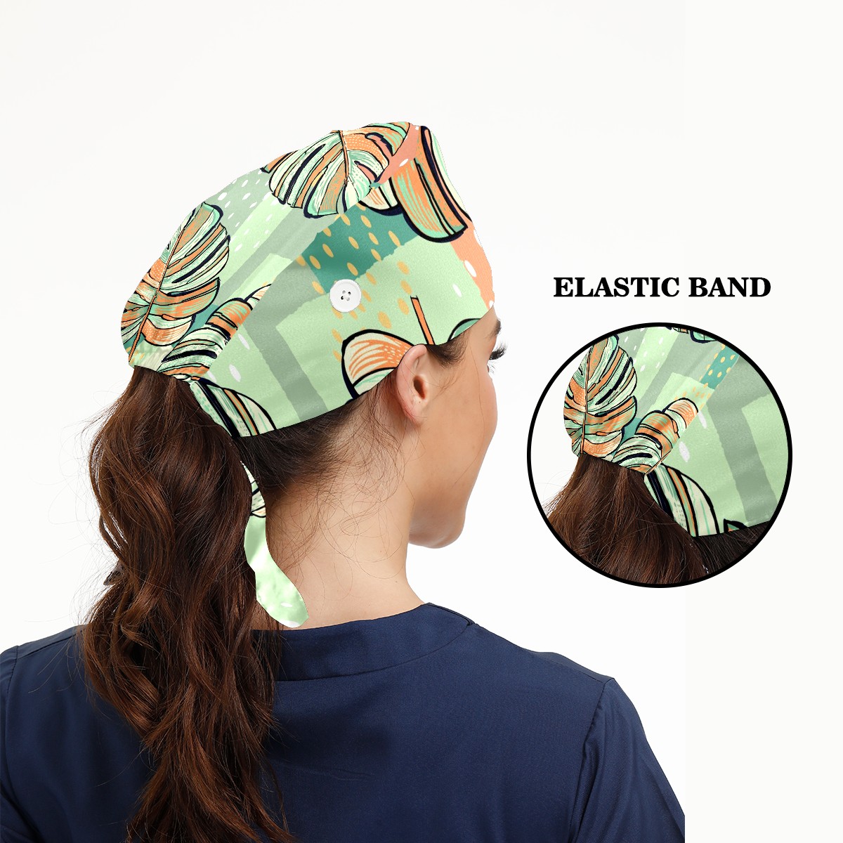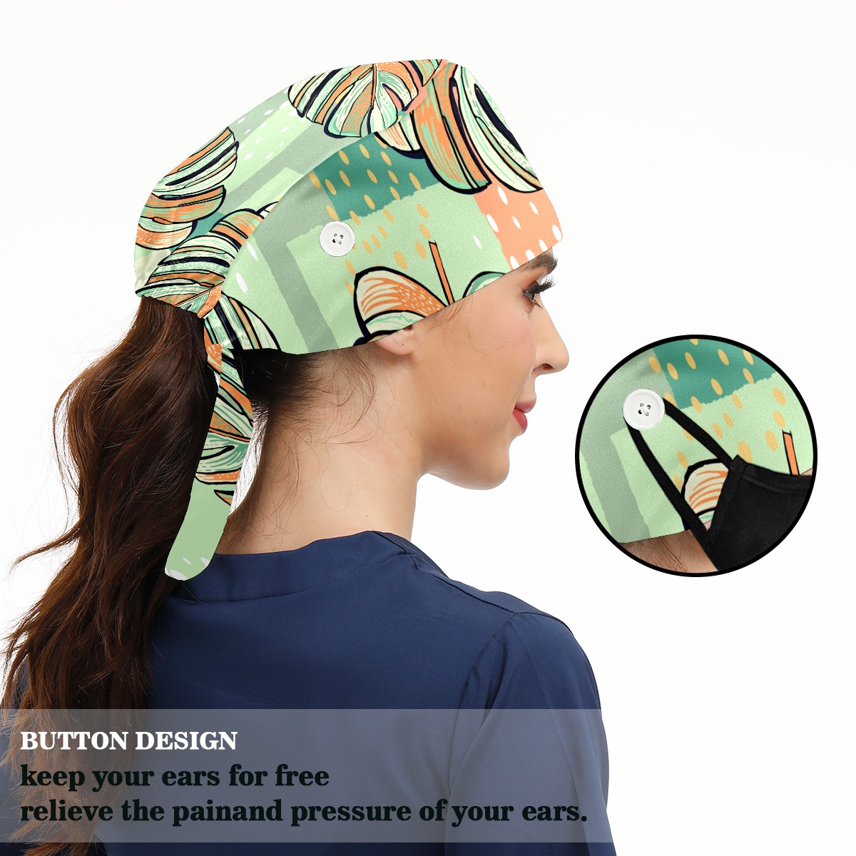 Working Caps with Button & Sweatband Satin Lined Cotton Adjustable Nurse Hats Elastic Band Scrub Cap Surgeon Hat Tropical Funny Monstera Leaf