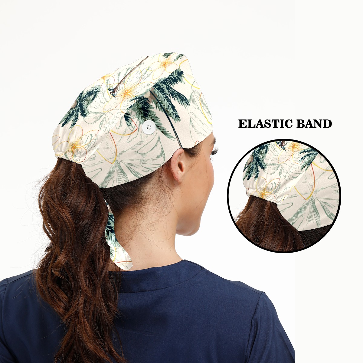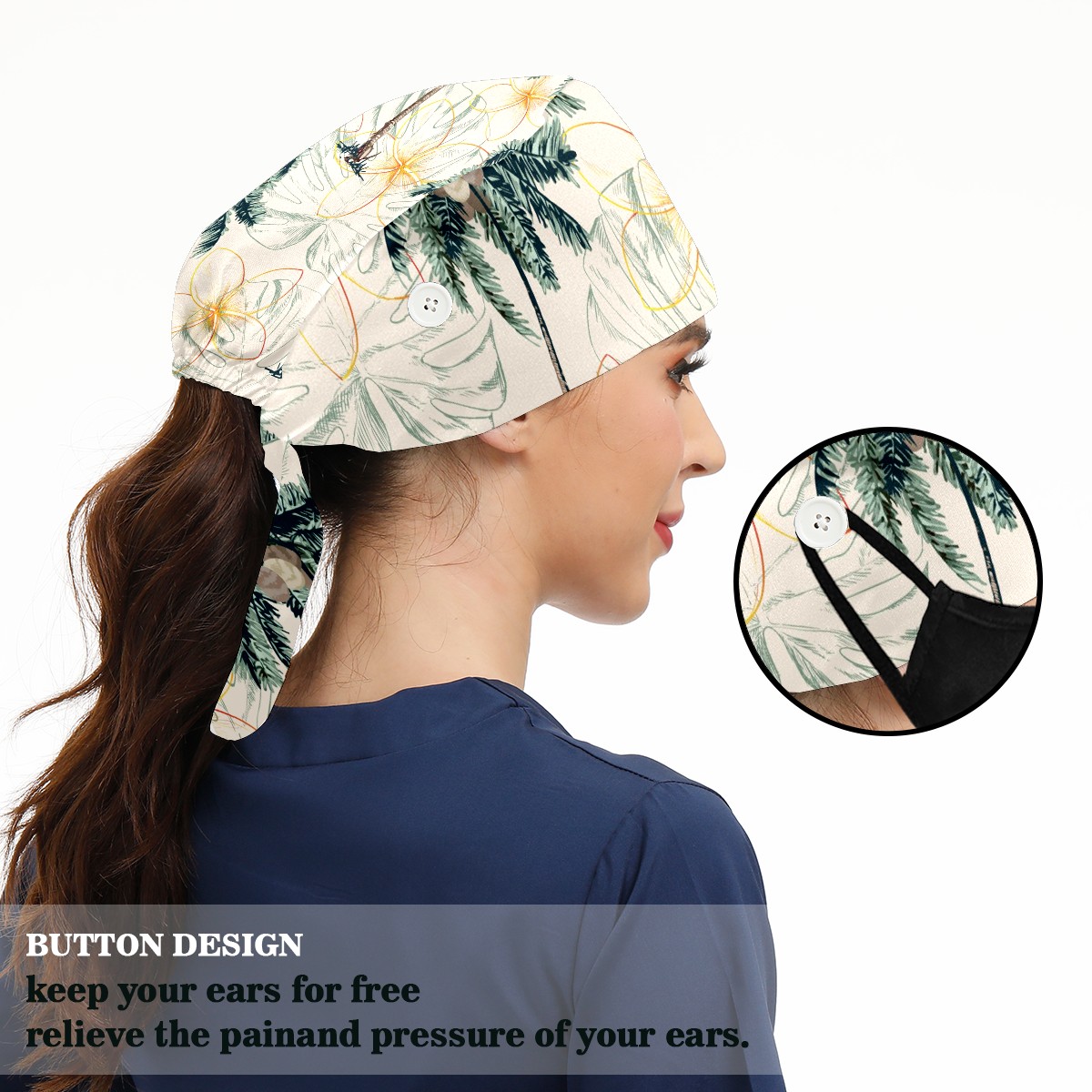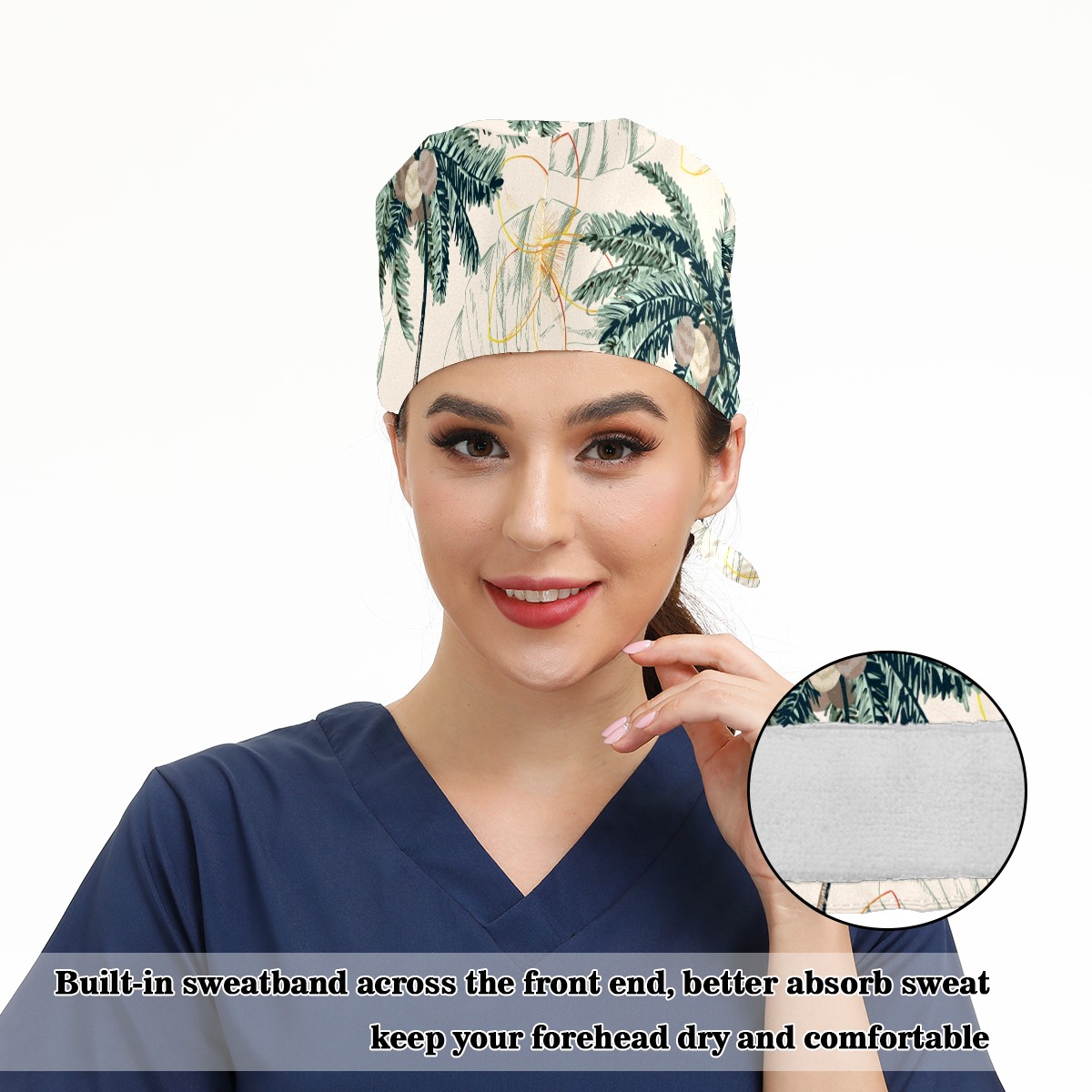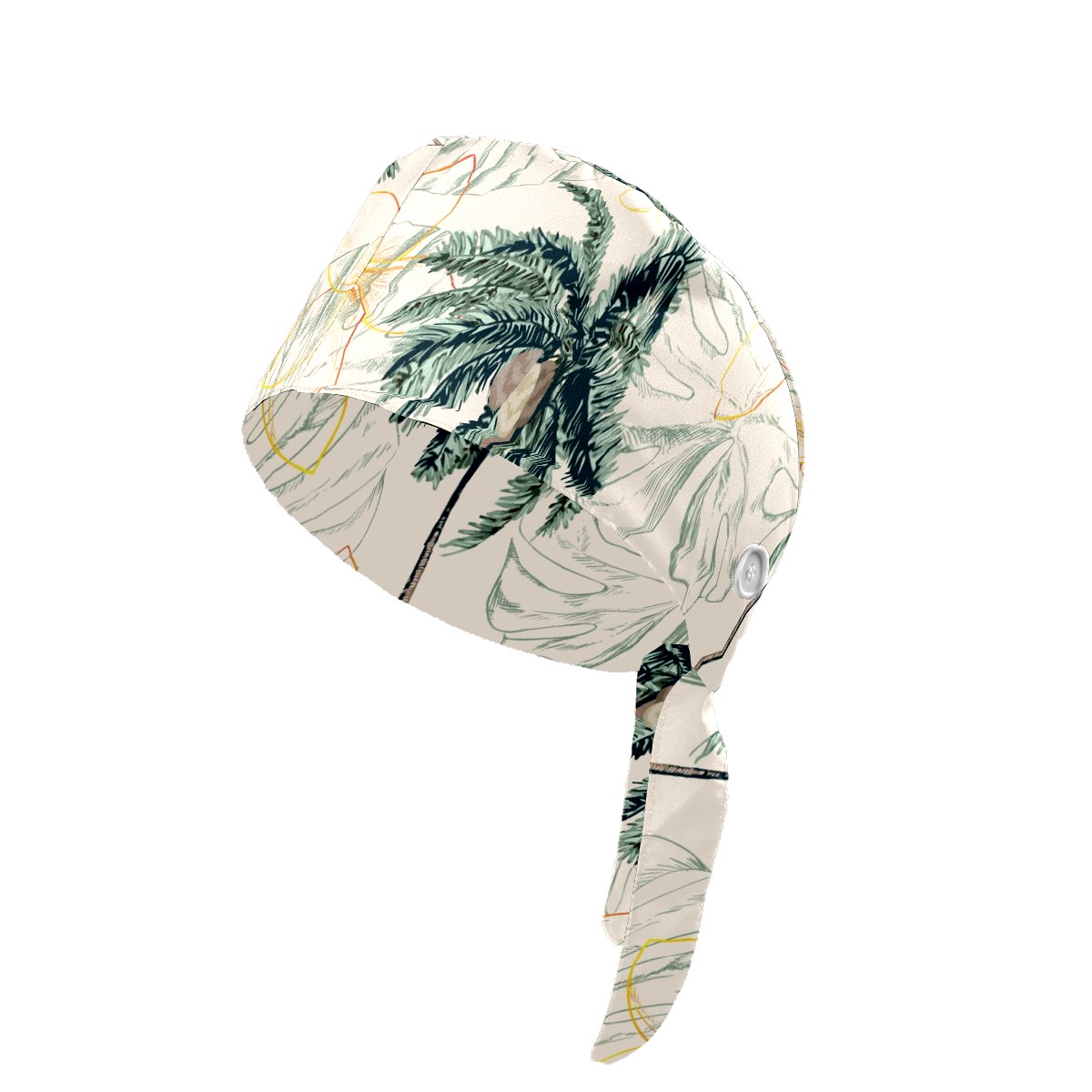 Working Caps with Button & Sweatband Satin Lined Cotton Adjustable Nurse Hats Elastic Band Scrub Cap Surgeon Hat Colorful Tropical Palm Tree