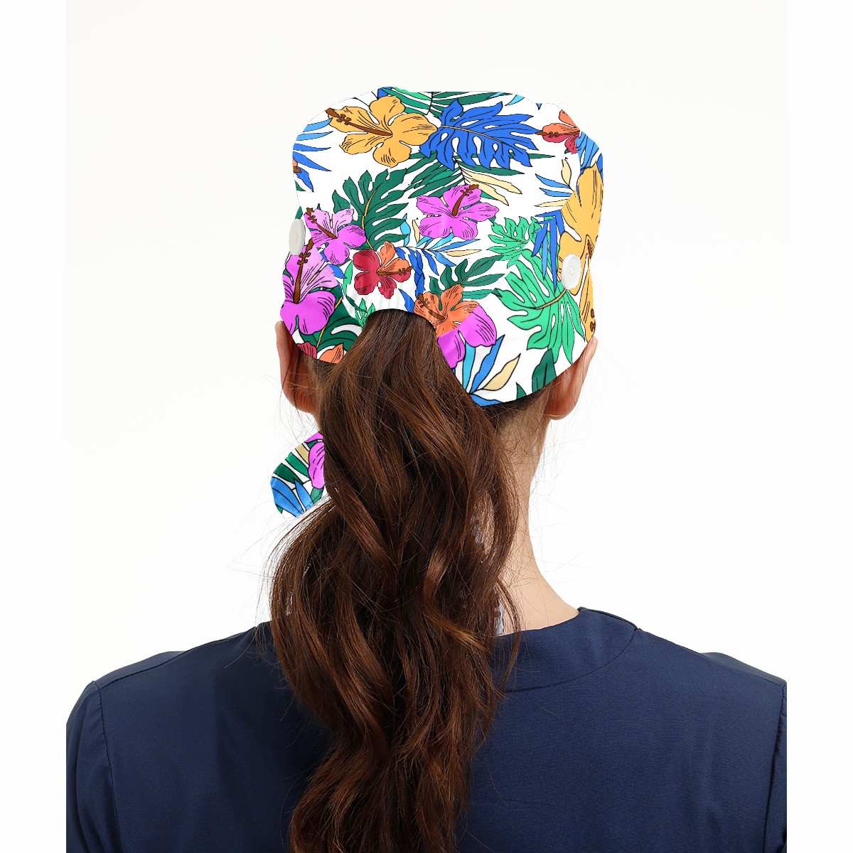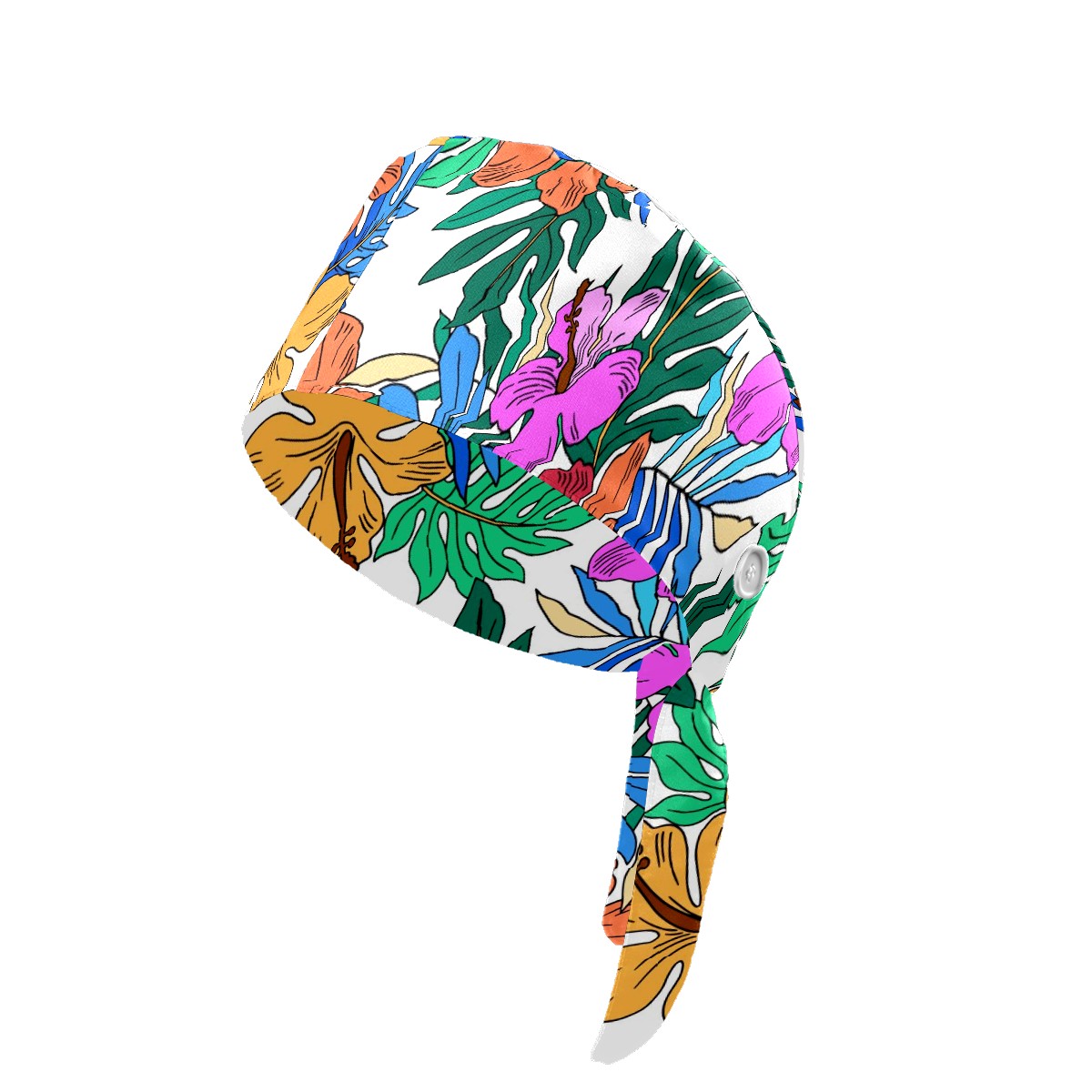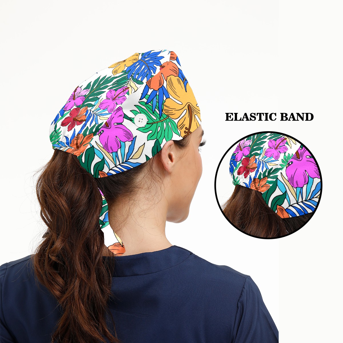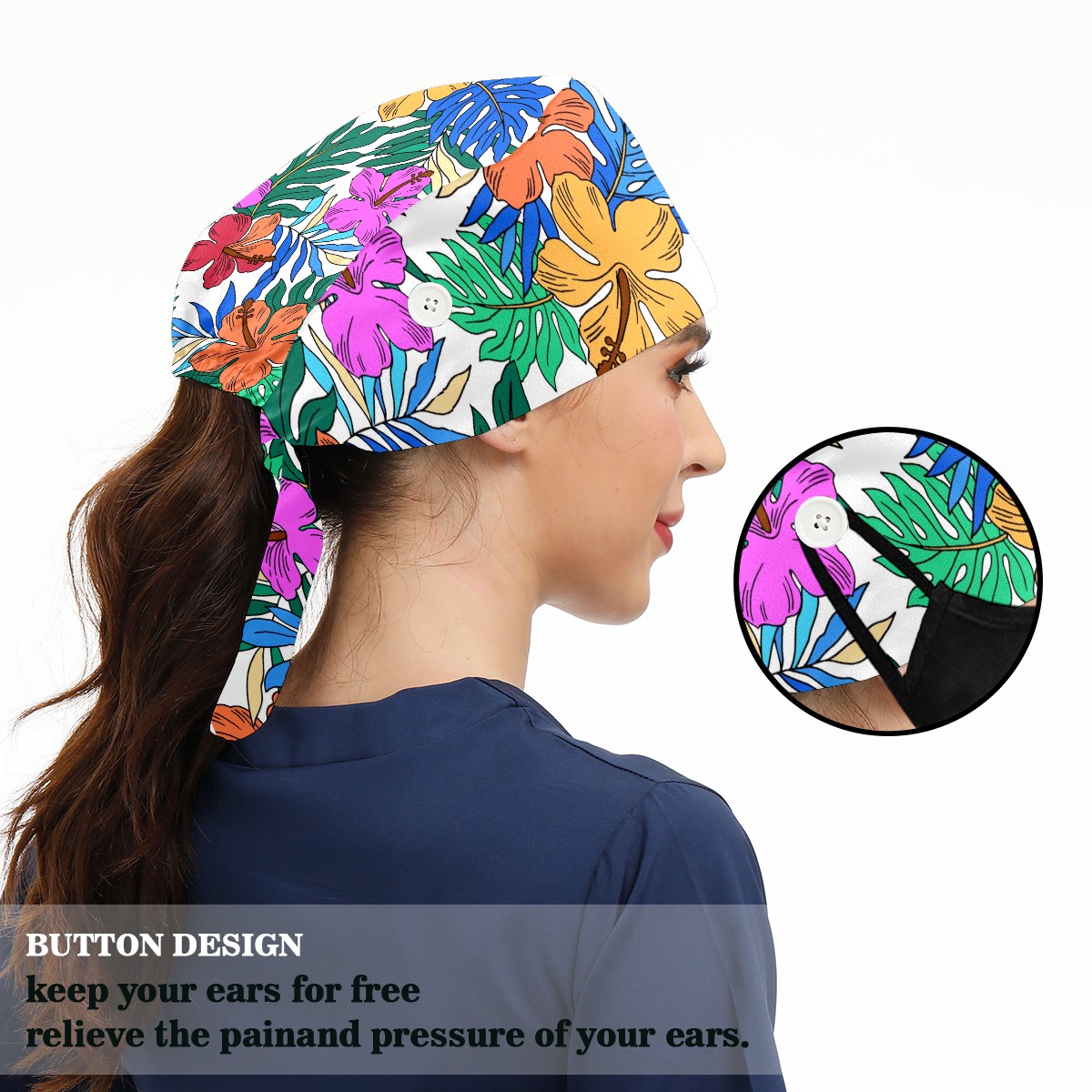 Working Caps with Button & Sweatband Satin Lined Cotton Adjustable Nurse Hats Elastic Band Scrub Cap Surgeon Hat Colorful Hibiscus Palm Leaves