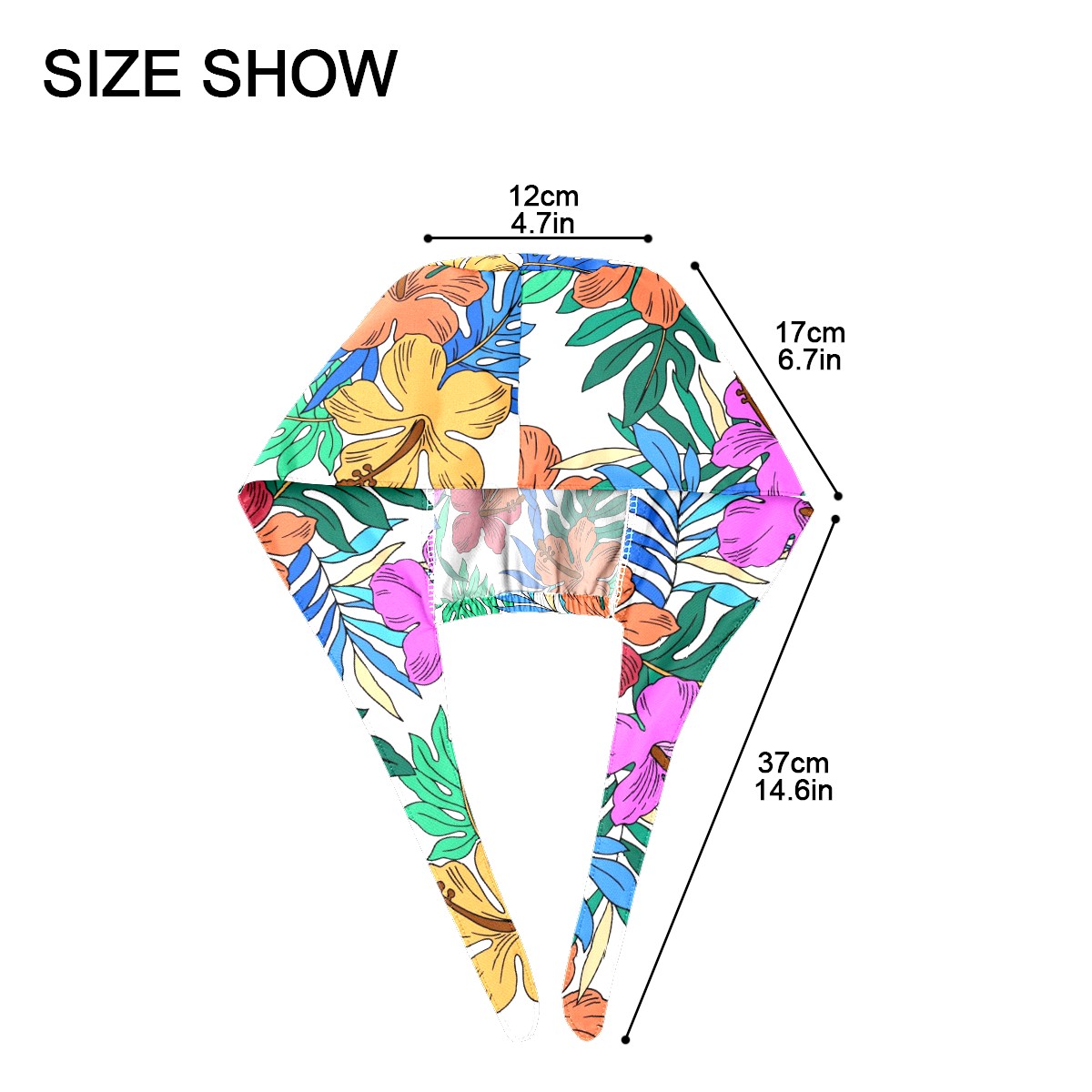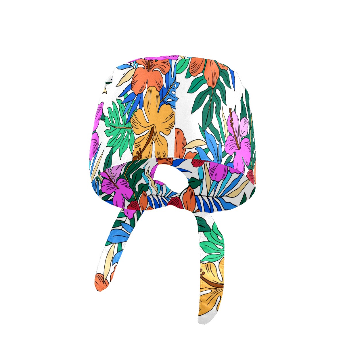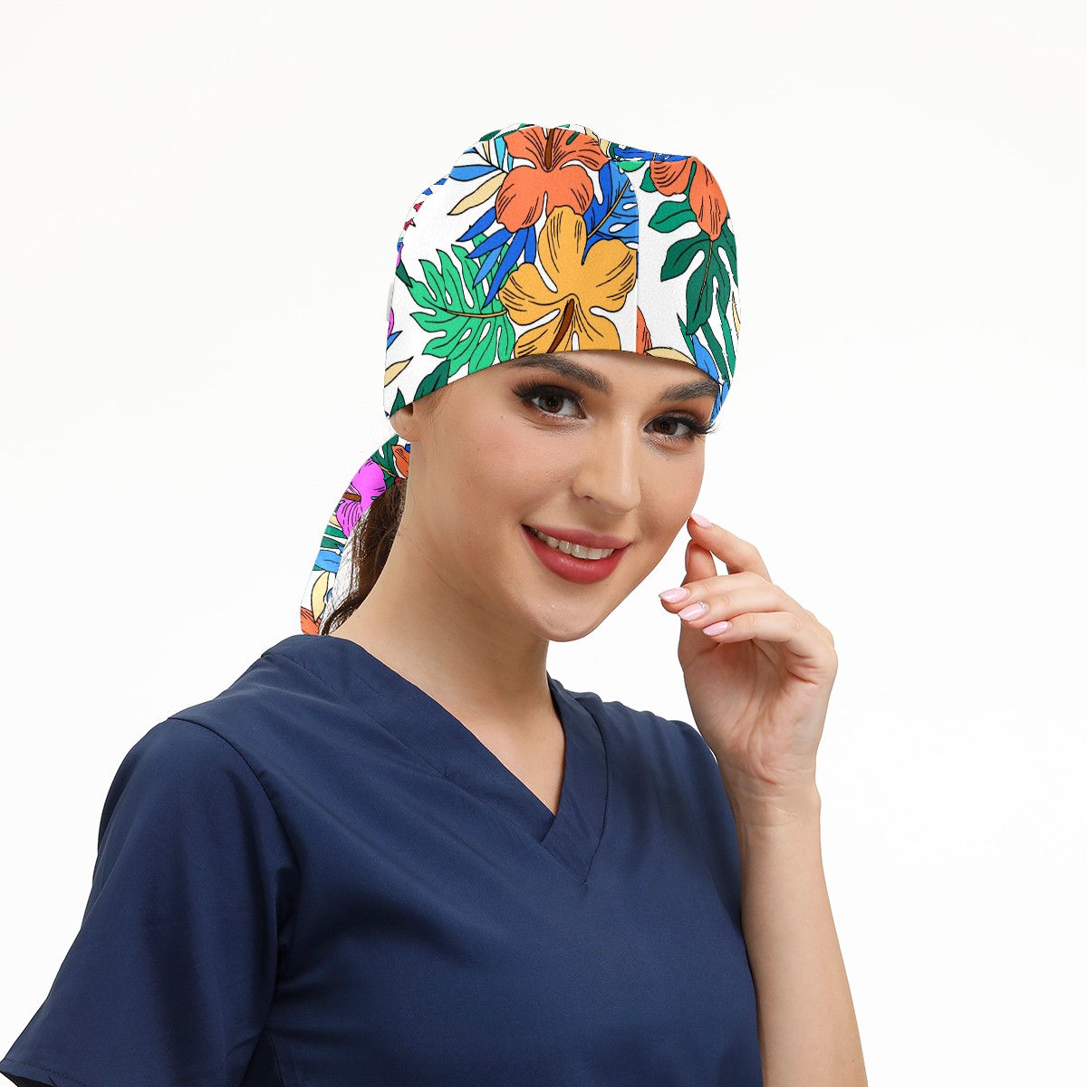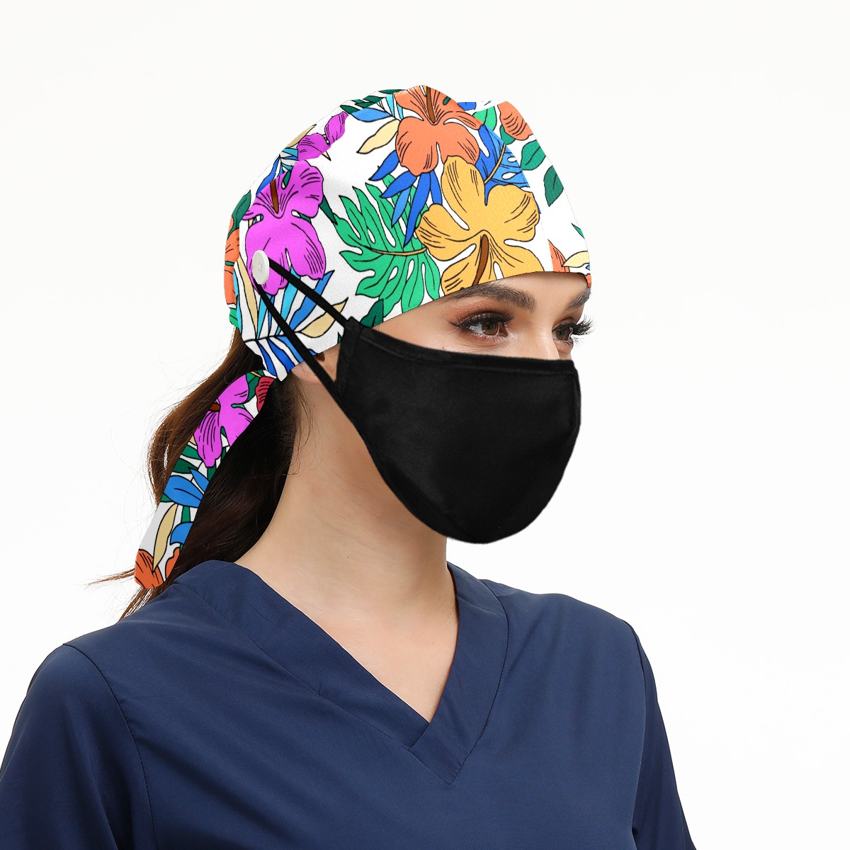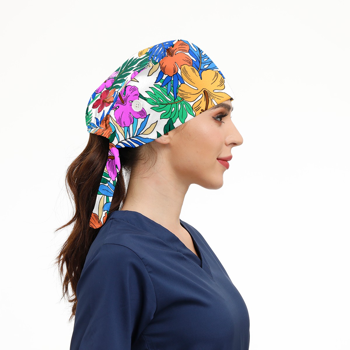Working Caps with Button & Sweatband Satin Lined Cotton Adjustable Nurse Hats Elastic Band Scrub Cap Surgeon Hat Colorful Hibiscus Palm Leaves