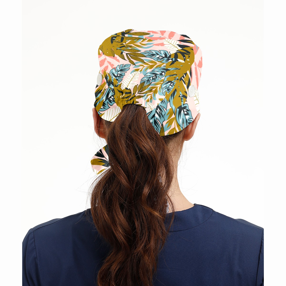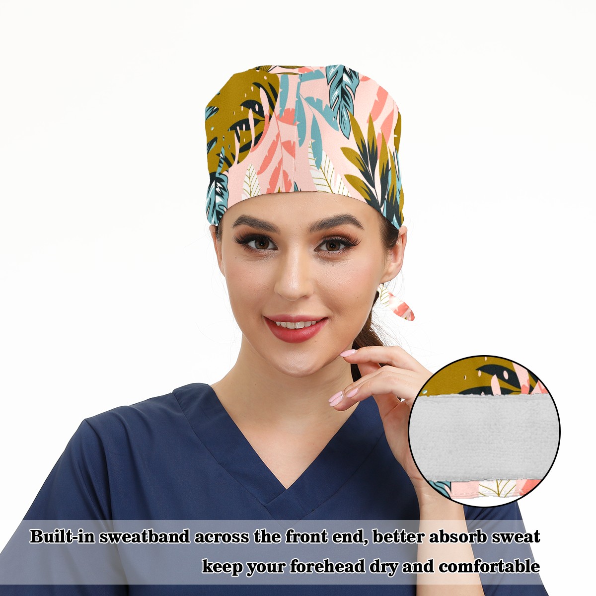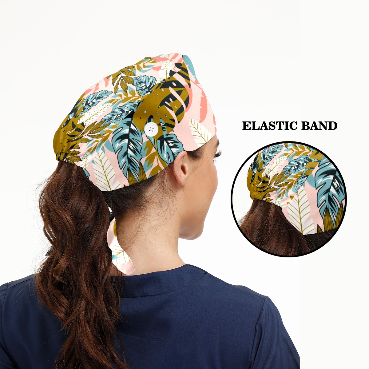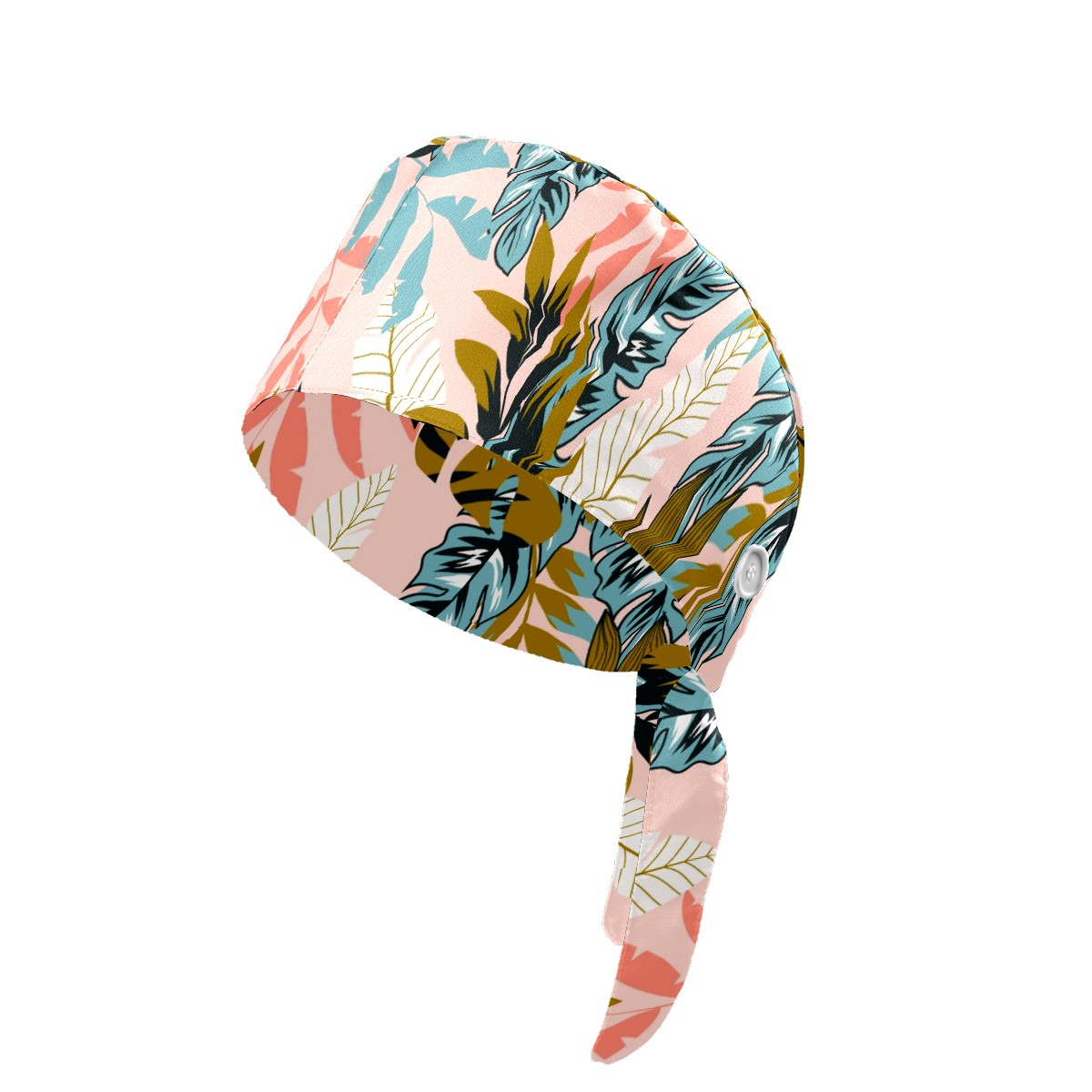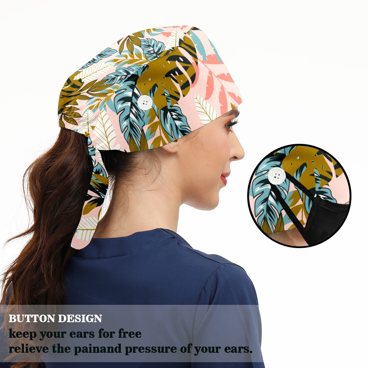 Working Caps with Button & Sweatband Satin Lined Cotton Adjustable Nurse Hats Elastic Band Scrub Cap Surgeon Hat Abstract Tropical Plants And Leaves