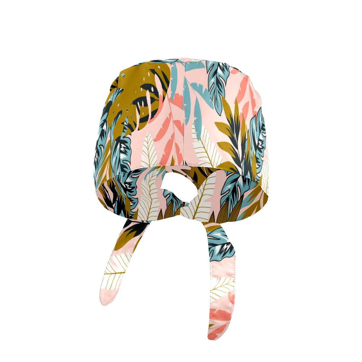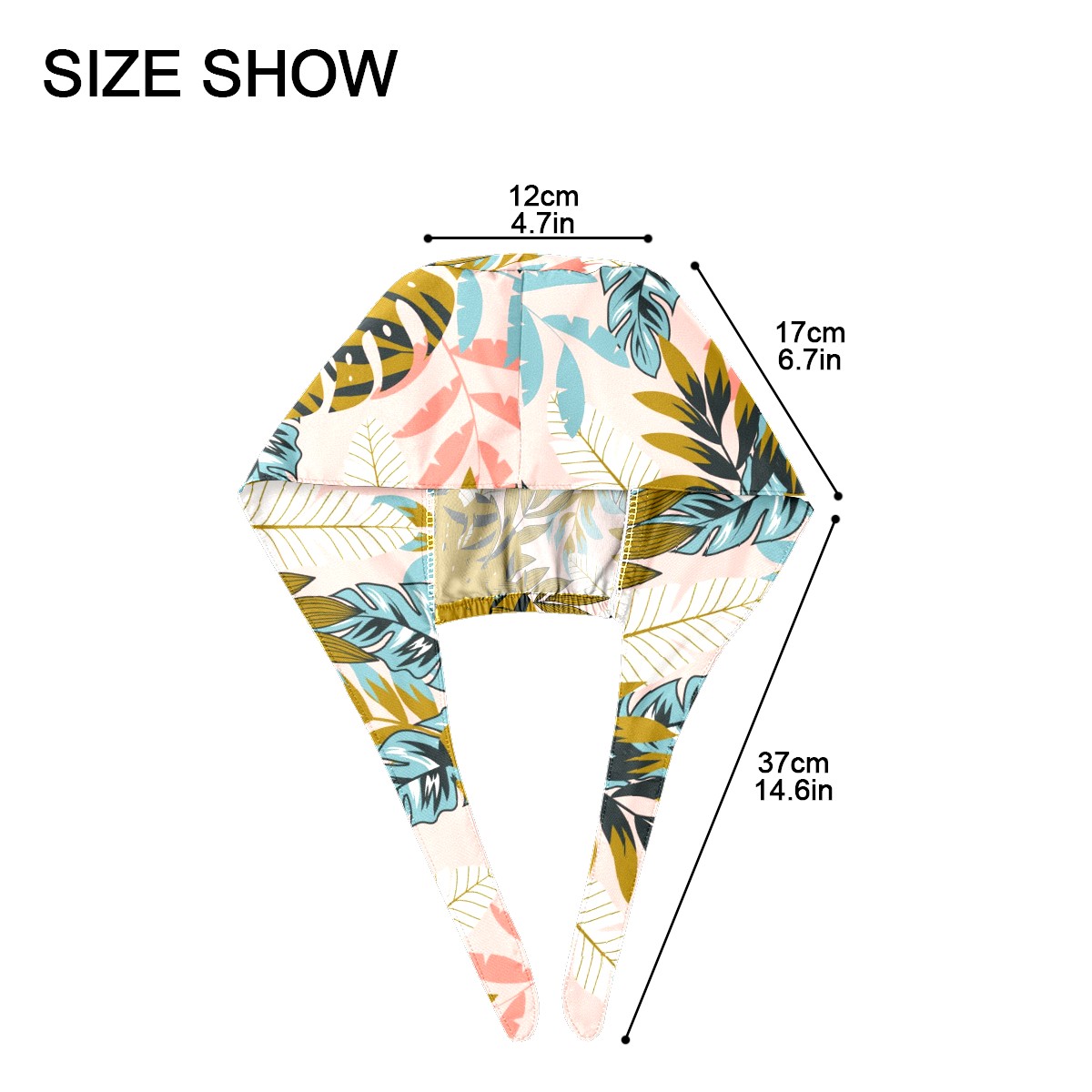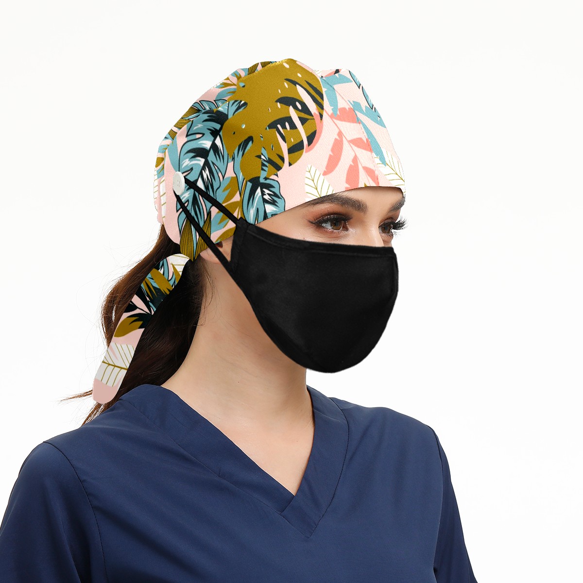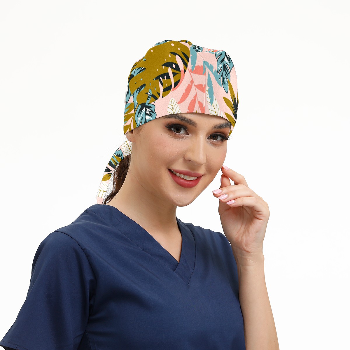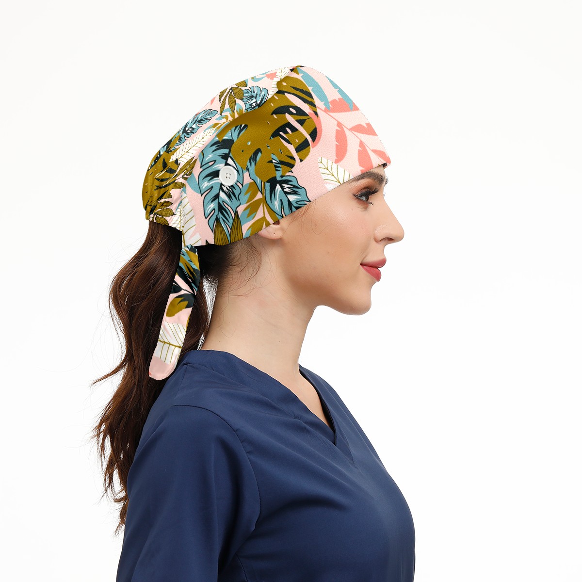 Working Caps with Button & Sweatband Satin Lined Cotton Adjustable Nurse Hats Elastic Band Scrub Cap Surgeon Hat Abstract Tropical Plants And Leaves