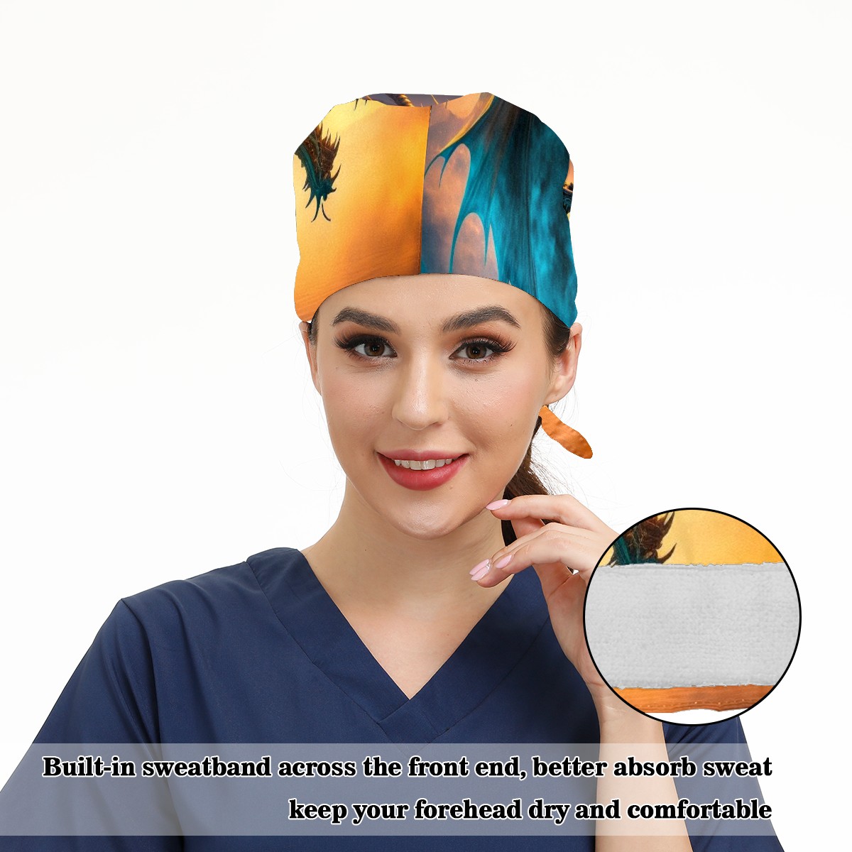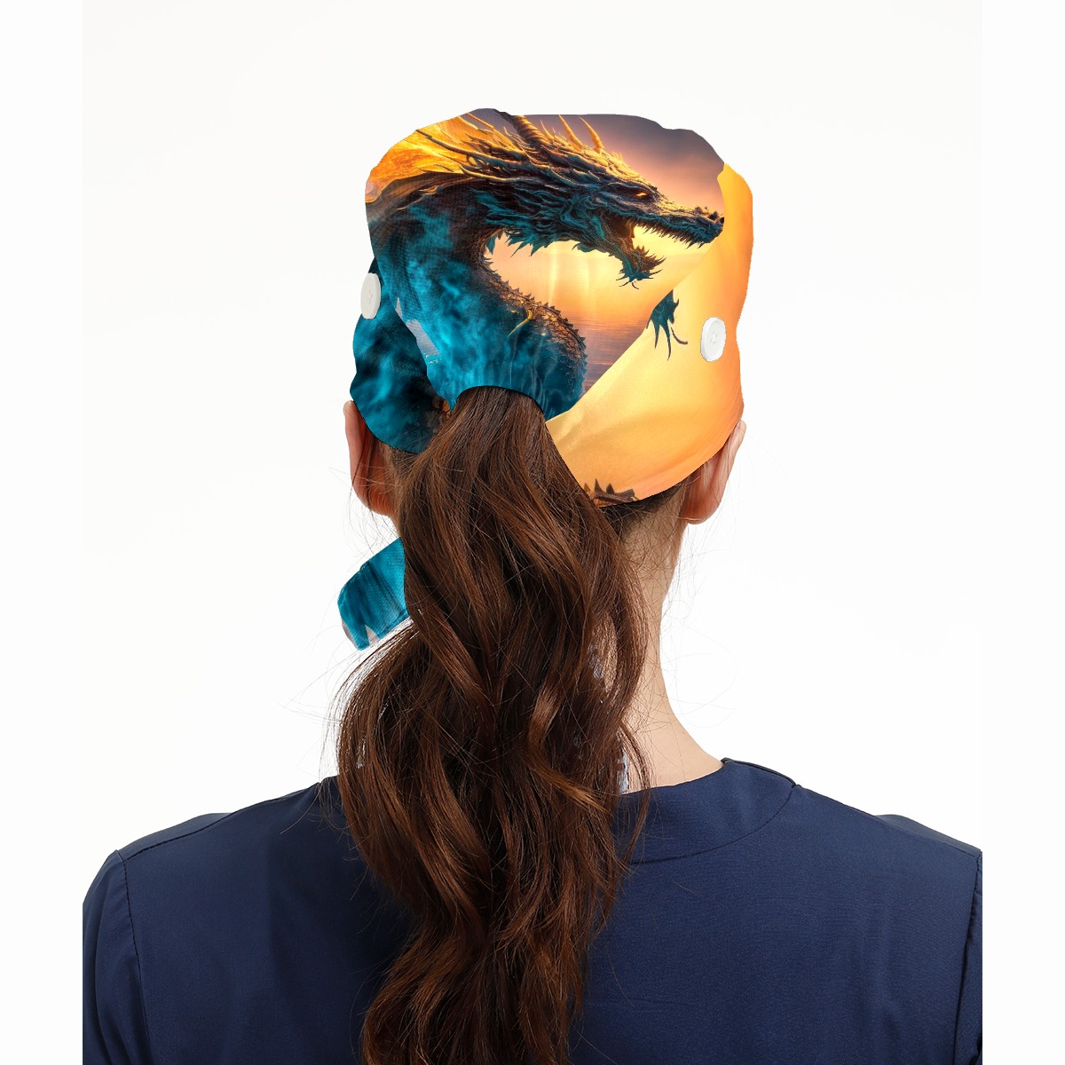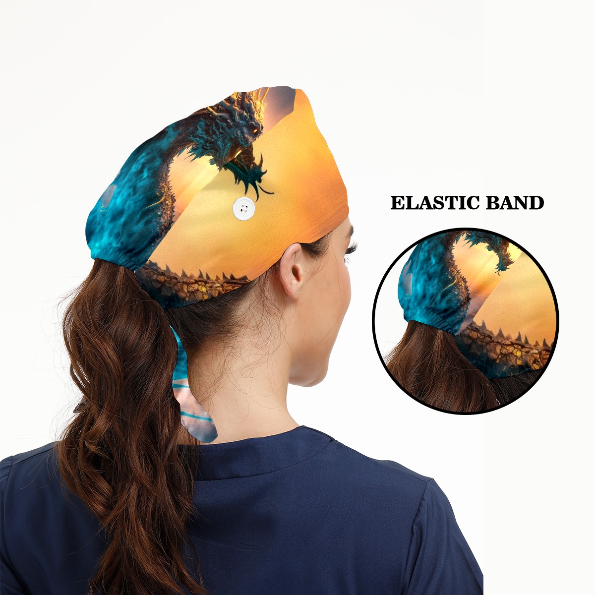 Working Caps with Button & Sweatband Satin Lined Cotton Adjustable Nurse Hats Elastic Band Scrub Cap Surgeon Hat Dragon In Colourful Glow And Mist
