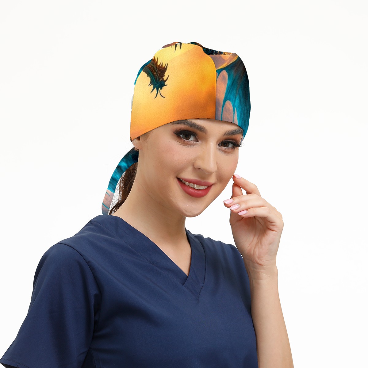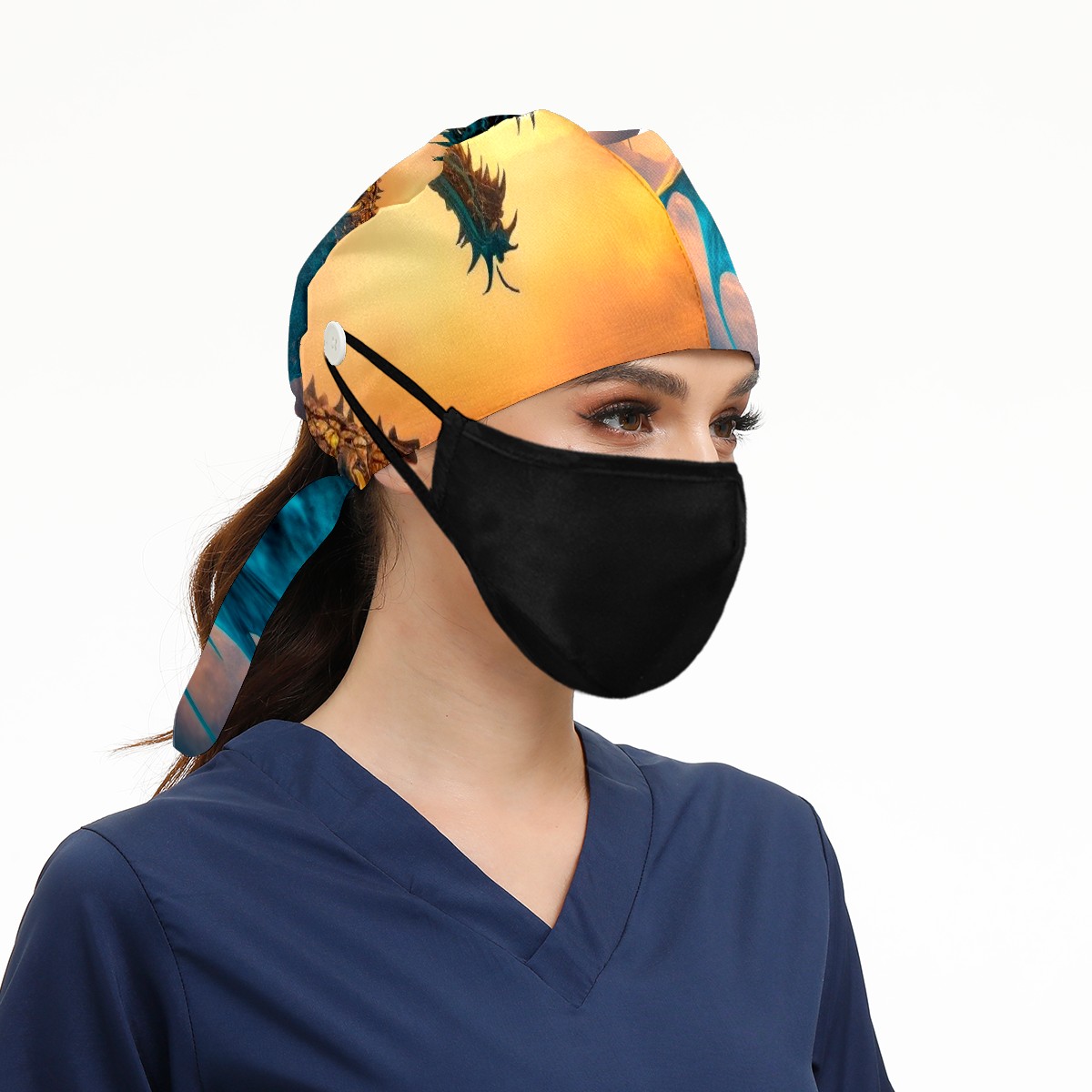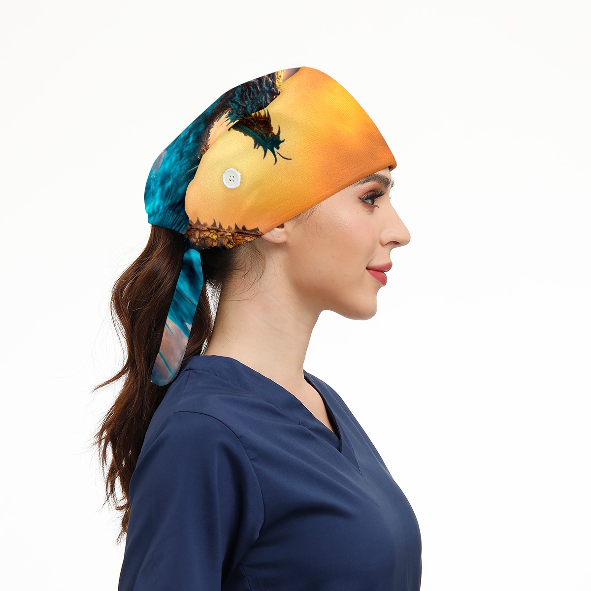 Working Caps with Button & Sweatband Satin Lined Cotton Adjustable Nurse Hats Elastic Band Scrub Cap Surgeon Hat Dragon In Colourful Glow And Mist