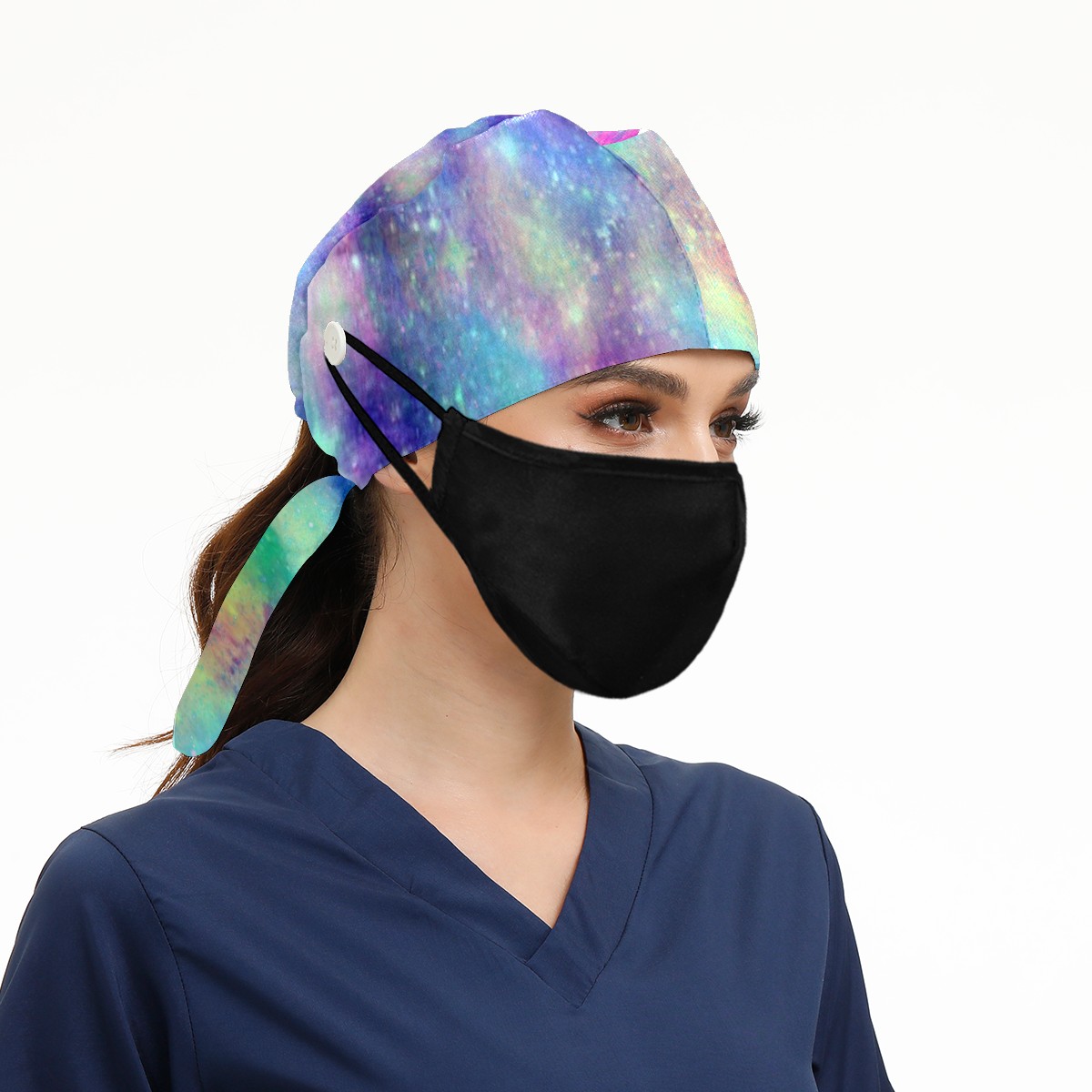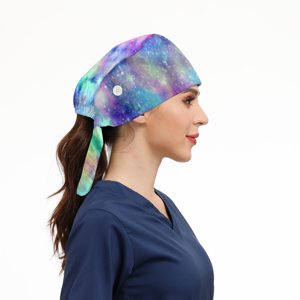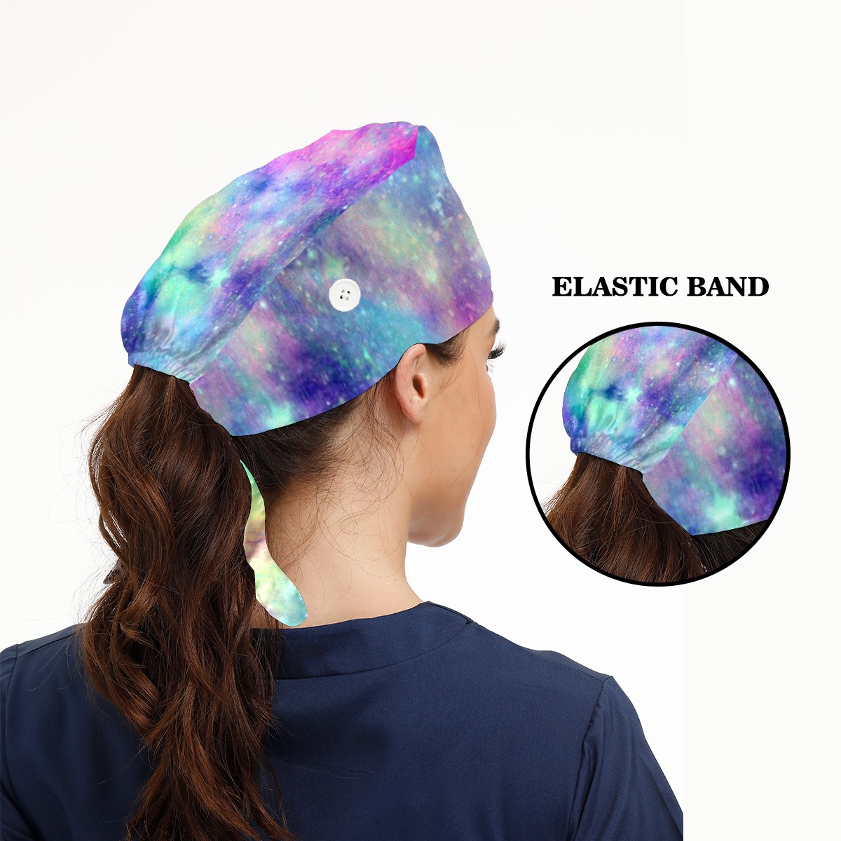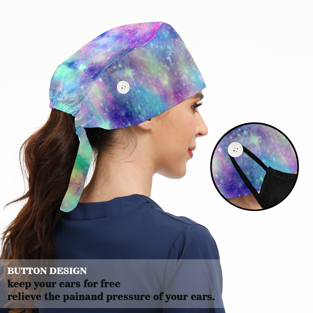 Working Caps with Button & Sweatband Satin Lined Cotton Adjustable Nurse Hats Elastic Band Scrub Cap Surgeon Hat Colorful Galaxy Universe Stars