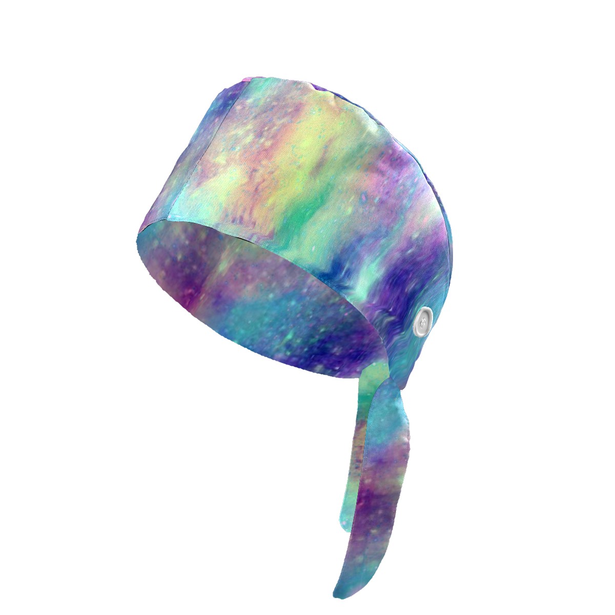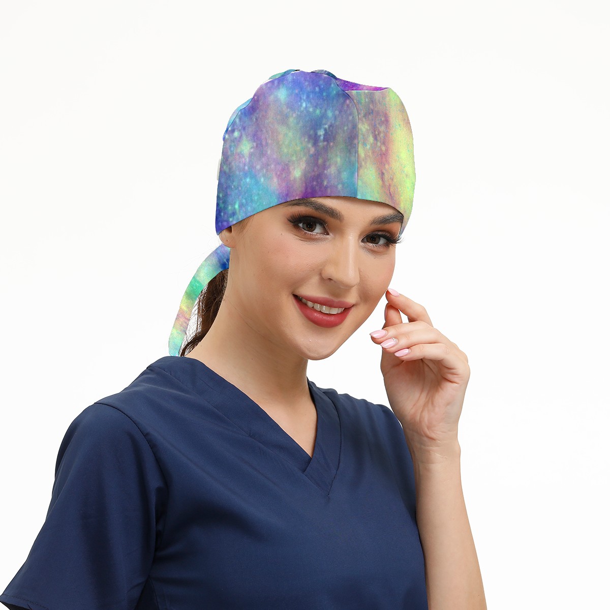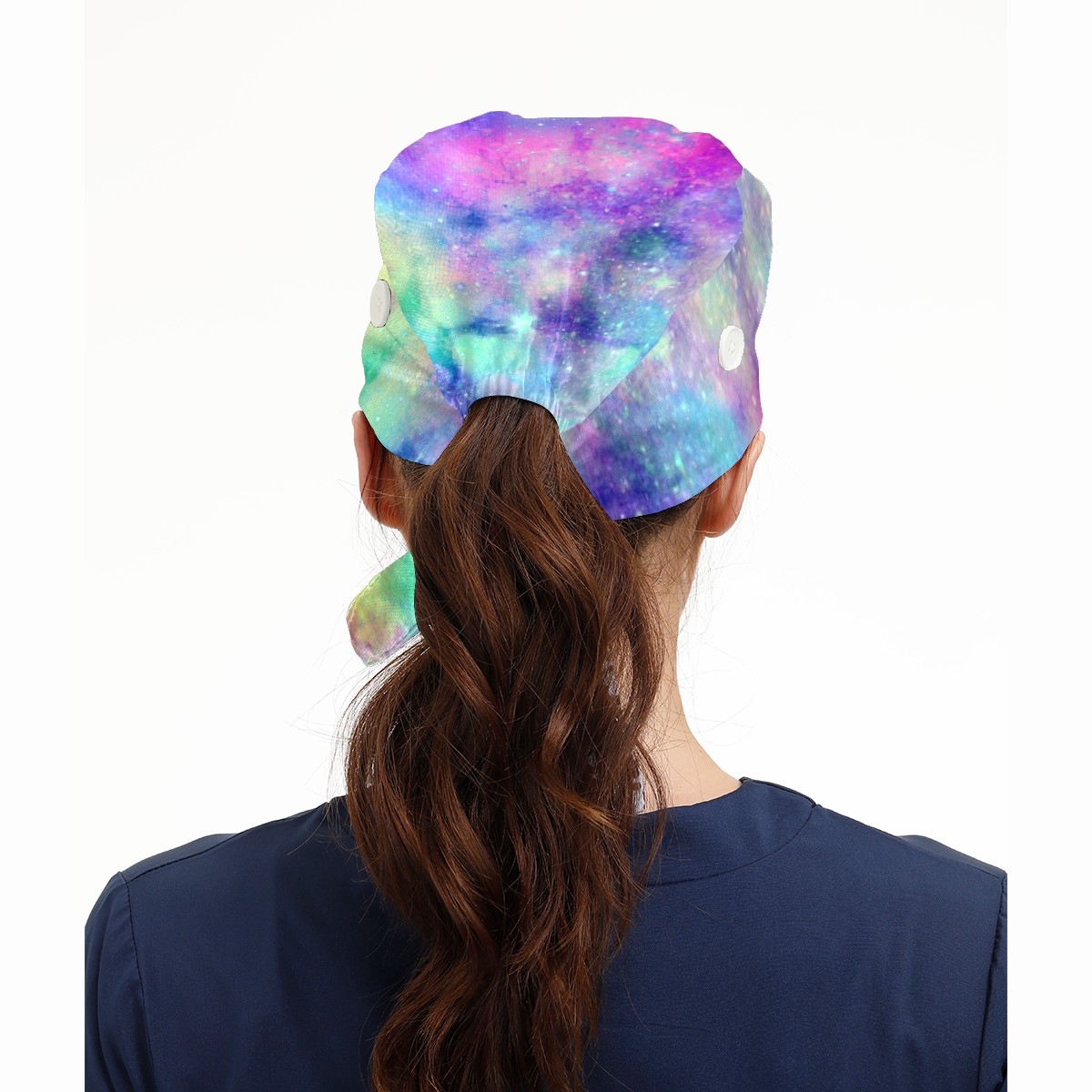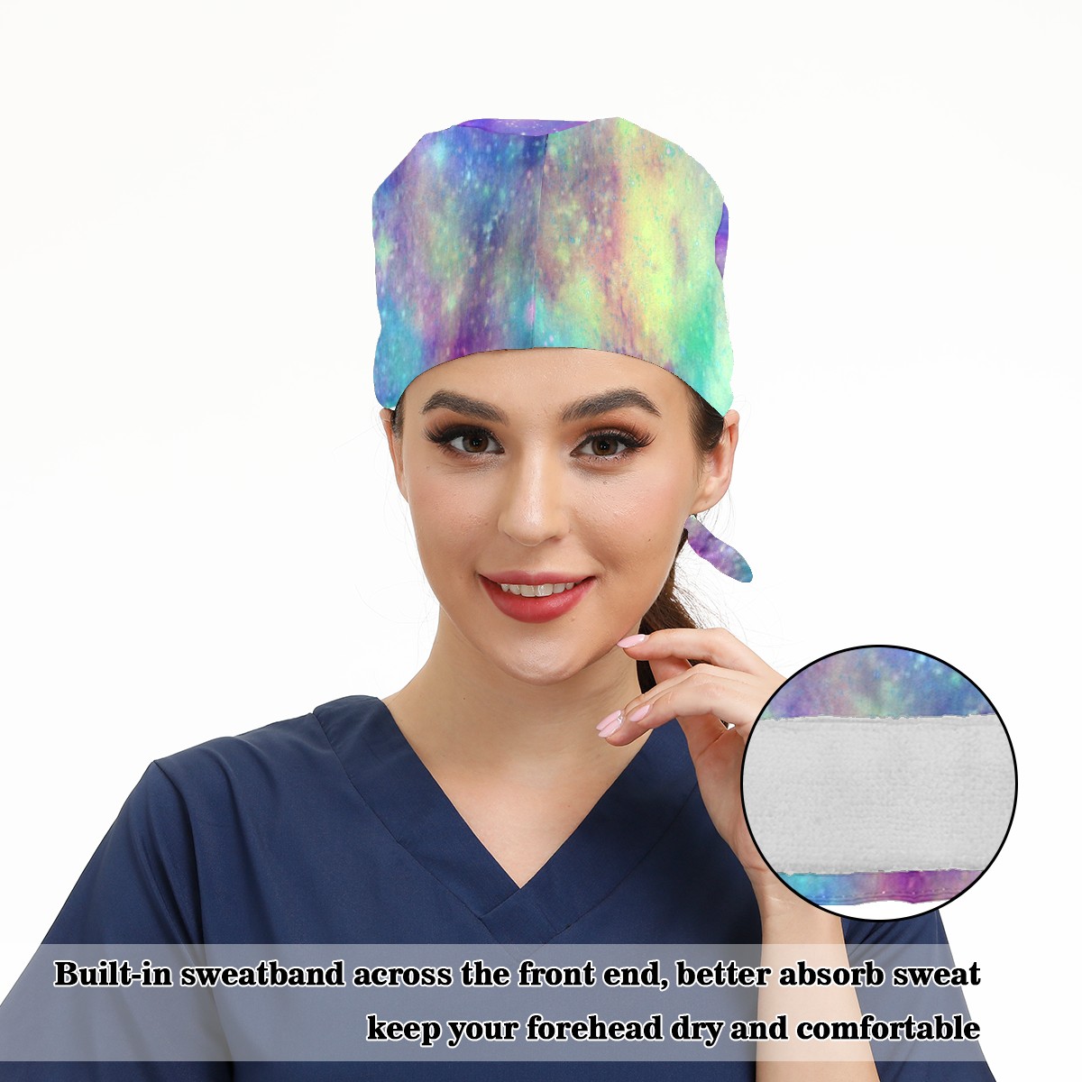 Working Caps with Button & Sweatband Satin Lined Cotton Adjustable Nurse Hats Elastic Band Scrub Cap Surgeon Hat Colorful Galaxy Universe Stars