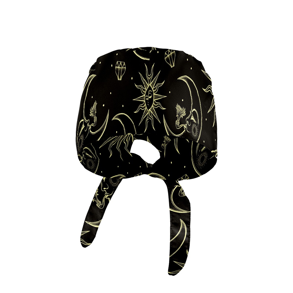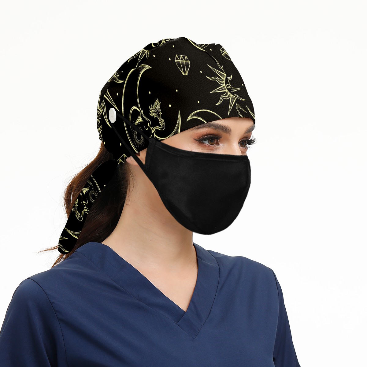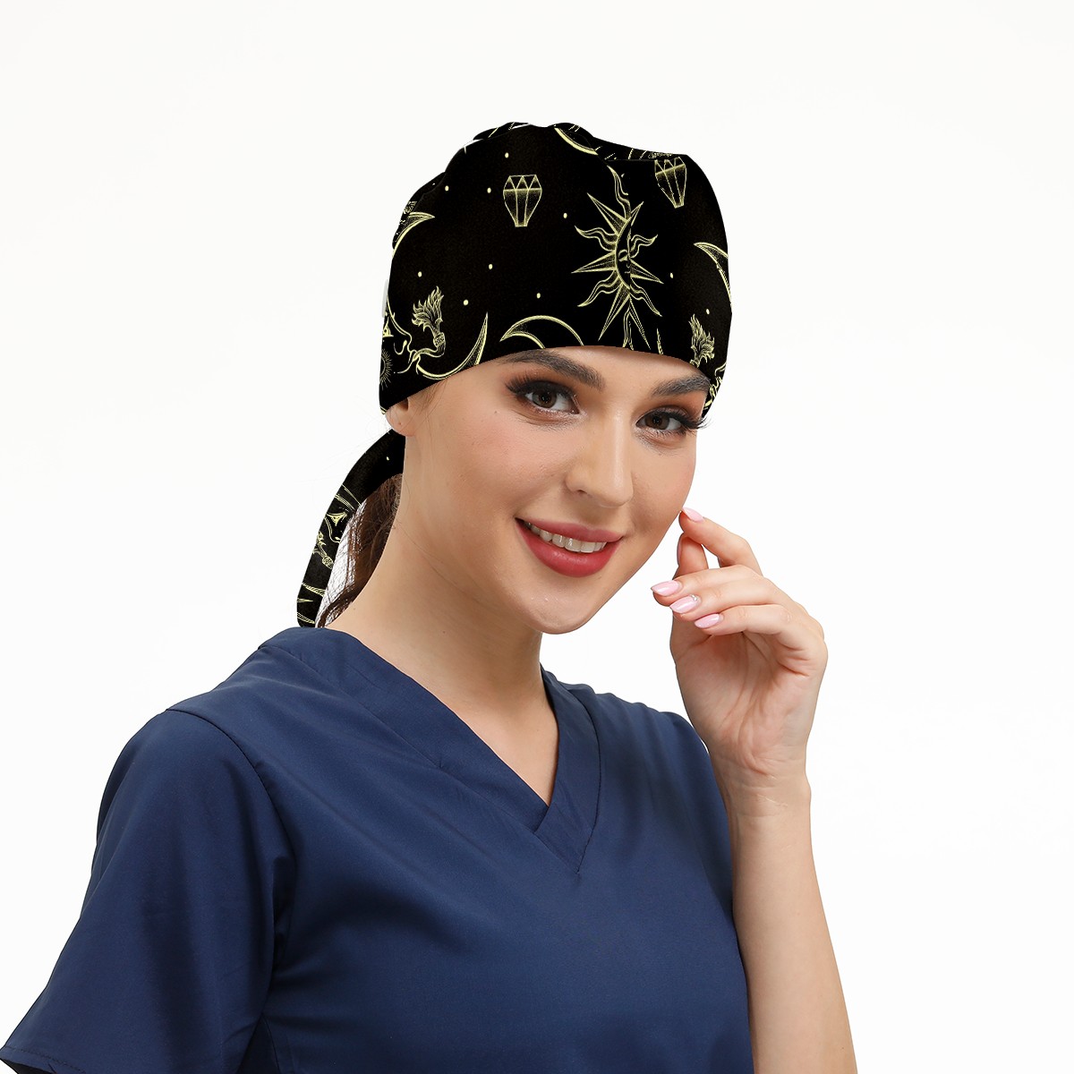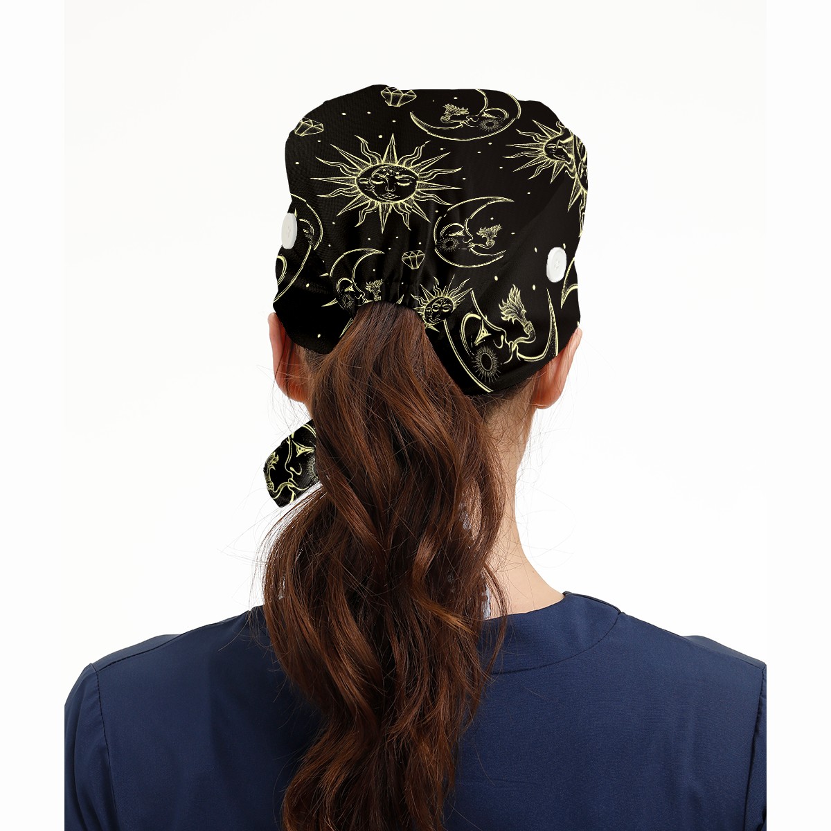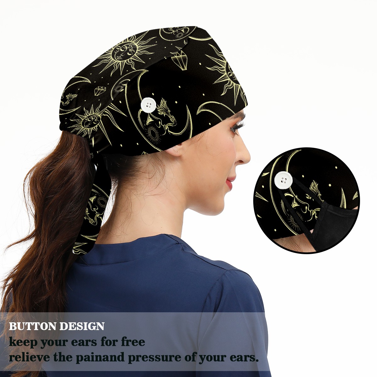 Working Caps with Button & Sweatband Satin Lined Cotton Adjustable Nurse Hats Elastic Band Scrub Cap Surgeon Hat Vintage Gold Sun Moon Stars